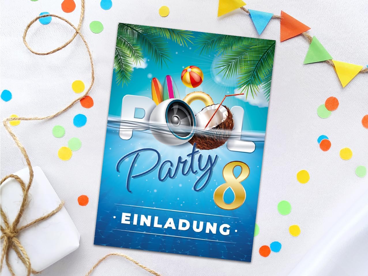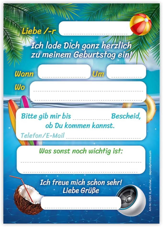 Contenuto: 12 biglietti d'invito Pratico: gli inviti sono moderni e progettati con molti dettagli. Sul retro troverete i campi prestampati da compilare. Dimensioni: i biglietti d'invito sono molto stabili, hanno formato DIN A6 (10,50 cm x 14,80 cm), stampa di alta qualità 300 g/m² e sono rivestiti con vernice UV per la finitura. Occasioni: i biglietti di invito sono molto adatti per una festa di compleanno o una festa di compleanno. È possibile utilizzare questi biglietti anche come inviti per battesimo, festa a tema, feste al cinema o feste in piscina. HAI BISOGNO DI UN ALTRO NUMERO? : da noi troverete questi graziosi inviti anche in set da 6, 8 o 10 pezzi. Altri motivi: nel nostro negozio troverete anche molti altri motivi di inviti, come lama, cavalli, calcio, cinema, piscina, bowling, salto. Prodotto in Germania: i biglietti sono stati prodotti in una tipografia tedesca.