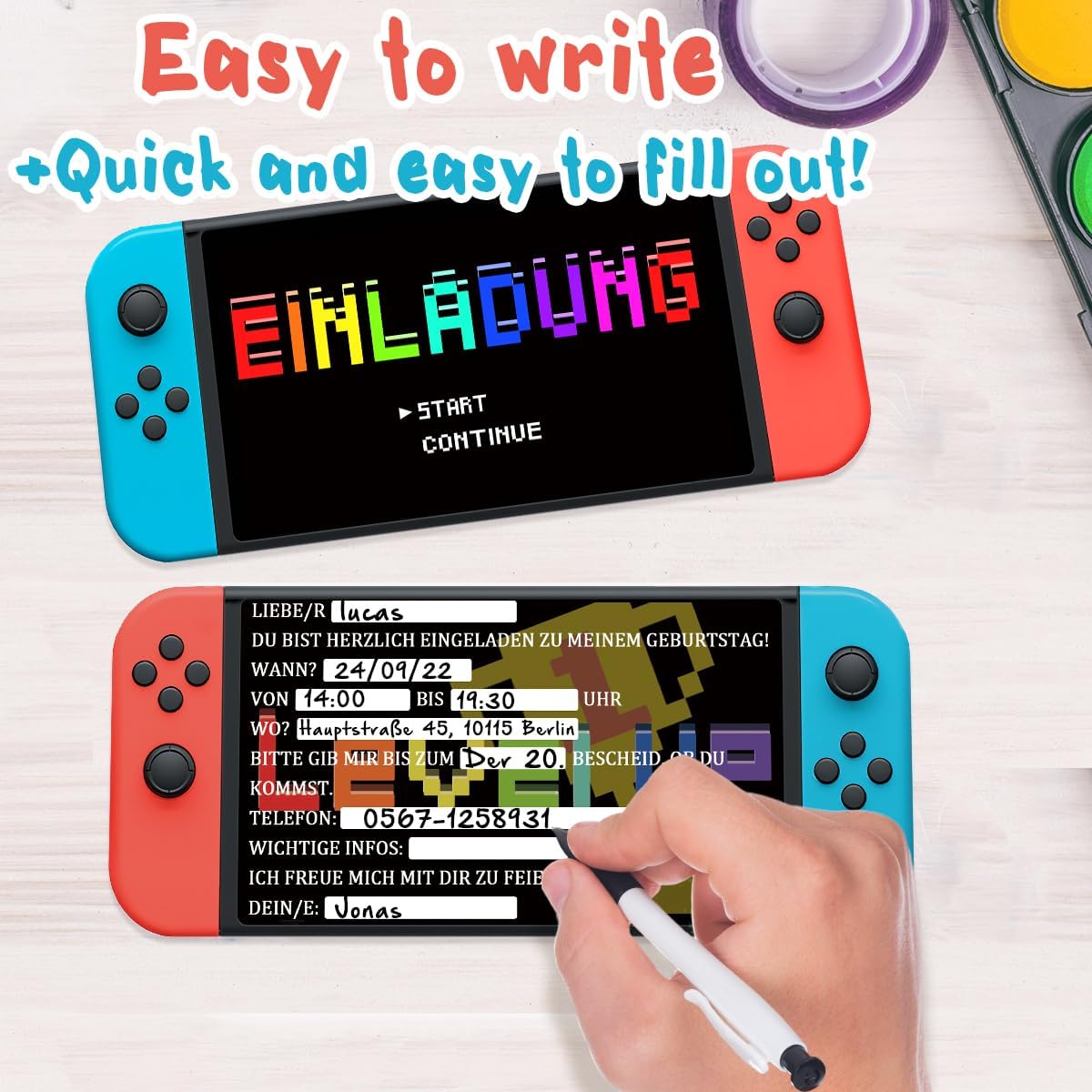 Set di biglietti d'invito per giocatori: il prodotto non contiene solo 12 biglietti d'invito invitanti per feste di compleanno per bambini e bambine nel formato 18,5x8 cm, ma è molto facile scrivere i biglietti sul retro. il che semplifica l'invio e la presentazione degli inviti. 【Facile da compilare】 Gli inviti sono facili da compilare. Offri spazio sufficiente per tutte le informazioni importanti. Registra i dettagli del tuo evento in un attimo. Personalizza ogni invito per presentare con eleganza tutte le informazioni necessarie. 【Qualità eccellente】 I biglietti d'invito sono realizzati con carta robusta e di alta qualità e presentano una stampa di alta qualità, colori vivaci e dettagli nitidi. Bello e durevole. 【Design unico】 Gli inviti di compleanno per ragazzi e ragazze sono splendidamente progettati con una grafica vivace. Pensato per le feste di videogiochi, sia per ragazze che per ragazzi, feste di compleanno di bambini e ragazzi, ma anche per feste di videogiochi. 【Ampiamente utilizzabile】Biglietti d'invito per compleanni di bambini, ragazzi e ragazze, adatti per un compleanno, una festa di compleanno per bambini, una festa a tema, una festa per console di gioco, una festa per videogiochi o altra festa.