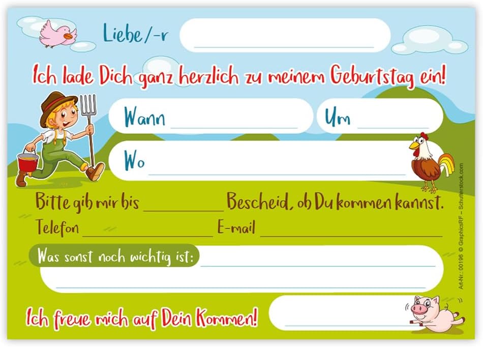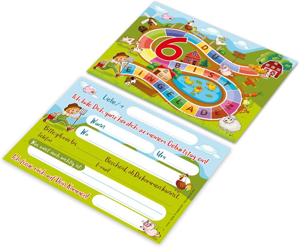 Contenuto: 12 biglietti d'invito Pratico: gli inviti sono moderni e progettati con molti dettagli. Sul retro troverete i campi prestampati da compilare. Dimensioni: i biglietti d'invito sono molto stabili, hanno formato DIN A6 (10,50 cm x 14,80 cm), stampa di alta qualità 300 g/m² e sono rivestiti con vernice UV per la finitura. Occasione: il set per feste è ideale per feste di compleanno. HAI BISOGNO DI UN ALTRO NUMERO? : da noi troverete questi graziosi inviti anche in set da 6, 8 o 10 pezzi. Altri motivi: nel nostro negozio troverete anche molti altri motivi di inviti, come lama, cavalli, calcio, cinema laser, bowling, jump. Prodotto in Germania: i biglietti sono stati prodotti in una tipografia tedesca.