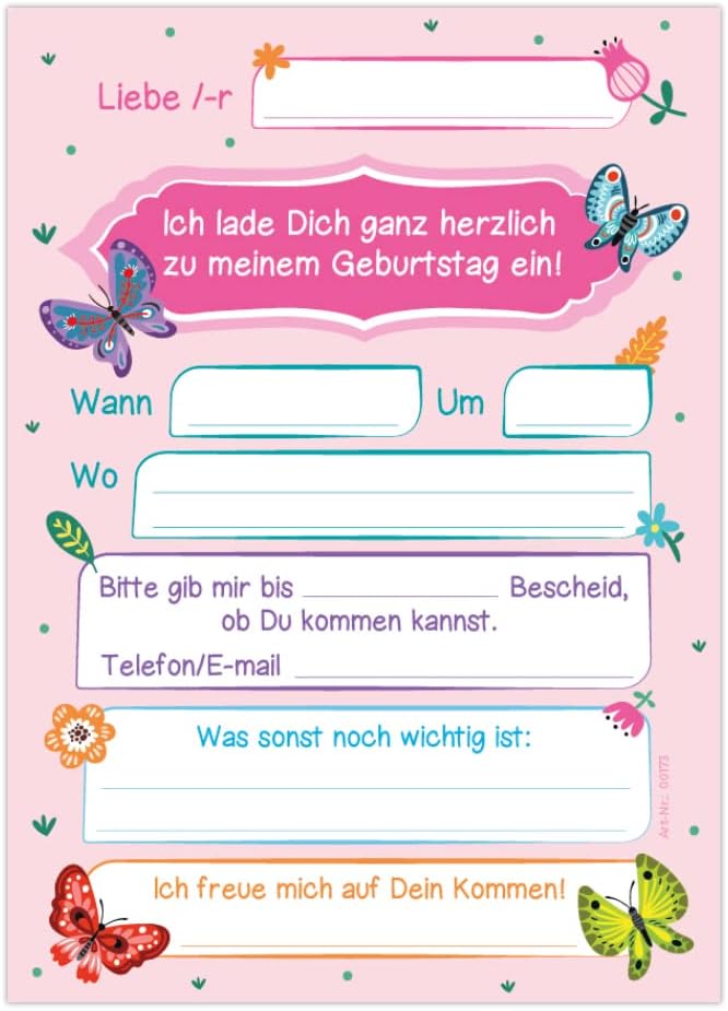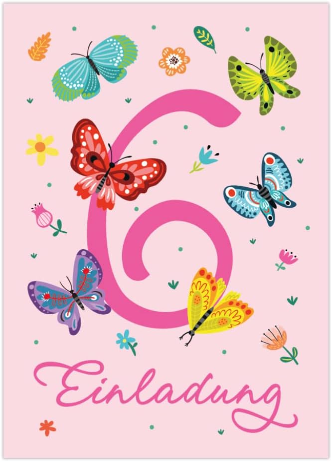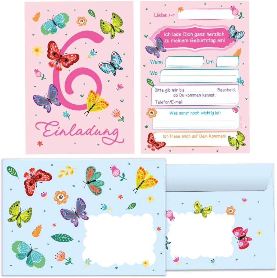12 biglietti d'invito per il 6° compleanno dei bambini, invito, compleanno, ragazza, farfalle, fiori, incl. 12 buste, 12 sacchetti/naturale, 12 adesivi, 12 navi