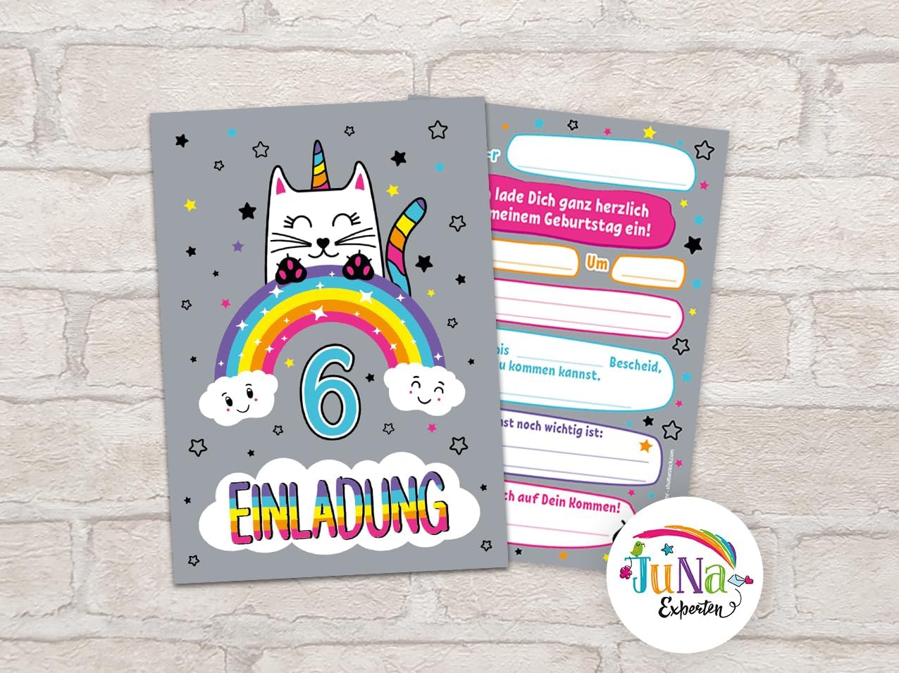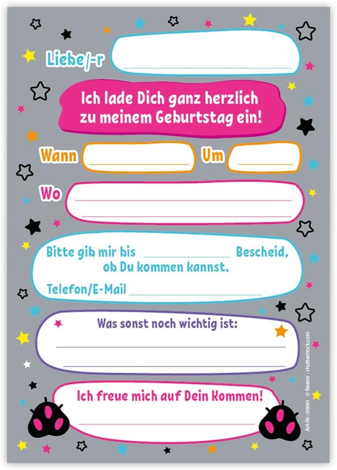 Contenuto: 12 biglietti d'invito Pratico: gli inviti sono moderni e progettati con molti dettagli. Sul retro troverete i campi prestampati da compilare. Dimensioni: i biglietti d'invito sono molto stabili, hanno formato DIN A6 (10,50 cm x 14,80 cm), stampa di alta qualità 300 g/m² e sono rivestiti con vernice UV per la finitura. Occasione: il set per feste è ideale per feste di compleanno. HAI BISOGNO DI UN ALTRO NUMERO? : da noi troverete questi graziosi inviti anche in set da 6, 8 o 10 pezzi. Altri motivi: nel nostro negozio troverete anche molti altri motivi di inviti, come lama, cavalli, calcio, cinema laser, bowling, jump. Prodotto in Germania: i biglietti sono stati prodotti in una tipografia tedesca.