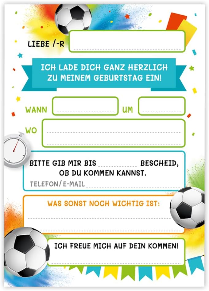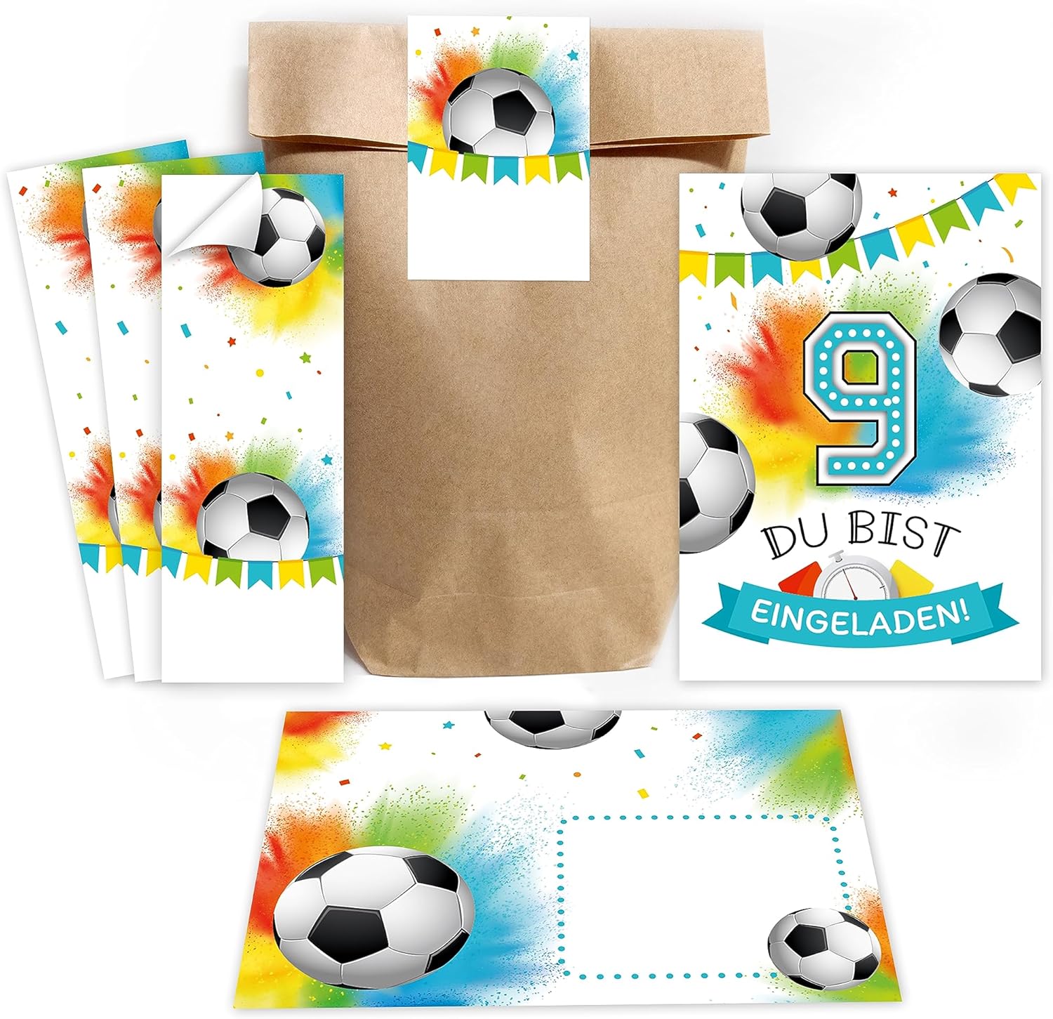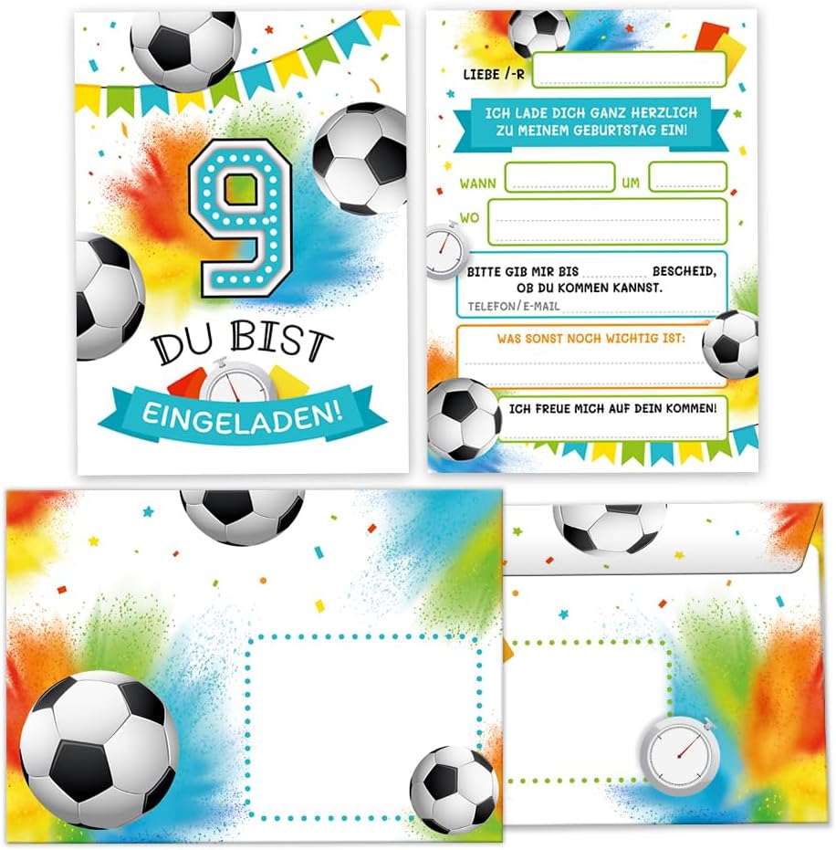 12 biglietti d'invito per il 9° compleanno dei bambini, motivo: calcio, inviti per il nono compleanno, con 12 buste, 12 sacchetti per feste, colore naturale, 12 adesivi