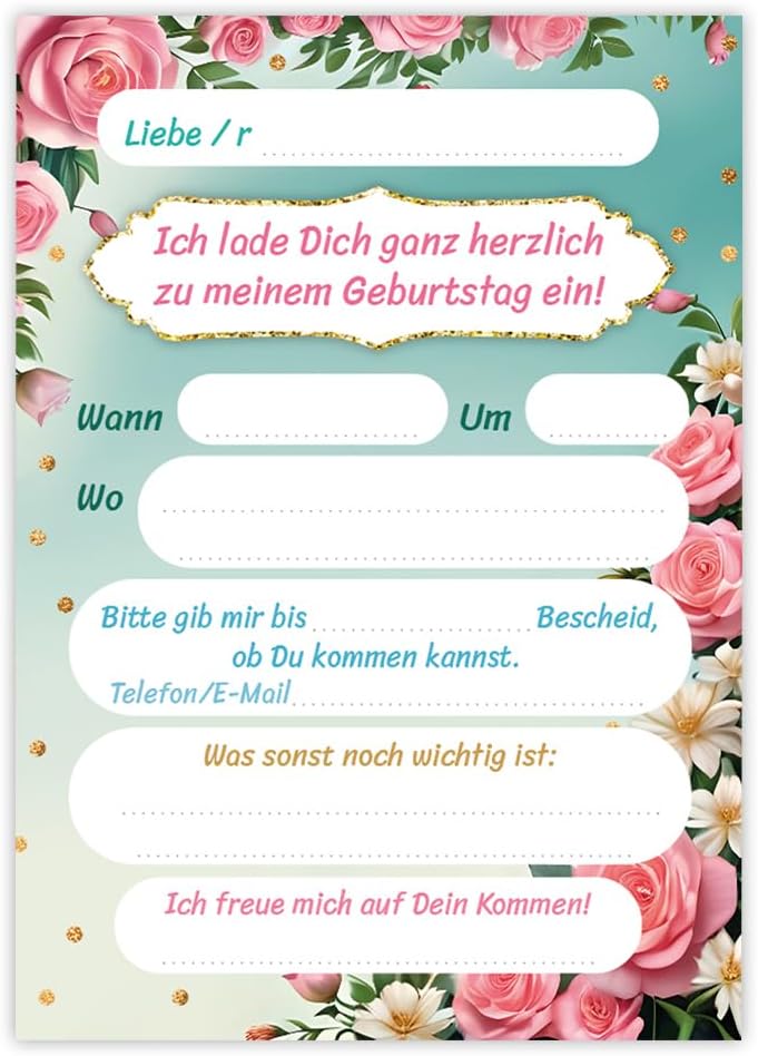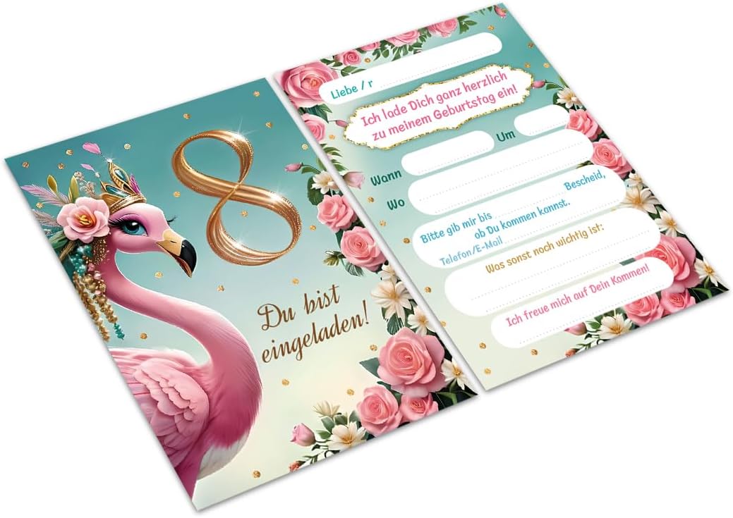 Contenuto: 12 biglietti d'invito Pratico: gli inviti sono moderni e progettati con molti dettagli. Sul retro troverete i campi prestampati da compilare. Dimensioni: i biglietti d'invito sono molto stabili, hanno formato DIN A6 (10,50 cm x 14,80 cm), stampa di alta qualità 300 g/m² e sono rivestiti con vernice UV per la finitura. Occasioni: i biglietti di invito sono ideali per feste di compleanno. HAI BISOGNO DI UN ALTRO NUMERO? : nelle varianti troverete questi graziosi inviti anche in set da 6, 8 o 10 pezzi. Altri motivi: nel nostro negozio troverete anche molti altri motivi di inviti, come lama, cavalli, calcio, cinema laser, bowling, jump. Prodotto in Germania: i biglietti sono stati prodotti in una tipografia tedesca.