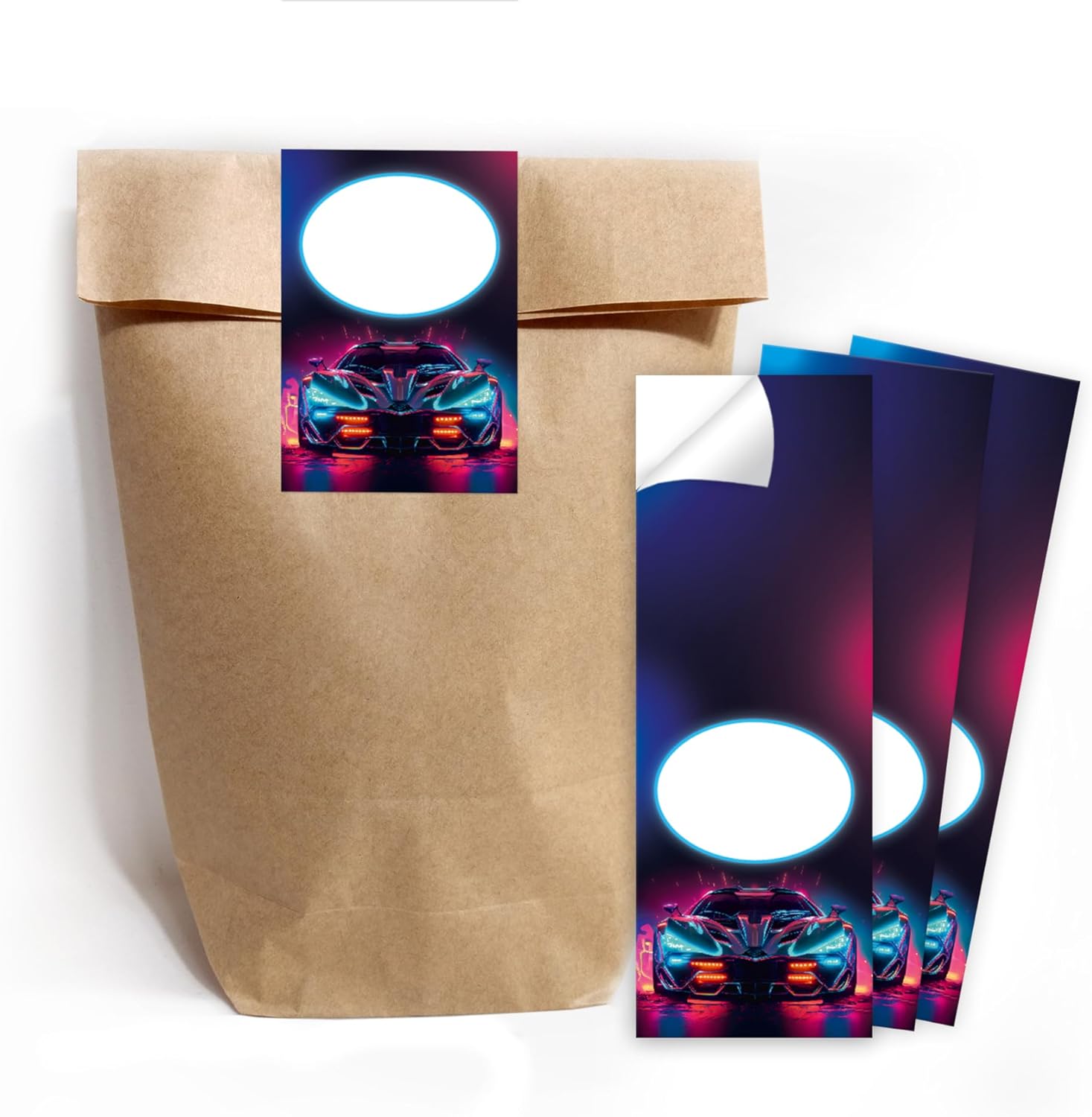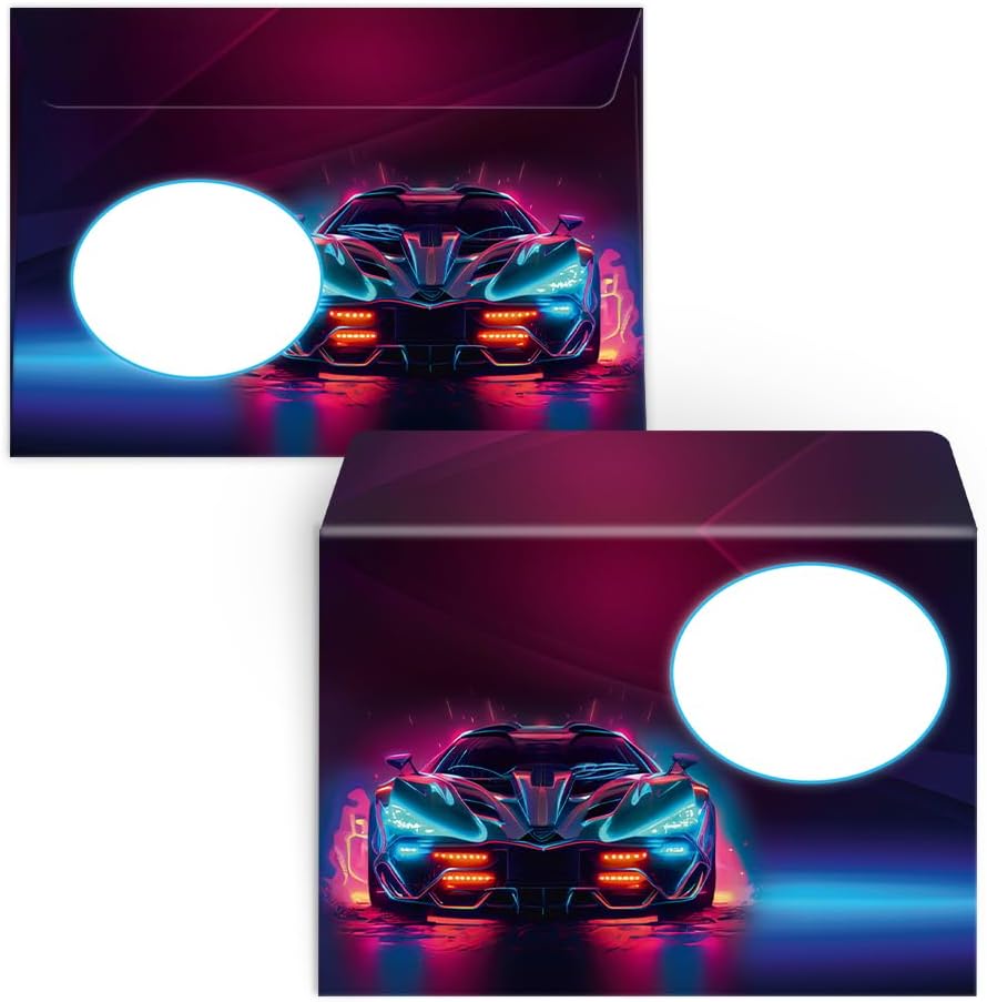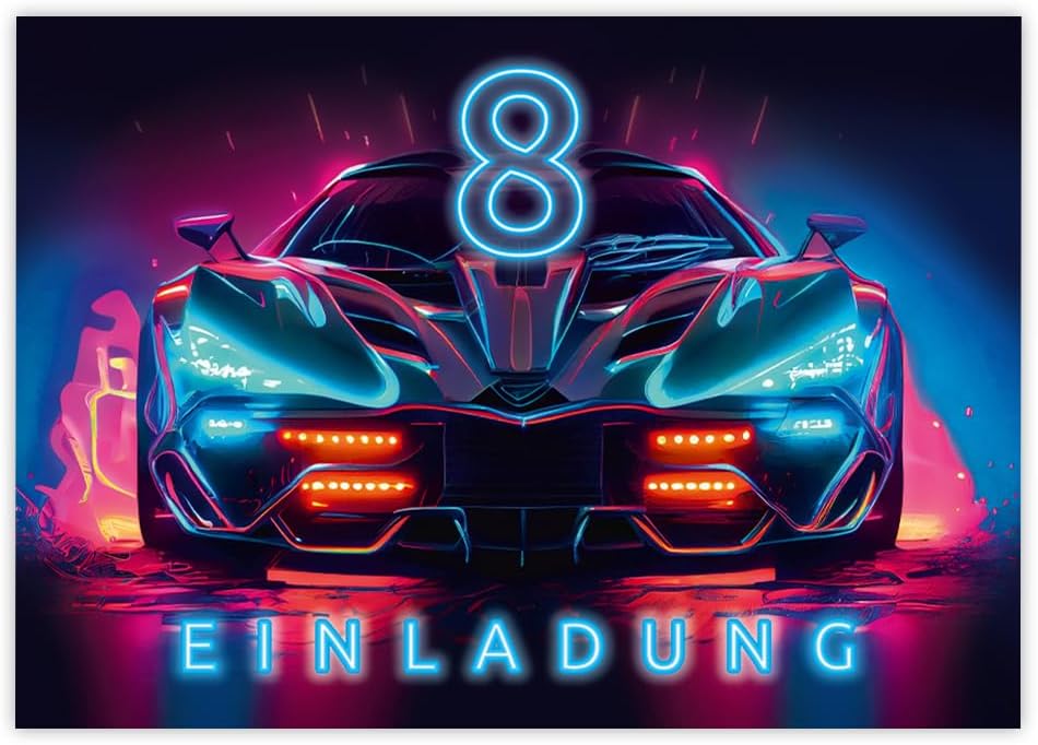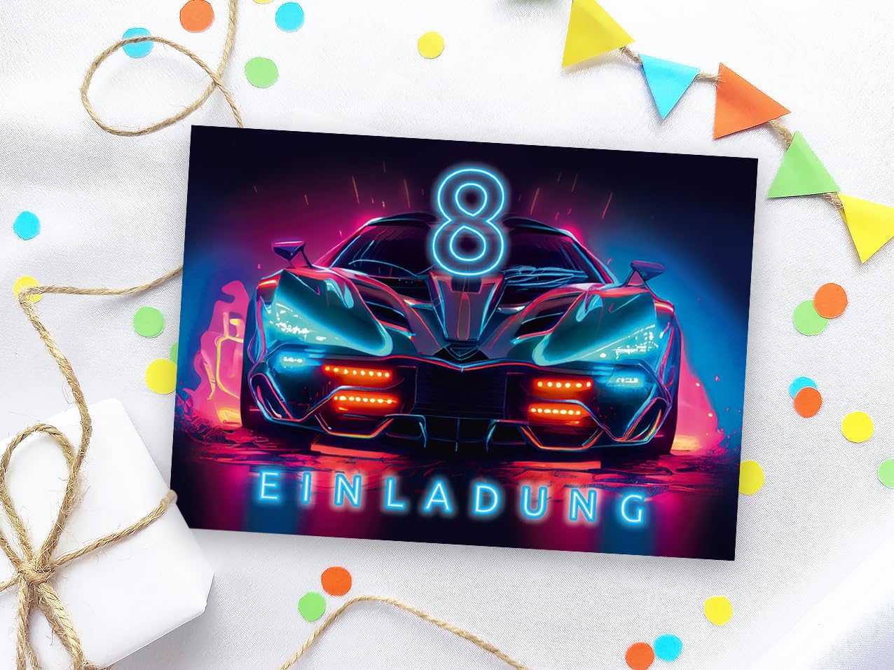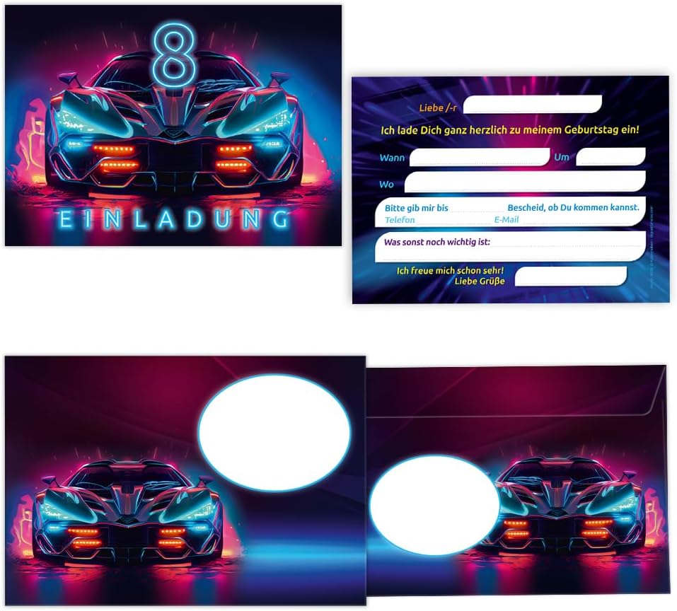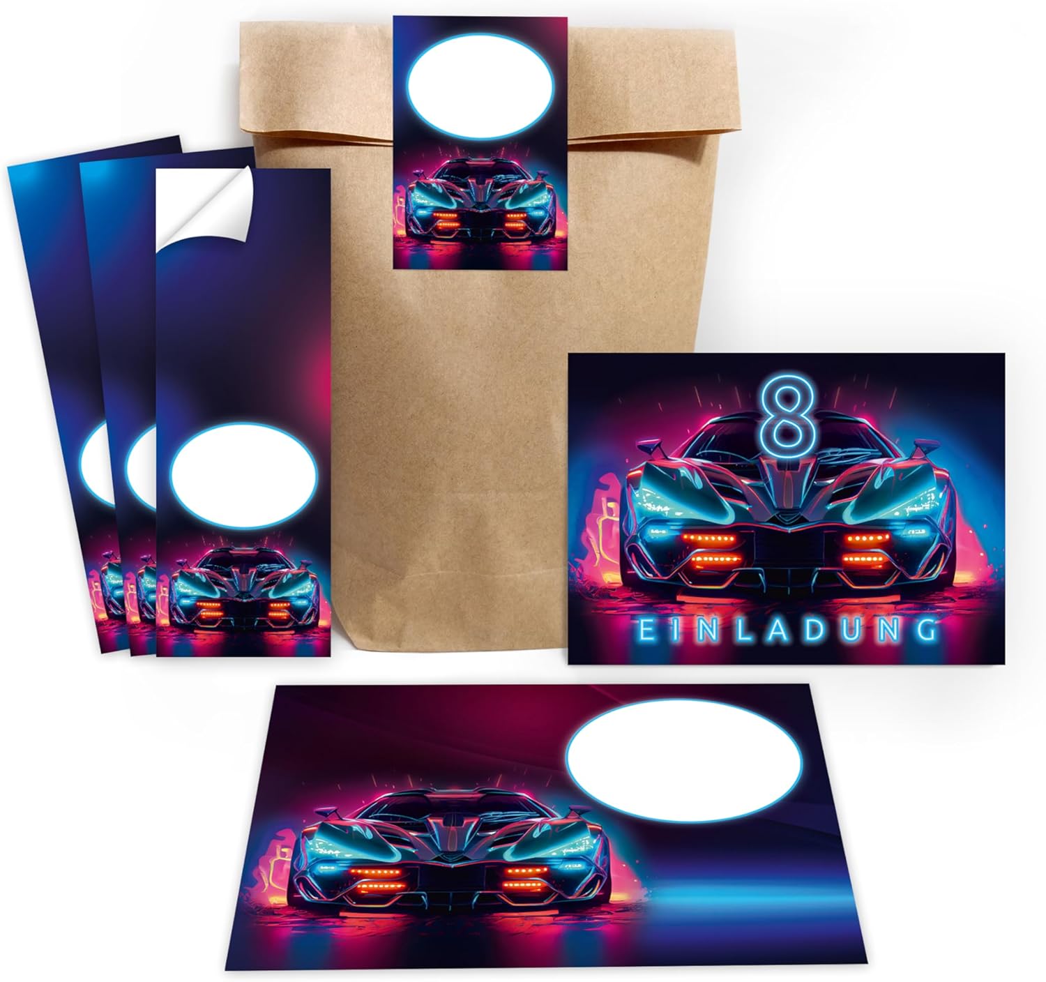 12 biglietti d'invito per l'8° compleanno per bambini, auto da corsa, inviti per il compleanno dei ragazzi, auto da corsa, con 12 buste, 12 sacchetti per feste, colore naturale, 12 adesivi