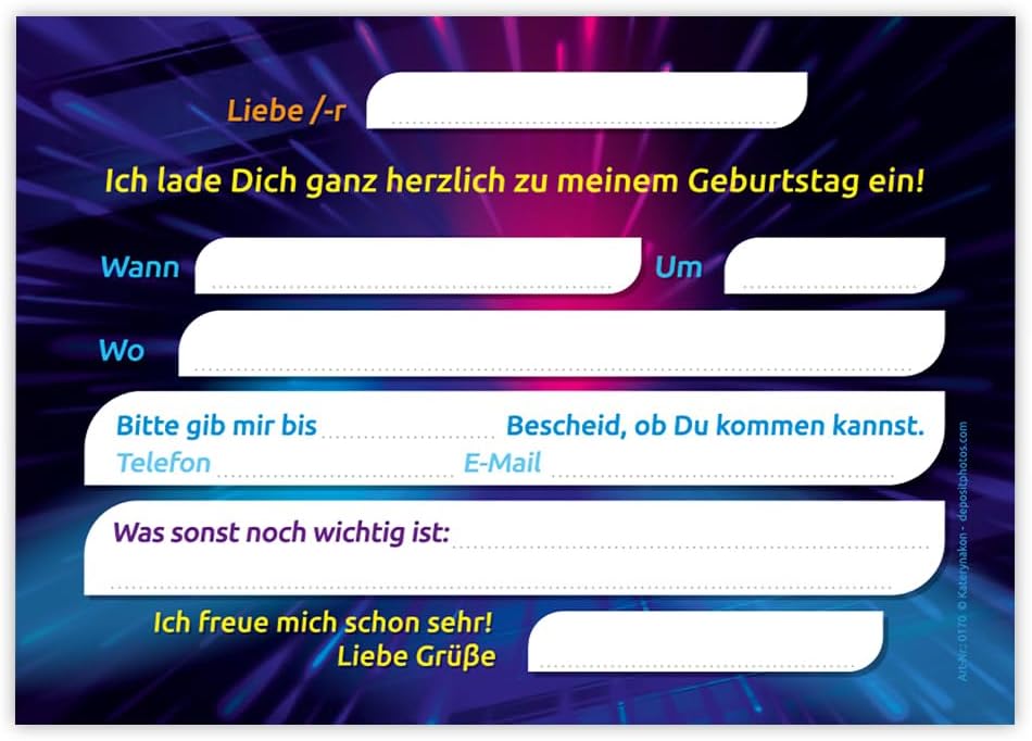 Contenuto: 12 biglietti d'invito + 12 buste + 12 sacchetti per feste/naturale + 12 adesivi Pratico: con questo set non avrete solo inviti con buste abbinate, ma anche sacchetti regalo per regalini e fantastici adesivi regalo da scrivere. Biglietti: gli inviti sono moderni e progettati con molti dettagli. Sul retro troverete i campi prestampati da compilare. I biglietti d'invito sono molto robusti, hanno formato A6 (10,50 cm x 14,80 cm), stampa di immagini di alta qualità da 300 g/m e sono rivestiti con vernice UV per la finitura. Buste autoadesive: la busta ha una dimensione di 11,40 cm x 16,20 cm, stampa da 80 g/m² ed è adesiva (con striscia adesiva). Sacchetti regalo: i sacchetti di carta hanno una dimensione di 14 x 22 x 5 cm. I sacchetti per feste (sacchetti a fondo incrociato) sono molto adatti per confezionare piccole bomboniere o caramelle per gli ospiti. Adesivo: gli adesivi hanno una dimensione di 5,2 x 14,8 cm. Tu o il tuo bambino potete scrivere sugli adesivi "Grazie", "bello che tu aspetta!" o scrivere il nome dell'ospite. Occasione: il set per feste è molto adatto per una festa di compleanno o una festa di compleanno. È possibile utilizzare questi biglietti anche come inviti per battesimi, feste a tema, feste al cinema o in piscina.
