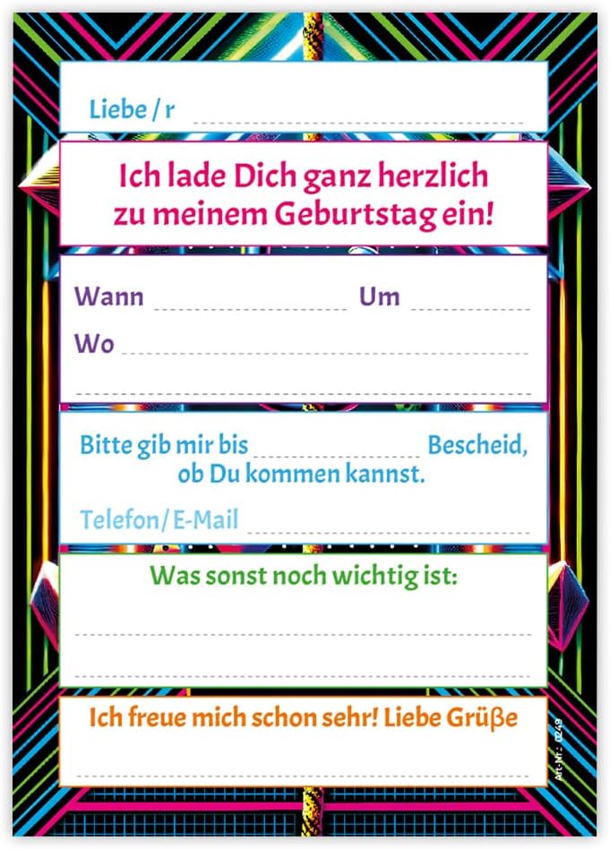 Contenuto: 12 biglietti d'invito Pratico: gli inviti sono moderni e progettati con molti dettagli. Sul retro troverete i campi prestampati da compilare. Dimensioni: i biglietti d'invito sono molto stabili, hanno formato DIN A6 (10,50 cm x 14,80 cm), stampa di alta qualità 300 g/m² e sono rivestiti con vernice UV per la finitura. Occasioni: i biglietti di invito sono ideali per feste di compleanno. HAI BISOGNO DI UN ALTRO NUMERO? : nelle varianti troverete questi graziosi inviti anche in set da 6, 8 o 10 pezzi. Altri motivi: nel nostro negozio troverete anche molti altri motivi di inviti, come lama, cavalli, calcio, cinema laser, bowling, jump. Prodotto in Germania: i biglietti sono stati prodotti in una tipografia tedesca.