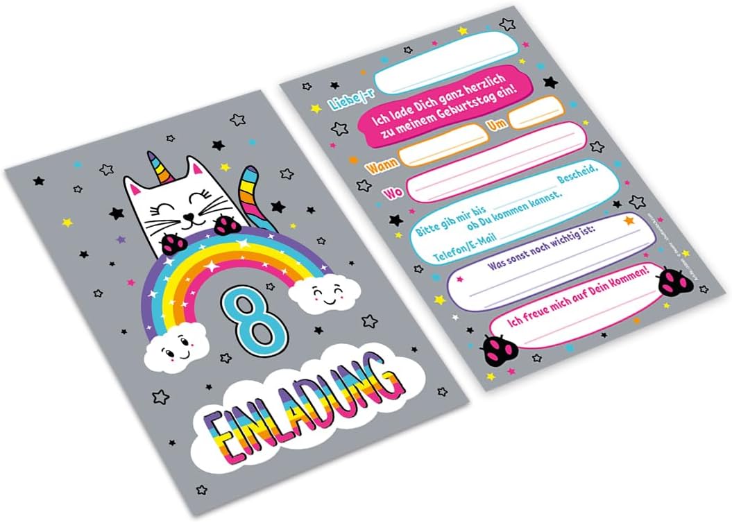 12 biglietti d'invito per l'8° compleanno per bambini, ragazze, ragazzi, gatti, unicorno, fantastici inviti per l'ottavo compleanno, per ragazze, compleanno
