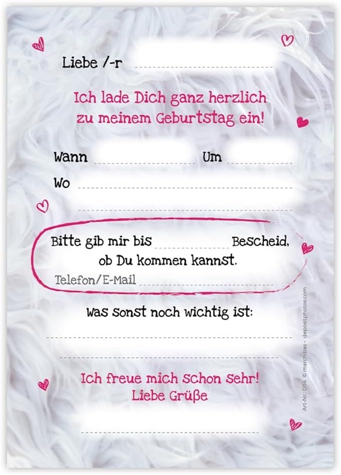 Contenuto: 12 biglietti d'invito + 12 buste Pratico: gli inviti sono moderni e progettati con molti dettagli. Sul retro troverete i campi prestampati da compilare. Biglietti: i biglietti d'invito sono molto robusti, hanno formato A6 (10,50 cm x 14,80 cm), stampa di alta qualità 300 g/m e sono rivestiti con vernice UV per la finitura. Buste autoadesive: la busta ha una dimensione di 11,40 cm x 16,20 cm, stampa da 80 g/m ed è adesiva (con striscia adesiva). Occasioni: i biglietti di invito sono molto adatti per una festa di compleanno o una festa di compleanno. È possibile utilizzare questi biglietti anche come inviti per battesimi, feste a tema, feste al cinema o feste in piscina. HAI BISOGNO DI UN ALTRO NUMERO? : da noi troverete anche biglietti e buste in set da 6, 8 o 10 pezzi. Altri motivi: nel nostro negozio troverete anche molti altri motivi di inviti, come lama, cavalli, calcio, cinema, piscina, bowling, salto. Prodotto in Germania: i biglietti e le buste sono stati prodotti in una tipografia tedesca.