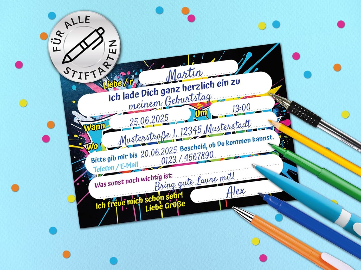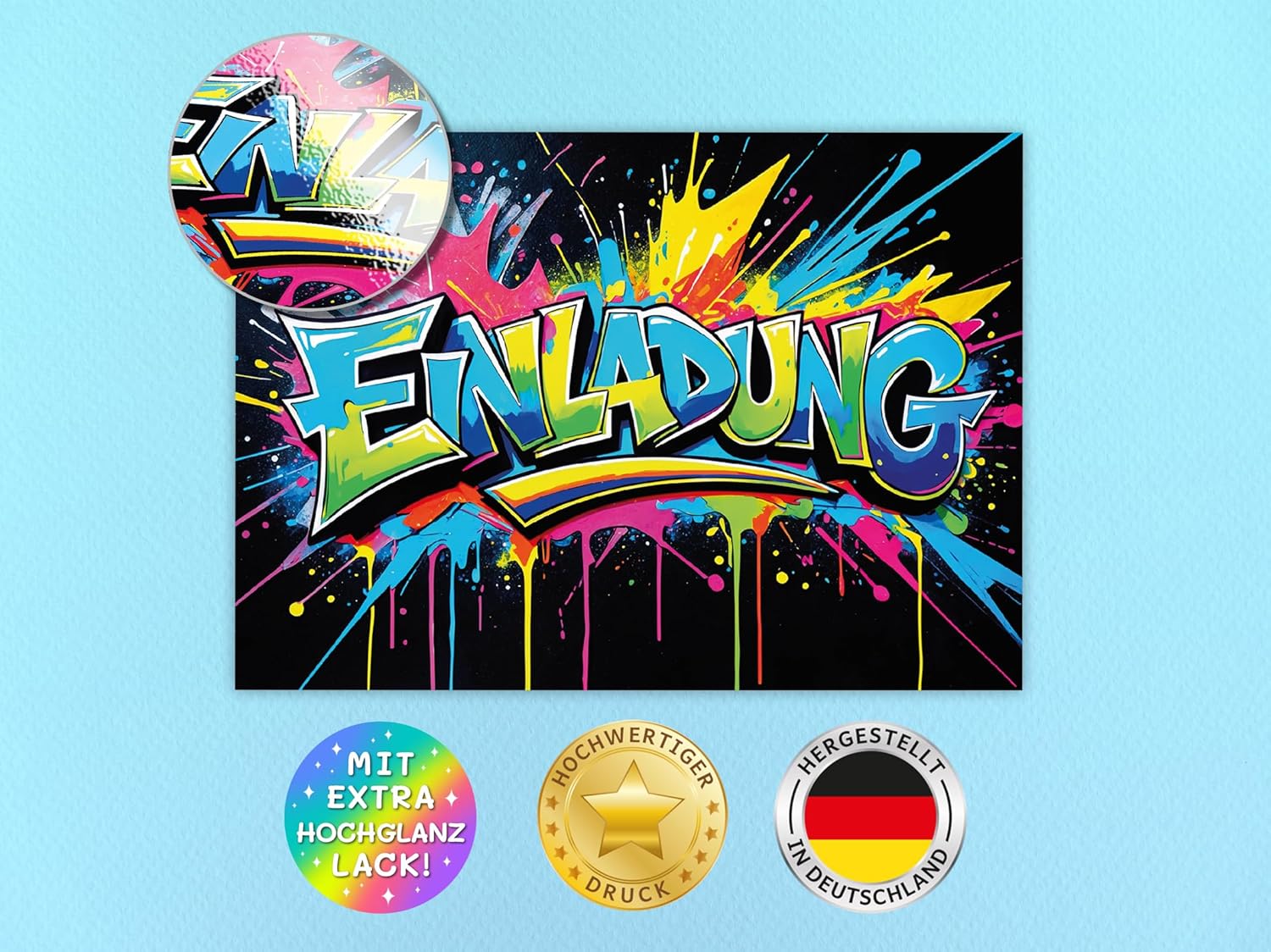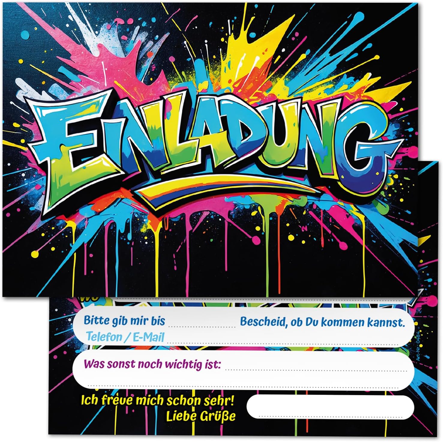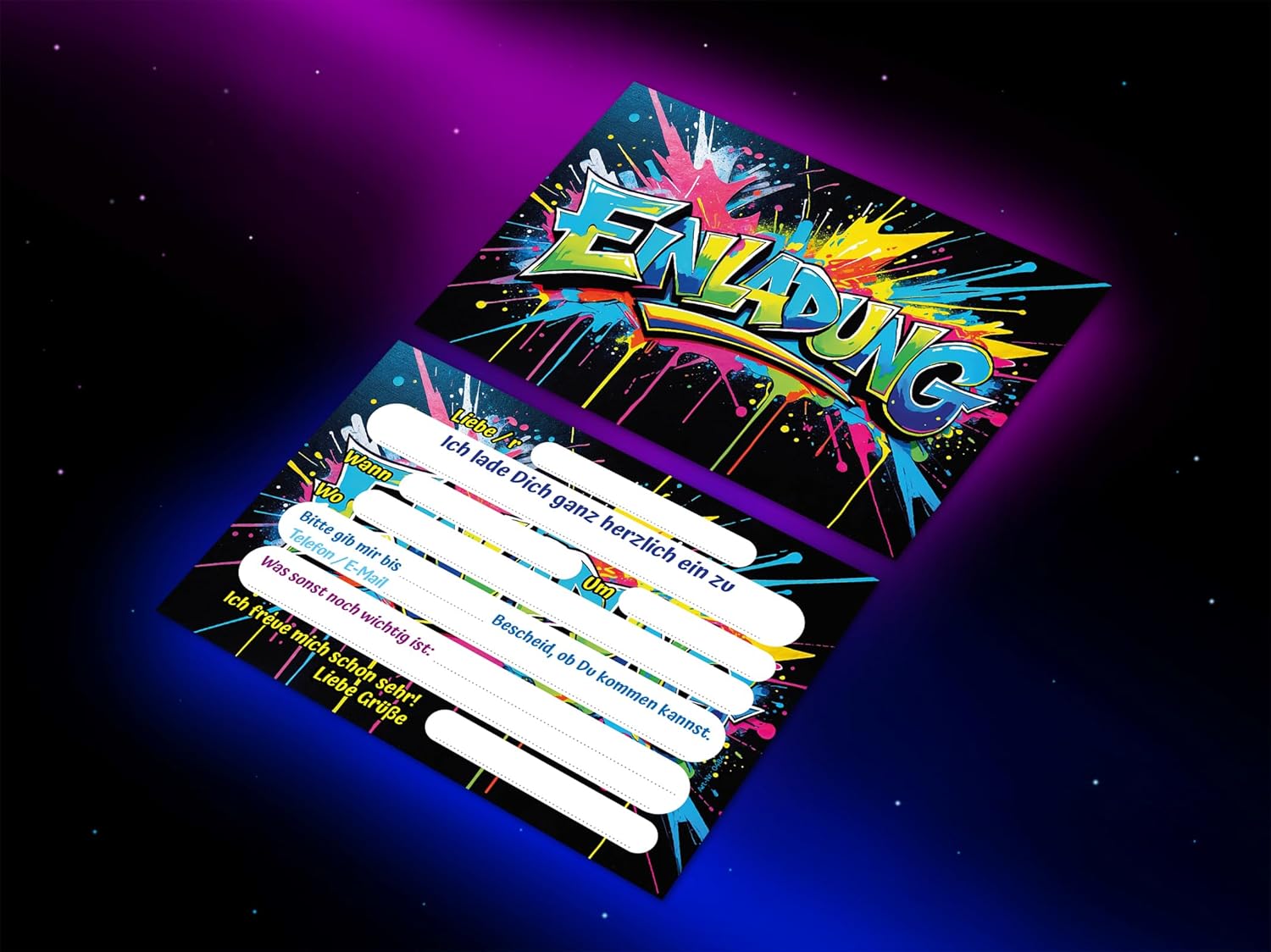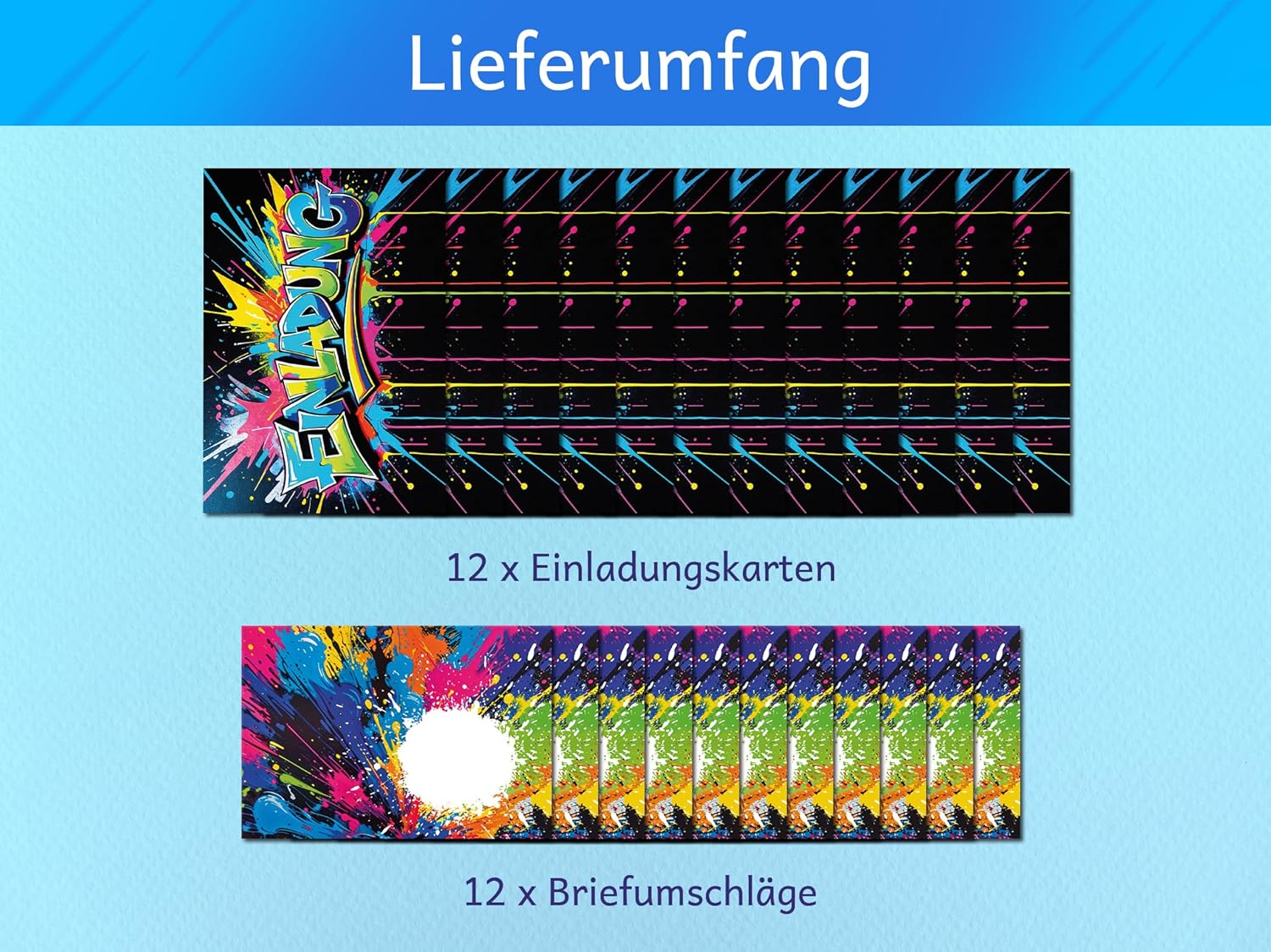 Contenuto: 12 fantastici biglietti d'invito + 12 buste PRATICO: campi prestampati per tutte le informazioni importanti da compilare sul retro. Dimensioni: il biglietto (10,50 cm x 14,80 cm) ha una stampa di 300 g/m ed è rivestito con vernice UV. La busta (11,40 cm x 16,20 cm) è adesiva (con striscia adesiva). Prodotto in Germania: i biglietti e le buste sono stati prodotti in una tipografia tedesca. Altro: disponibile anche in set da 6, 8, 10 pezzi nel nostro negozio.