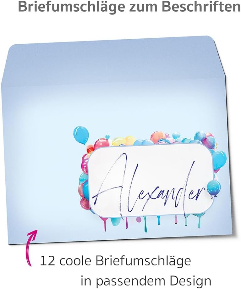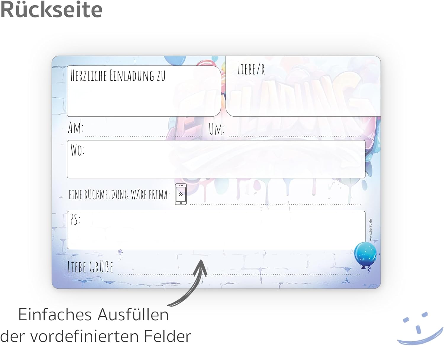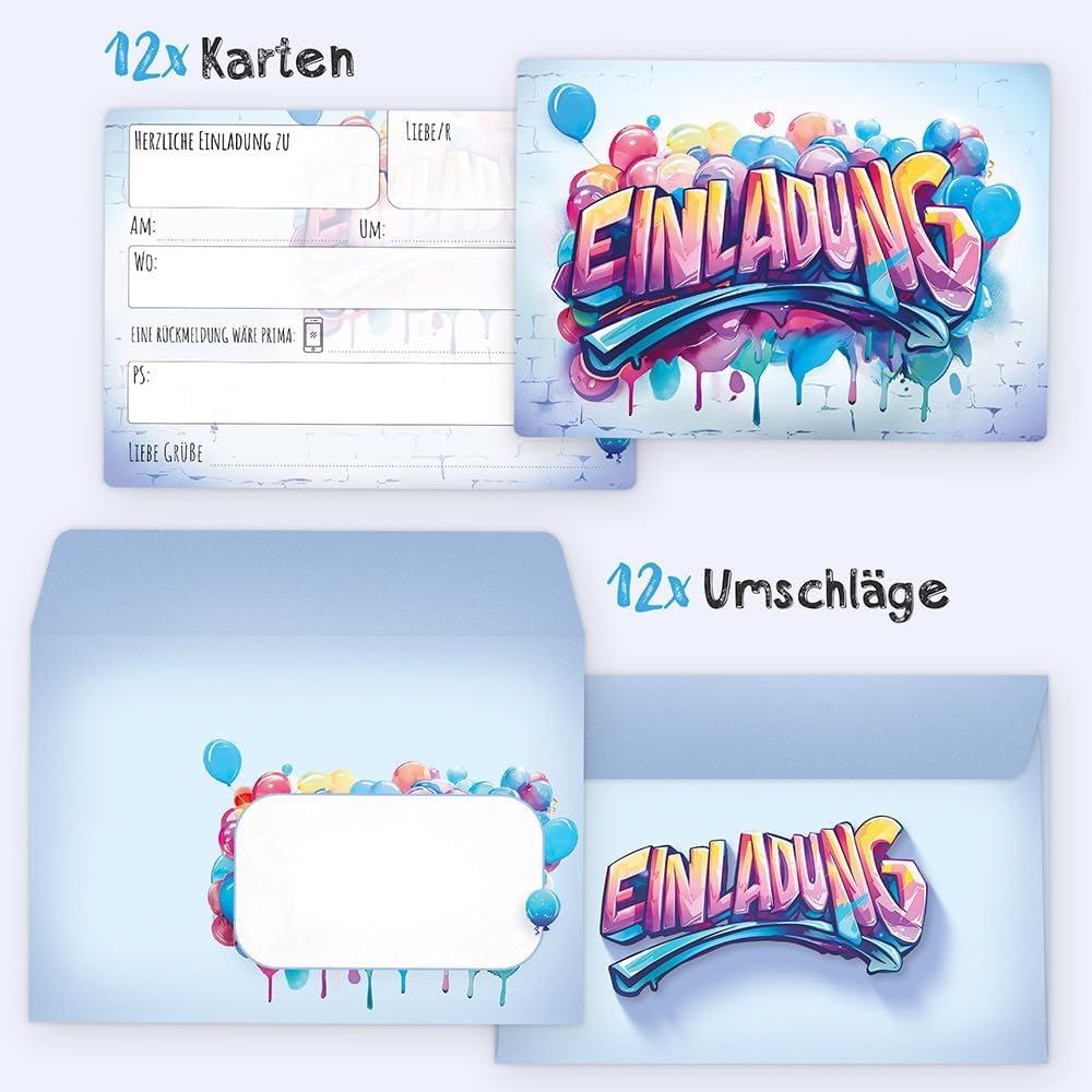 Motivo grafiti: il motivo unico degli inviti attira subito l'attenzione. Adatto sia per ragazze che per ragazzi, bambini e adolescenti o adulti. La festa può iniziare. Molto ben scrivibile: i biglietti sono molto scrivibili sul retro. I biglietti d'invito sono realizzati in cartoncino da 300 g/m² di alta qualità e sono quindi extra stabili. Prodotto in Germania: i set di biglietti sono prodotti in Germania e confezionati e lavorati con amore nella nostra piccola azienda a conduzione familiare nella Foresta Nera. Buste abbinate: sono incluse 12 belle buste stampate. Questi sono autoadesivi, basta staccare la striscia adesiva e chiudere le buste molto facilmente. Dimensioni ottimali: i 12 biglietti di invito in formato cartolina (DIN A6 14,8 x 10,5 cm) sono maneggevoli, offrono abbastanza spazio per tutte le informazioni importanti e possono essere distribuiti bene in casa, asilo, scuola, club, famiglia o ad amici e amiche. Versatile: grazie al loro design neutro, i biglietti sono adatti per un compleanno, una festa di compleanno per bambini, feste a tema, pigiama party, feste di compleanno, feste di compleanno o altre feste.