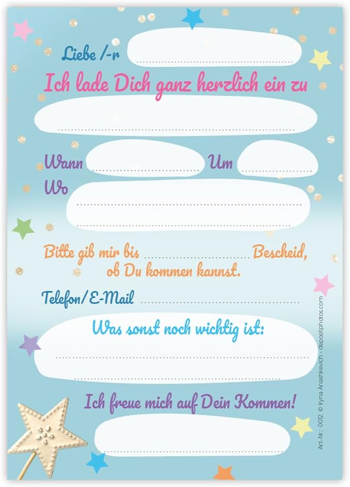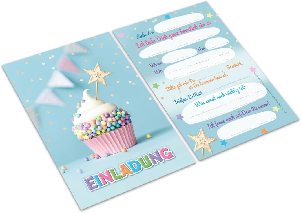 Contenuto: 12 biglietti d'invito + 12 buste Pratico: gli inviti sono moderni e progettati con molti dettagli. Sul retro troverete i campi prestampati da compilare. Biglietti: i biglietti d'invito sono molto robusti, hanno formato A6 (10,50 cm x 14,80 cm), stampa di alta qualità 300 g/m e sono rivestiti con vernice UV per la finitura. Buste autoadesive: la busta ha una dimensione di 11,40 cm x 16,20 cm, stampa da 80 g/m ed è adesiva (con striscia adesiva). Occasioni: i biglietti di invito sono molto adatti per una festa di compleanno o una festa di compleanno. È possibile utilizzare questi biglietti anche come inviti per battesimi, feste a tema, feste al cinema o feste in piscina. HAI BISOGNO DI UN ALTRO NUMERO? : da noi troverete anche biglietti e buste in set da 6, 8 o 10 pezzi. Altri motivi: nel nostro negozio troverete anche molti altri motivi di inviti, come lama, cavalli, calcio, cinema, piscina, bowling, salto. Prodotto in Germania: i biglietti e le buste sono stati prodotti in una tipografia tedesca.