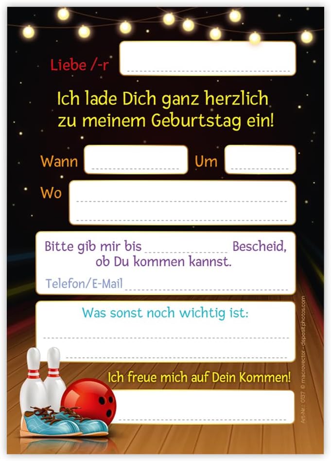 Contenuto: 12 biglietti d'invito + 12 buste Pratico: gli inviti sono moderni e progettati con molti dettagli. Sul retro troverete i campi prestampati da compilare. Biglietti: i biglietti d'invito sono molto robusti, hanno formato A6 (10,50 cm x 14,80 cm), stampa di alta qualità 300 g/m e sono rivestiti con vernice UV per la finitura. Buste autoadesive: la busta ha una dimensione di 11,40 cm x 16,20 cm, stampa da 80 g/m ed è adesiva (con striscia adesiva). Occasioni: i biglietti di invito sono molto adatti per una festa di compleanno o una festa di compleanno. È possibile utilizzare questi biglietti anche come inviti per battesimi, feste a tema, feste al cinema o feste in piscina. HAI BISOGNO DI UN ALTRO NUMERO? : da noi troverete anche biglietti e buste in set da 6, 8 o 10 pezzi. Altri motivi: nel nostro negozio troverete anche molti altri motivi di inviti, come lama, cavalli, calcio, cinema, piscina, bowling, salto. Prodotto in Germania: i biglietti e le buste sono stati prodotti in una tipografia tedesca.