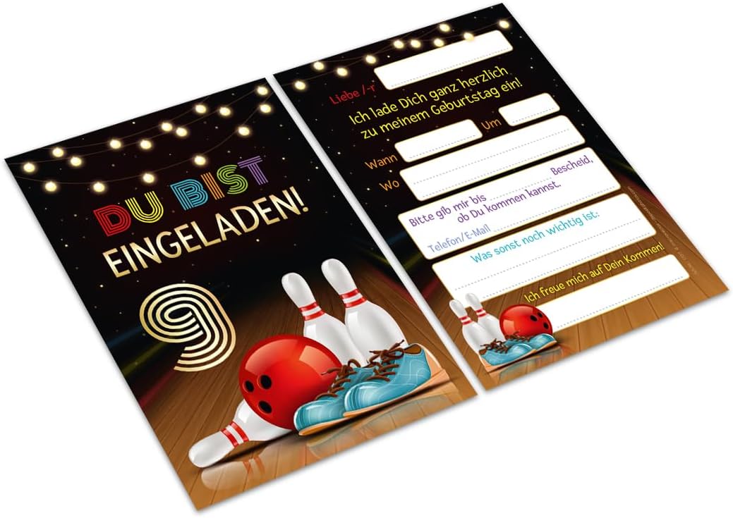 12 biglietti di invito, incl. 12 buste per il 9° compleanno dei bambini, coni, bowling, ragazze, ragazzi, inviti nono compleanno per bambini