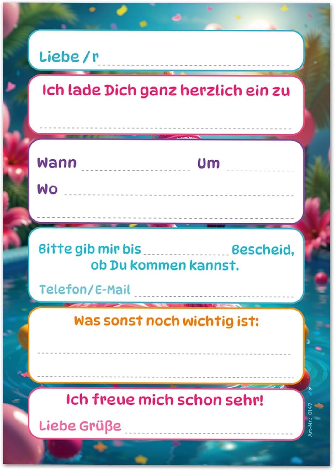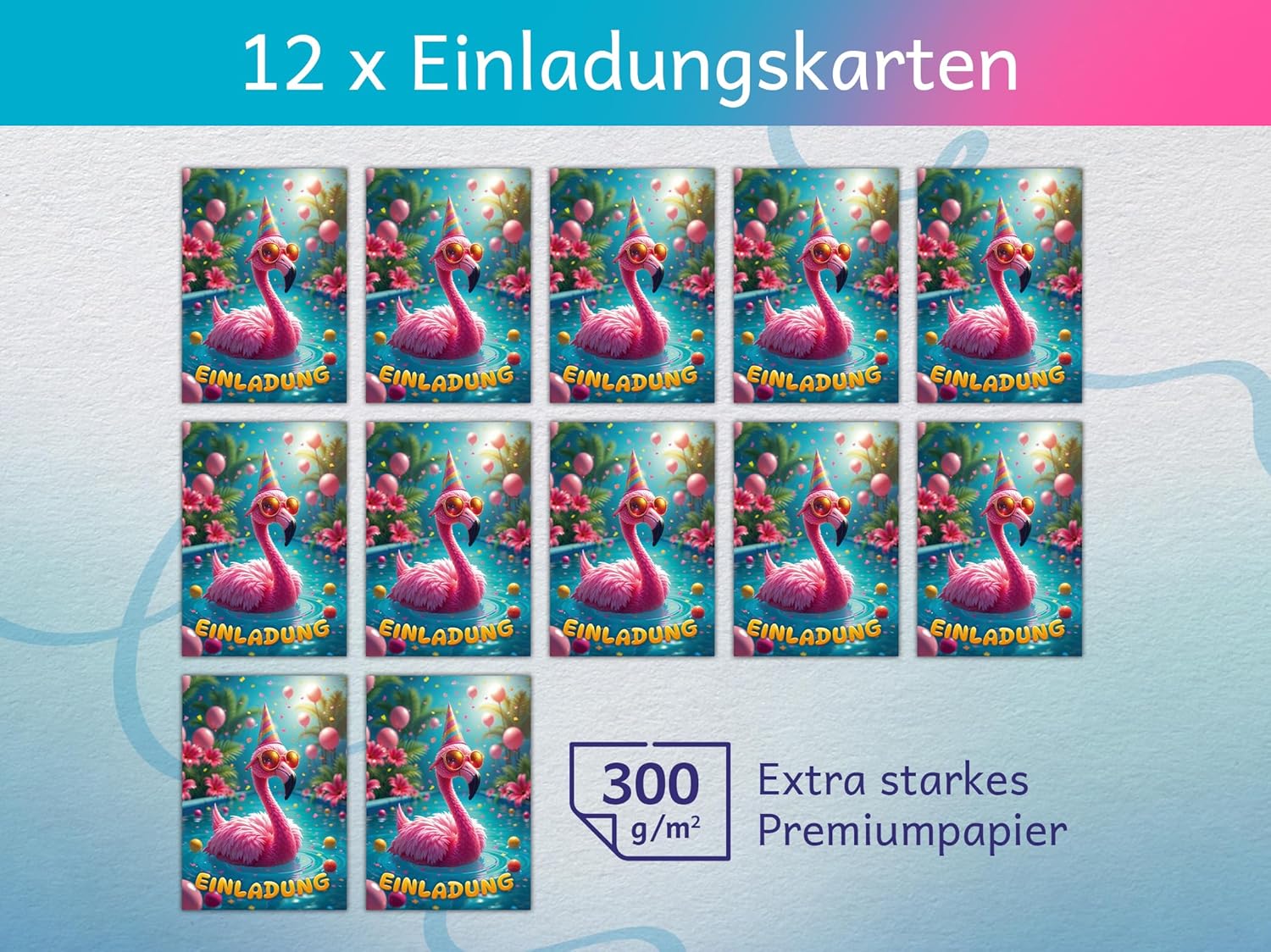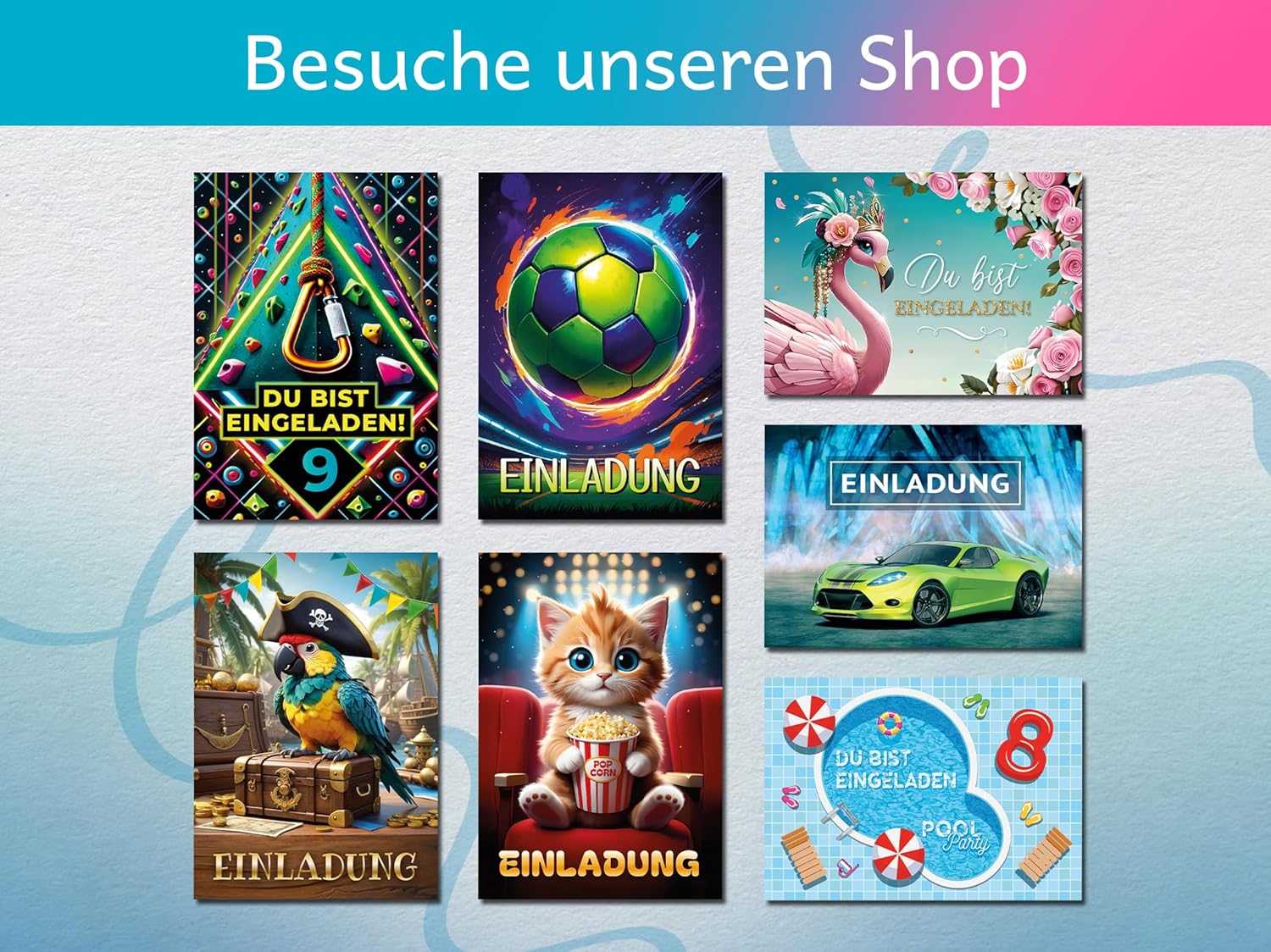 Contenuto: 12 biglietti d'invito Pratico: gli inviti sono moderni e progettati con molti dettagli. Sul retro troverete i campi prestampati da compilare. Dimensioni: i biglietti d'invito sono molto stabili, hanno formato DIN A6 (10,50 cm x 14,80 cm), stampa di alta qualità 300 g/m² e sono rivestiti con vernice UV per la finitura. Occasioni: gli inviti sono ideali per feste di compleanno. HAI BISOGNO DI UN ALTRO NUMERO? : da noi troverete questi graziosi inviti anche in set da 6, 8 o 10 pezzi. Altri motivi: nel nostro negozio troverete anche molti altri motivi di inviti, come lama, cavalli, calcio, cinema laser, bowling, jump. Prodotto in Germania: i biglietti sono stati prodotti in una tipografia tedesca.