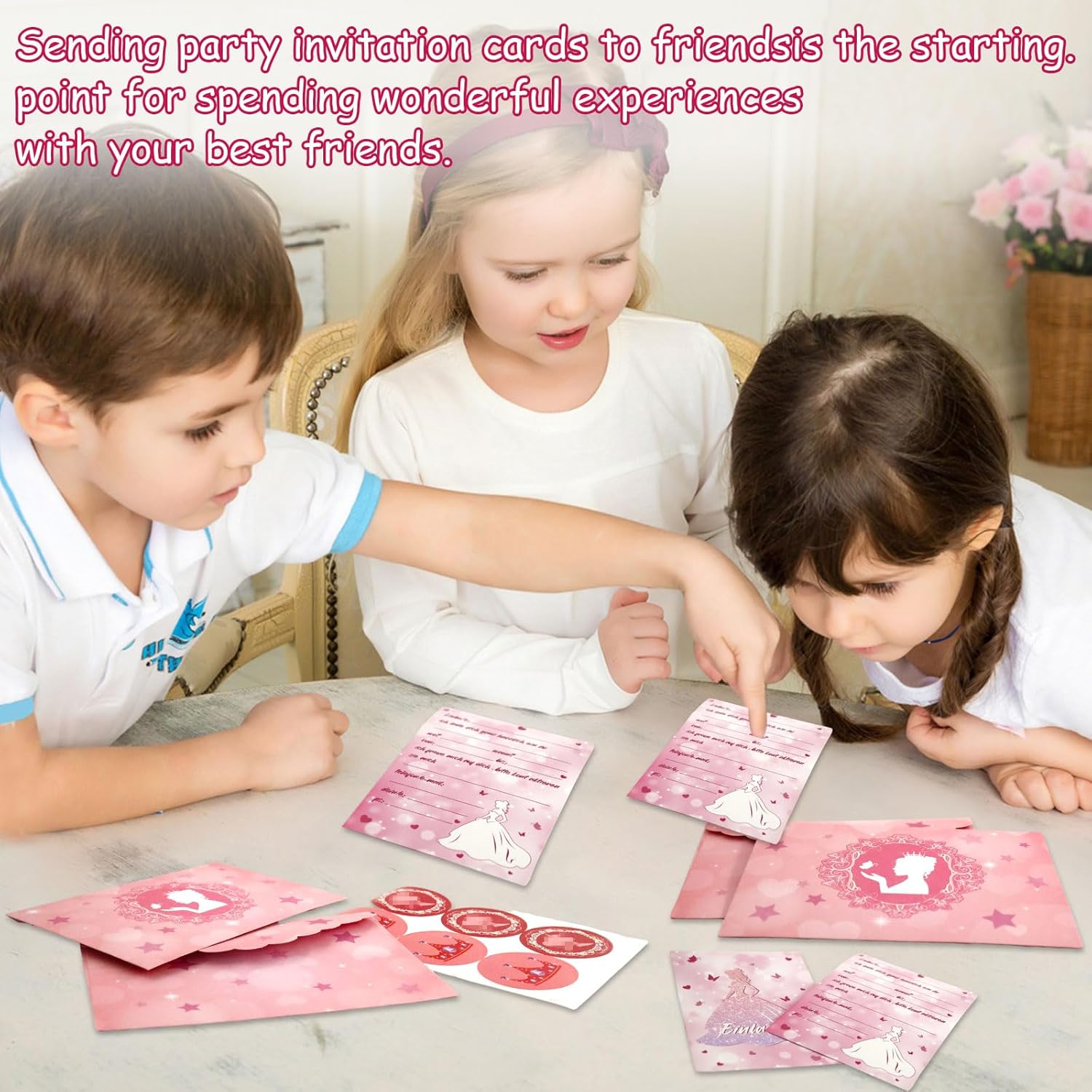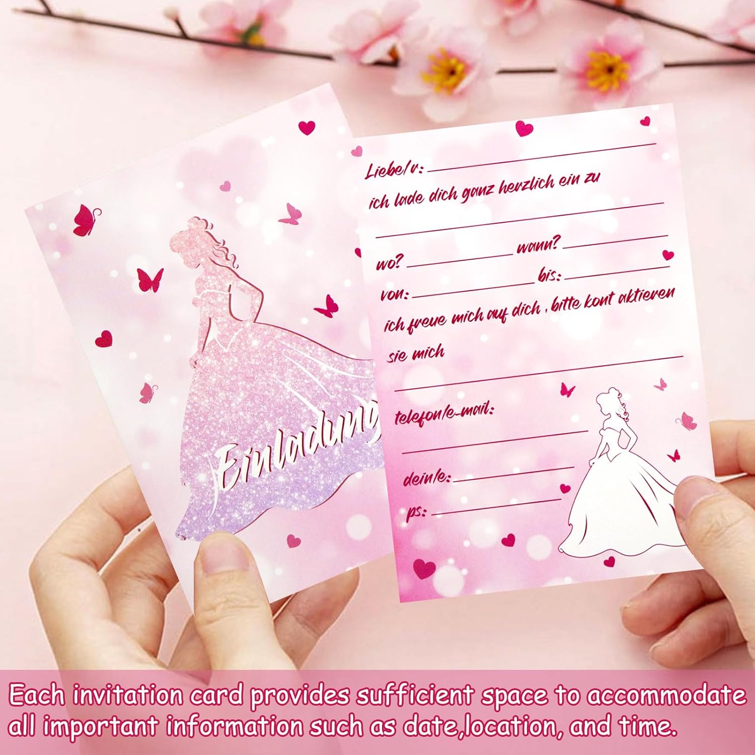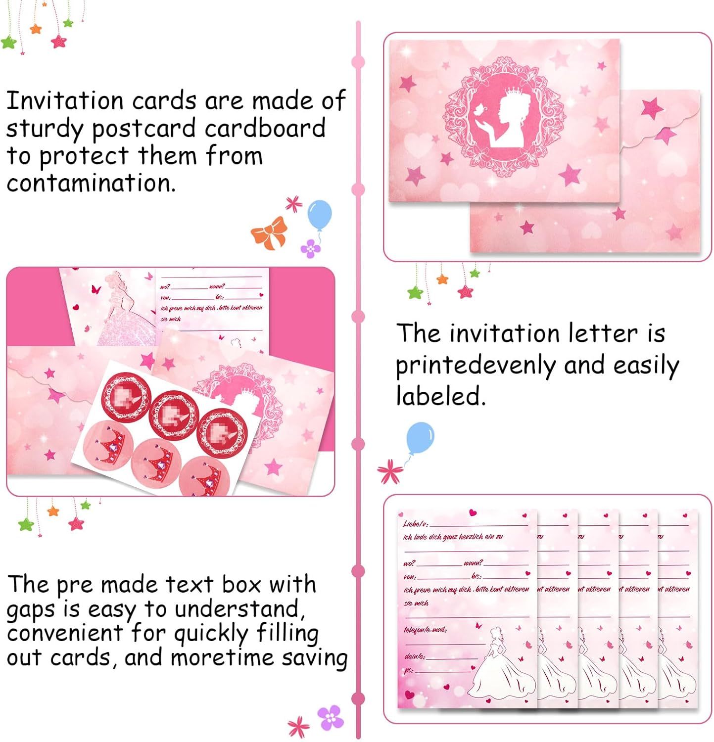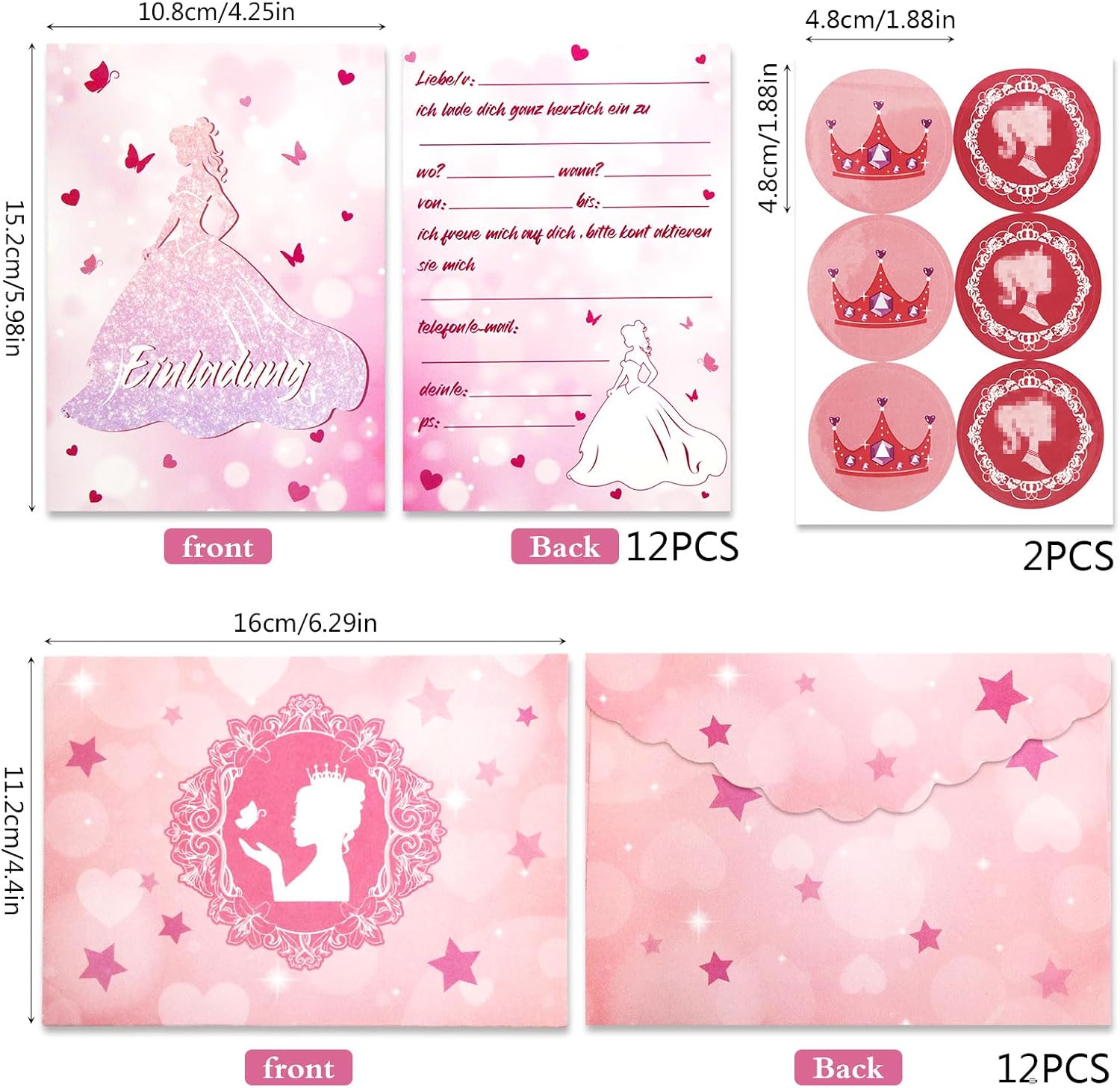 Set di inviti per il compleanno di una ragazza: Hey, cari genitori! Sei pronto a organizzare una festa di compleanno da sogno per il tuo piccolo? Abbiamo preparato per voi i biglietti d'invito per feste più belli e unici, tra cui 12 biglietti d'invito tedeschi, 12 buste e 12 adesivi. Rendi la festa del tuo bambino ancora più bella Materiale di alta qualità: questo biglietto d'invito per compleanno principessa è realizzato con materiali di carta di alta qualità. La carta ha un'elevata durezza, non è soggetta a pieghe e l'effetto di stampa è chiaro e chiaro Biglietti d'invito a tema principesse: questo set di biglietti d'invito per feste ha un design a tema principessa ed è combinato con rosa brillante e caldo, nonché motivi come farfalle, corone, cuori, stelle, ecc., Che dà l'intero invito carta una sensazione dolce e romantica Facile da compilare: la parte anteriore di questi biglietti d'invito per banchetti ha un elegante motivo principessa, e sul retro c'è spazio per compilare informazioni dettagliate, tra cui il nome dell'invitato, l'ora, il luogo e il tema, ecc. Questo è molto facile da compilare Occasioni adatte: questo biglietto di invito per ragazze viene fornito con una busta e adesivi squisiti in modo che le informazioni compilate possano essere ben protette. Perfetto per feste di compleanno per ragazze, feste a tema principesse, eventi scolastici, feste di Natale e molto altro ancora