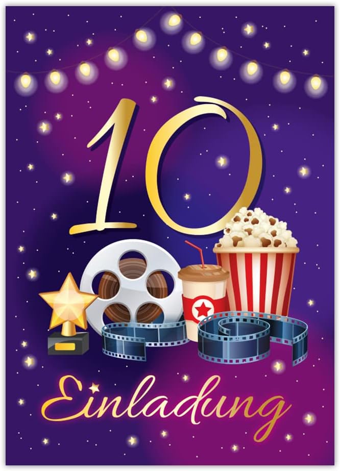 12 biglietti di invito per il 10° compleanno per bambini, invito compleanno e ragazze, cinema cinema, incl. 12 buste, 12 sacchetti/naturale, 12 adesivi, 12 navi