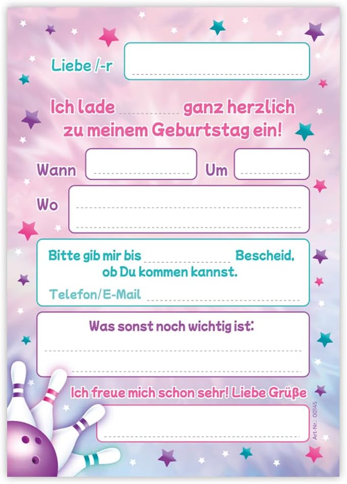 Contenuto: 12 biglietti d'invito Pratico: gli inviti sono moderni e progettati con molti dettagli. Sul retro troverete i campi prestampati da compilare. Dimensioni: i biglietti d'invito sono molto stabili, hanno formato DIN A6 (10,50 cm x 14,80 cm), stampa di alta qualità 300 g/m² e sono rivestiti con vernice UV per la finitura. Occasioni: i biglietti di invito sono molto adatti per una festa di compleanno o una festa di compleanno. È possibile utilizzare questi biglietti anche come inviti per battesimo, festa a tema, feste al cinema o feste in piscina. HAI BISOGNO DI UN ALTRO NUMERO? : da noi troverete questi graziosi inviti anche in set da 6, 8 o 10 pezzi. Altri motivi: nel nostro negozio troverete anche molti altri motivi di inviti, come lama, cavalli, calcio, cinema, piscina, bowling, salto. Prodotto in Germania: i biglietti sono stati prodotti in una tipografia tedesca.