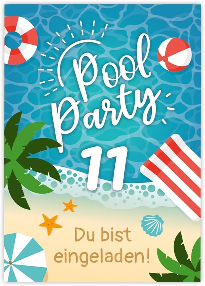 12 biglietti di invito per il 11° compleanno per bambini, piscina, ragazzi, ragazze, invito, undicesimo compleanno, incl. 12 buste, 12 sacchetti per feste, colore naturale, 12 adesivi