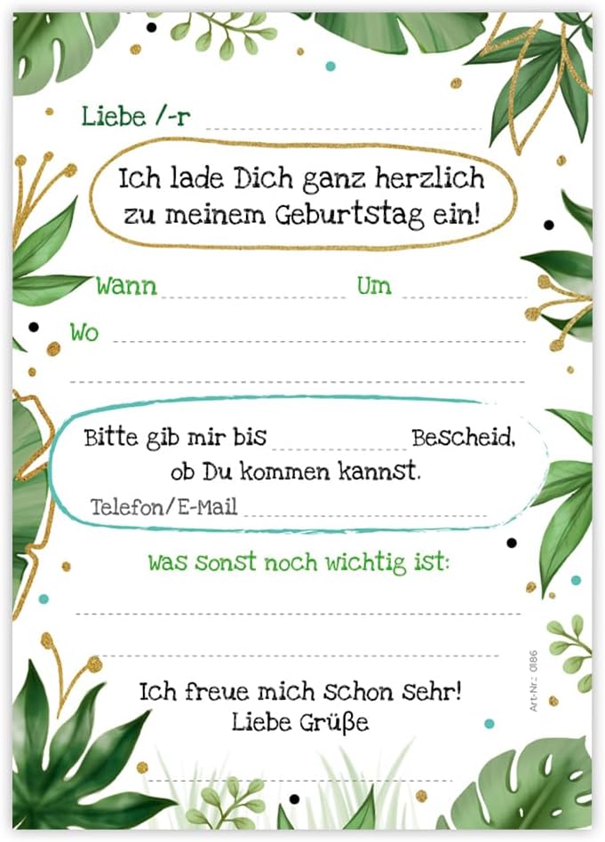 Contenuto: 12 biglietti d'invito + 12 buste + 12 sacchetti per feste/naturale + 12 adesivi Prodotto in Germania: biglietti, buste, sacchetti e adesivi sono prodotti in Germania. Pratico: con questo set non avrete solo inviti con buste abbinate, ma anche sacchetti regalo per regalini e fantastici adesivi regalo da scrivere. Biglietti: gli inviti sono moderni e progettati con molti dettagli. Sul retro troverete i campi prestampati da compilare. I biglietti d'invito sono molto robusti, hanno formato A6 (10,50 cm x 14,80 cm), stampa di immagini di alta qualità da 300 g/m e sono rivestiti con vernice UV per la finitura. Buste autoadesive: la busta ha una dimensione di 11,40 cm x 16,20 cm, stampa da 80 g/m² ed è adesiva (con striscia adesiva). Sacchetti regalo: i sacchetti di carta hanno una dimensione di 14 x 22 x 5 cm. I sacchetti per feste (sacchetti a fondo incrociato) sono molto adatti per confezionare piccole bomboniere o caramelle per gli ospiti. Adesivo: gli adesivi hanno una dimensione di 5,2 x 14,8 cm. Tu o il tuo bambino potete scrivere sugli adesivi "Grazie", "bello che tu aspetta!" o scrivere il nome dell'ospite.