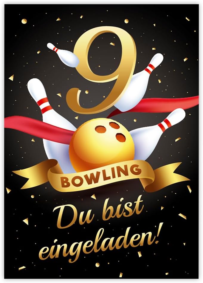 12 biglietti di invito per il 9° compleanno dei bambini, bowling, coni, inviti per bambini, nono compleanno, con 12 buste, 12 sacchetti per feste/petrolio, 12 adesivi, 12 segnalibri
