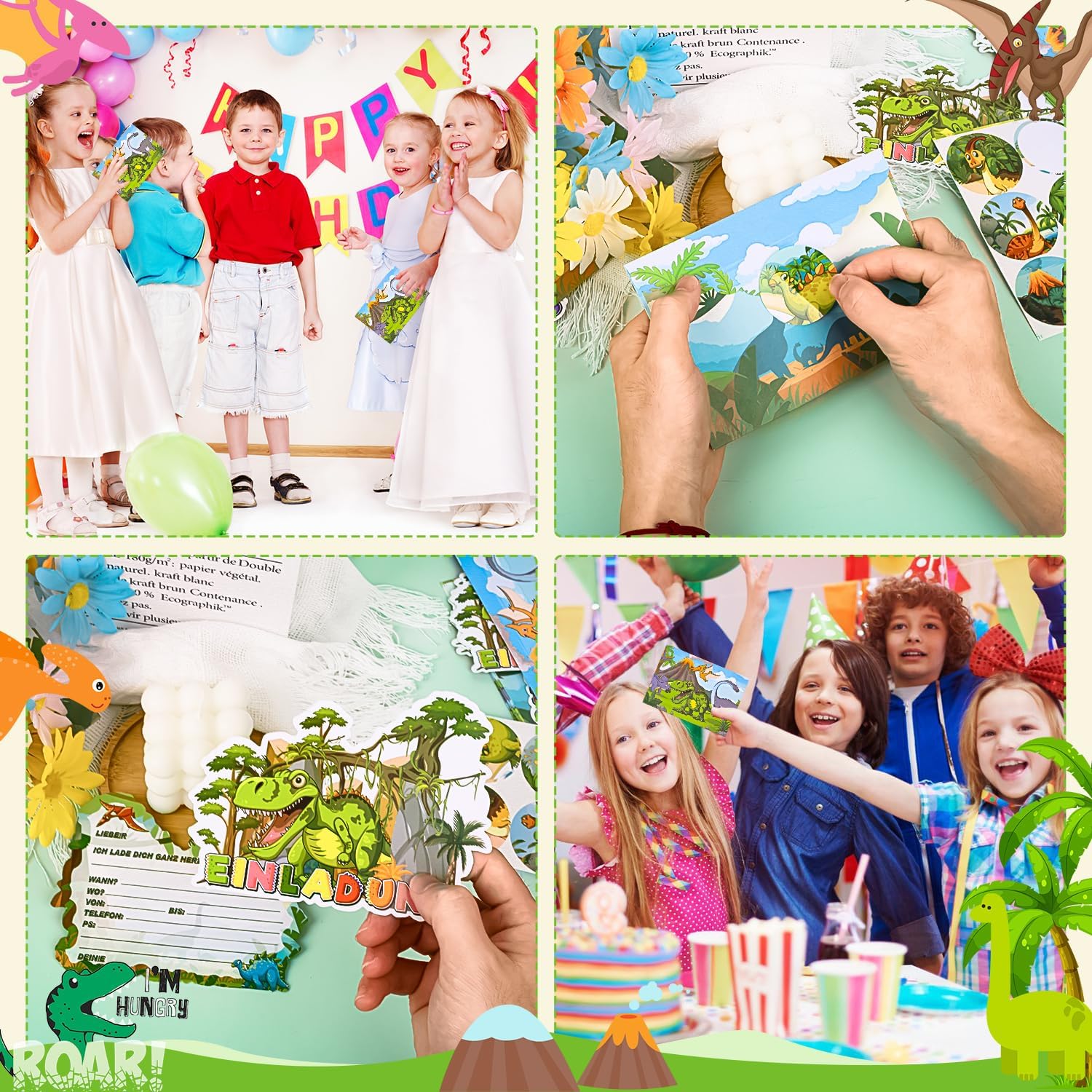 Set di biglietti di invito dinosauro: riceverete 12 biglietti d'invito a dinosauro, 12 buste dinosauri e 12 adesivi rotondi con sigillo dinosauro. Ogni biglietto di invito a forma di dinosauro e ogni busta di dinosauro è bello e unico, una vera attrazione e garantisce immediatamente l'atmosfera della festa Tema dinosauro: i biglietti d'invito Dino sono un'ottima scelta per un compleanno di bambini con tema dinosauro. Il design colorato con i simpatici motivi dinosauri entusiasma immediatamente e si adatta perfettamente a qualsiasi festa di dinosauro Lavorazione di alta qualità: gli inviti per compleanno per bambini Dino sono realizzati in carta riciclabile di alta qualità e sono robusti e durevoli. La speciale stampa garantisce una visualizzazione chiara e nitida dei motivi, rendendo le carte ancora più attraenti. Inoltre, la lavorazione è di prima classe, che dà l'impressione di professionalità ️Formato pratico: l'invito di compleanno per bambini Dino offre molto spazio per tutte le informazioni importanti come data, ora, luogo e dettagli di contatto. I biglietti sono scrivibili con tutte le penne comuni, quindi personalizzare i tuoi inviti è molto semplice. Ciò facilita notevolmente la preparazione e garantisce un aspetto uniforme Ampia gamma di utilizzi: adatto per feste a tema dinosauro, feste di compleanno per bambini, feste di festa, ecc., Può essere utilizzato come decorazione a dinosauro o invito a feste. Lascia che i tuoi figli compilino adorabili biglietti d'invito a dinosauri e organizzino una festa di dinosauro unica