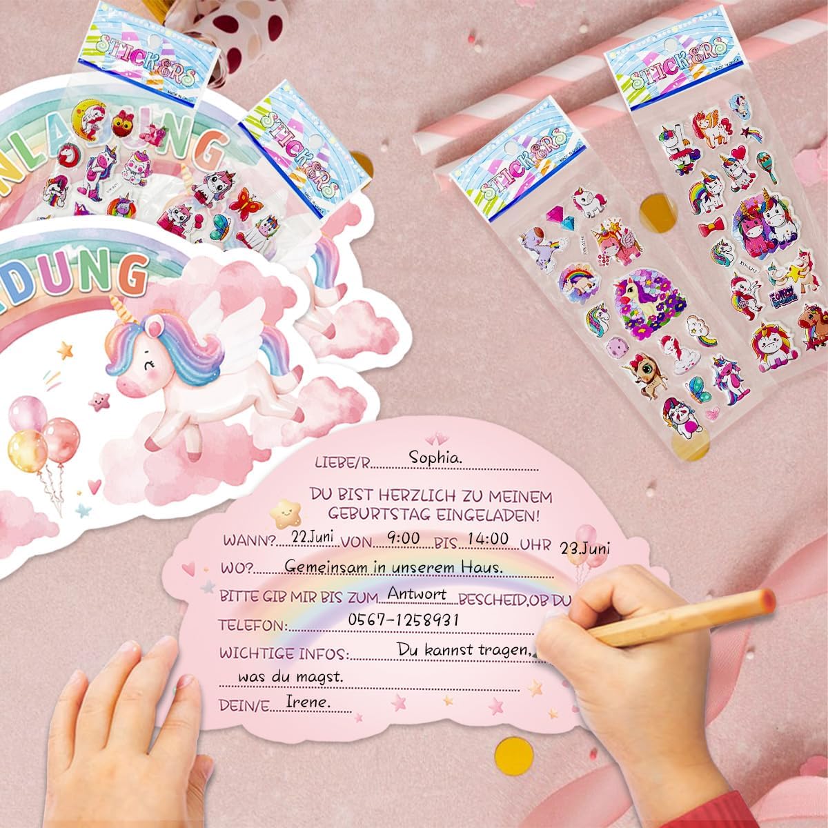 Contenuto della confezione: il nostro set contiene 12 biglietti d'invito a forma di unicorno dal design unico e 4 pezzi. Adesivi 3D a forma di unicorno, particolarmente adatti per feste per bambini. Che si tratti di compleanni, feste di unicorno o inizio della scuola, questi biglietti sono il primo passo per una festa indimenticabile per le bambine. Risparmia tempo: le caselle di testo prefabbricate con spazi vuoti sono facili da capire e consentono di riempire le carte in modo facile e veloce. Alta qualità: realizzati in carta di rame di alta qualità, i nostri biglietti offrono una base robusta. Questa sensazione di alta qualità lo rende un biglietto d'invito perfetto per feste di compleanno per bambini. Gli adesivi 3D possono essere utilizzati come bomboniere, ricompensa quotidiana, ecc. Utilizzo versatile: i biglietti d'invito con unicorno sono ideali per diverse occasioni. Perfetto per feste di compleanno per bambini, feste scolastiche, feste estive, feste per bambini, feste di Natale e altri eventi di festa. Garanzia di soddisfazione: siamo sicuri che sarete entusiasti dei nostri biglietti d'invito. Se avete domande, vi preghiamo di contattarci e saremo lieti di aiutarvi.