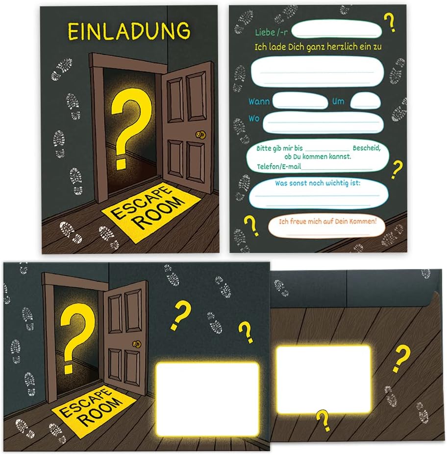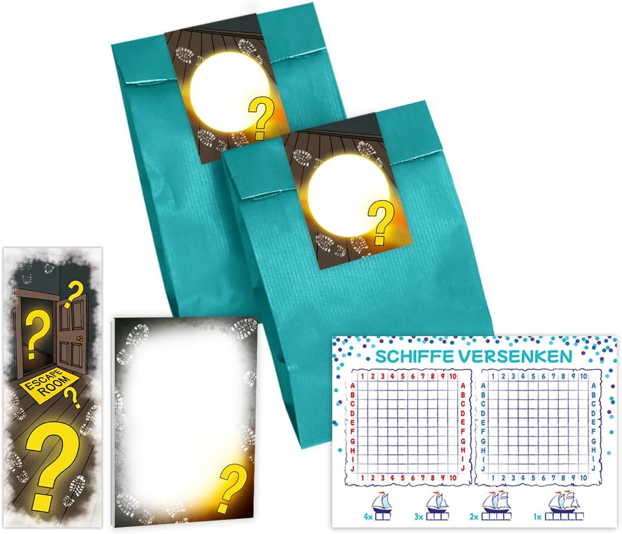 Contenuto: 12 biglietti d'invito, 12 buste, 12 segnalibri, 12 mini taccuini, 12 navi, 12 sacchetti/petrolio con 12 adesivi. Biglietti e buste: i biglietti d'invito sono moderni e progettati con molti dettagli. Sul retro troverete i campi prestampati da compilare. Il biglietto ha una dimensione di 10,50 cm x 14,80 cm (stampa 300 g/m). La busta ha una dimensione di 11,40 cm x 16,20 cm (stampa di 80 g/m) e sono adesive (con striscia adesiva). Blocchi e segnaletici: il segnalibro ha una dimensione di 5,2 x 14,80 cm, la stampa di 300 g/m è rivestito con vernice UV su entrambi i lati (lucido). Il blocco note ha una dimensione di 7,4 x 10,5 cm (DIN A7) e ha 25 fogli. Sacchetti con adesivo: i sacchetti di carta hanno una dimensione di 12 cm x 19 cm. Gli adesivi hanno una dimensione di 5,2 x 14,8 cm. I sacchetti sono ideali da riempire con piccoli regalini per feste di compleanno per bambini. Svasare le navi: i blocchi hanno una dimensione di 14,80 x 10,5 cm (DIN A6) e 25 fogli.