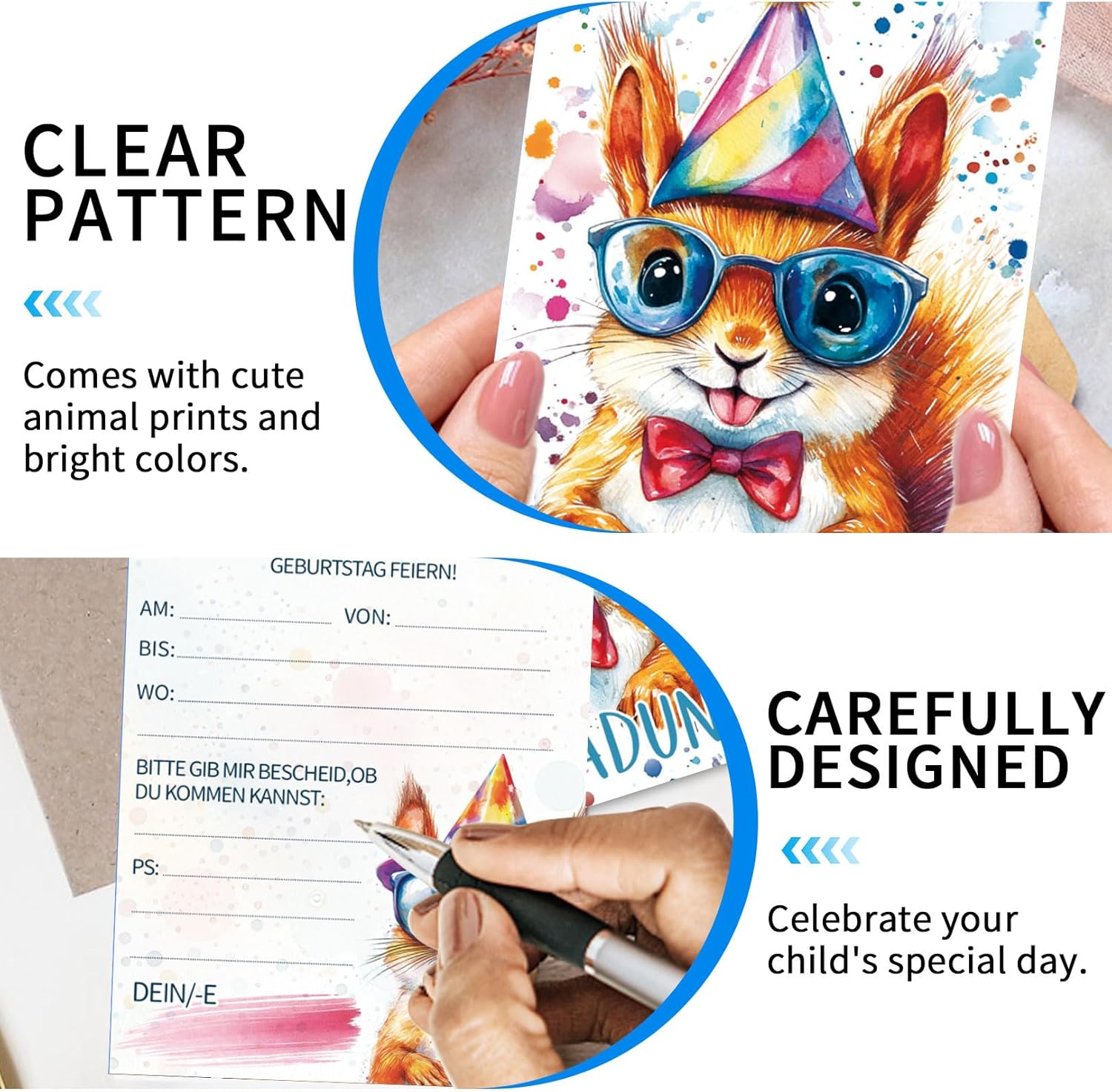 Set da 12 pezzi. Perfetto per ogni dimensione della festa dei bambini. Questo set di biglietti di invito include 12 biglietti di alta qualità, una quantità ideale per compleanni dei bambini o feste a tema animali. Che si tratti di una festa intima con 8-10 amici o di un evento più grande, i 12 pezzi sono sufficienti per invitare tutti gli ospiti senza dover acquistare extra. Così sarete ben attrezzati per la pianificazione delle feste Simpatici personaggi di animali: dagli scoiattoli al panda, per ragazzi e ragazze. Le carte convincono con un mix colorato di animali popolari: simpatici scoiattoli con code folte, volpi allegre con orecchie appuntite, gatti puliti, panda morbidi, cani giocosi e orsi soffici. Ogni motivo è disegnato con cura nei dettagli, in modo che sia i ragazzi che le ragazze si innamorino immediatamente del mondo animale, l'introduzione perfetta per una festa divertente. Colori colorati e design vivaci: visivamente accattivante e memorabile. Con colori vivaci (dal verde fresco al giallo sole fino al rosso caldo), le carte irradiano un'atmosfera allegra. La combinazione degli adorabili animali (come il panda in bianco e nero o la volpe rossastra) e sfondi colorati li rende non solo belli, ma anche leggermente evidenti, in modo che gli inviti vengano notati rapidamente e non dimenticati Pratico da usare: spazio sufficiente per tutte le informazioni sulle feste. Ogni biglietto offre spazio sufficiente per appunti scritti a mano: data, ora, luogo della festa o note speciali (ad esempio B. "Vieni con i giocattoli"). La carta robusta è resistente all'umidità e si può scrivere facilmente con penna a sfera o pennarello, senza che la scrittura cada attraverso. Il passaggio dal biglietto vuoto all'invito compilato va in pochi minuti, ideale per pianificare una festa senza stress Ideale per feste di compleanno: crea l'atmosfera della festa fin dall'inizio, sia a casa, in giardino o in una sala eventi, questi biglietti di invito con animali creano immediatamente l'atmosfera giusta per una festa di compleanno per bambini. Non sono solo inviti pratici, ma anche piccoli ricordi: gli ospiti adoreranno gli animali adorabili (dallo scoiattolo all'orso) e l'anticipazione della celebrazione aumenta immediatamente. Un mezzo semplice ma efficace per rendere la festa un evento indimenticabile.