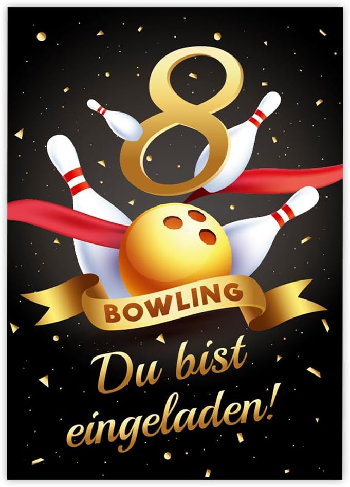 12 biglietti di invito per l'8° compleanno dei bambini, bowling, coni, inviti per bambini, 8° compleanno, incl. 12 buste, 12 sacchetti per feste, colore naturale, 12 adesivi