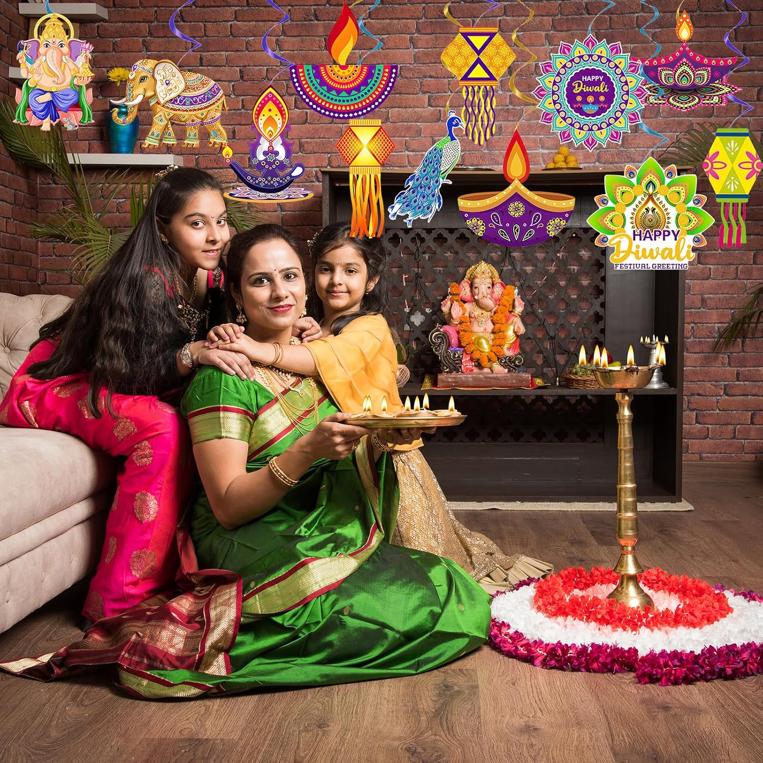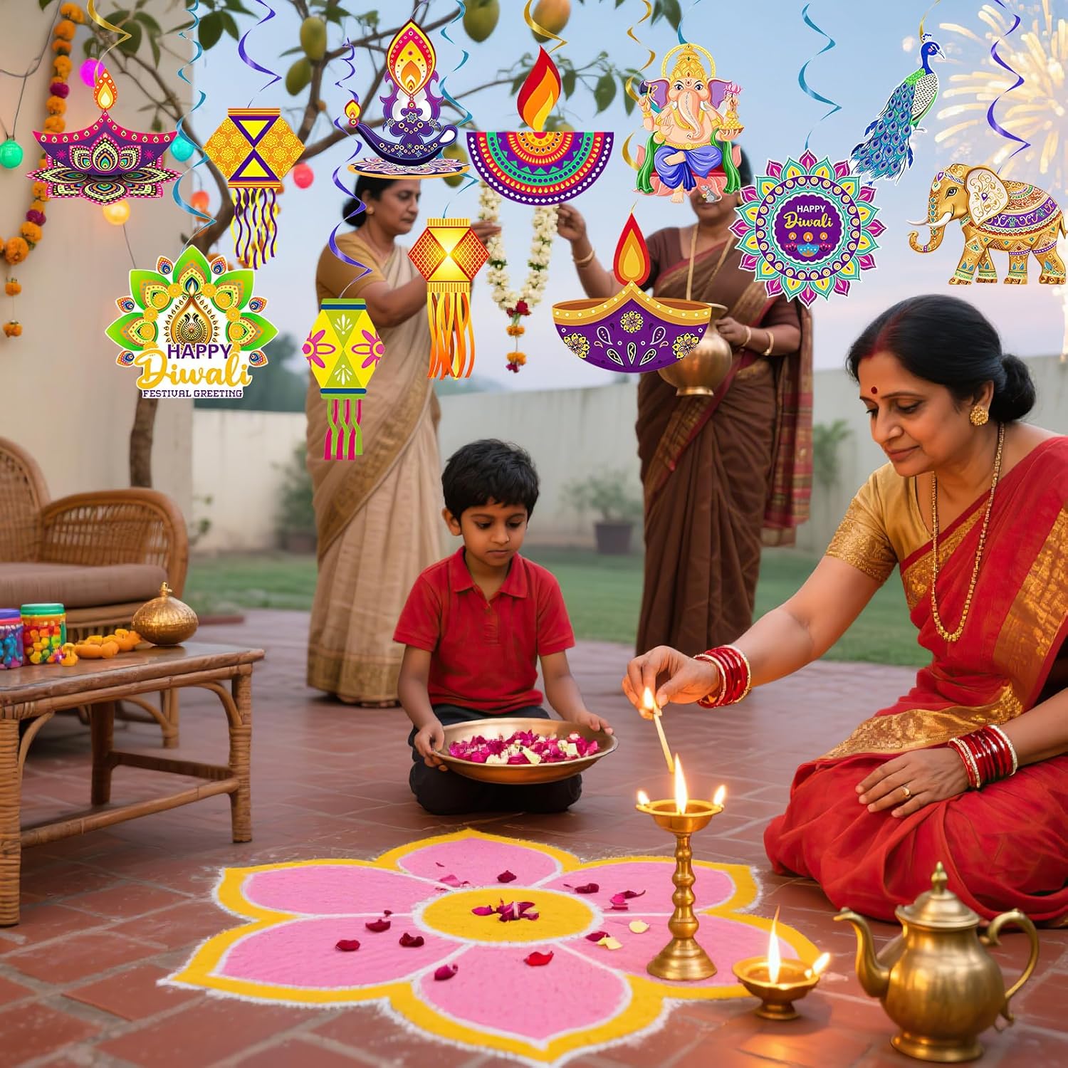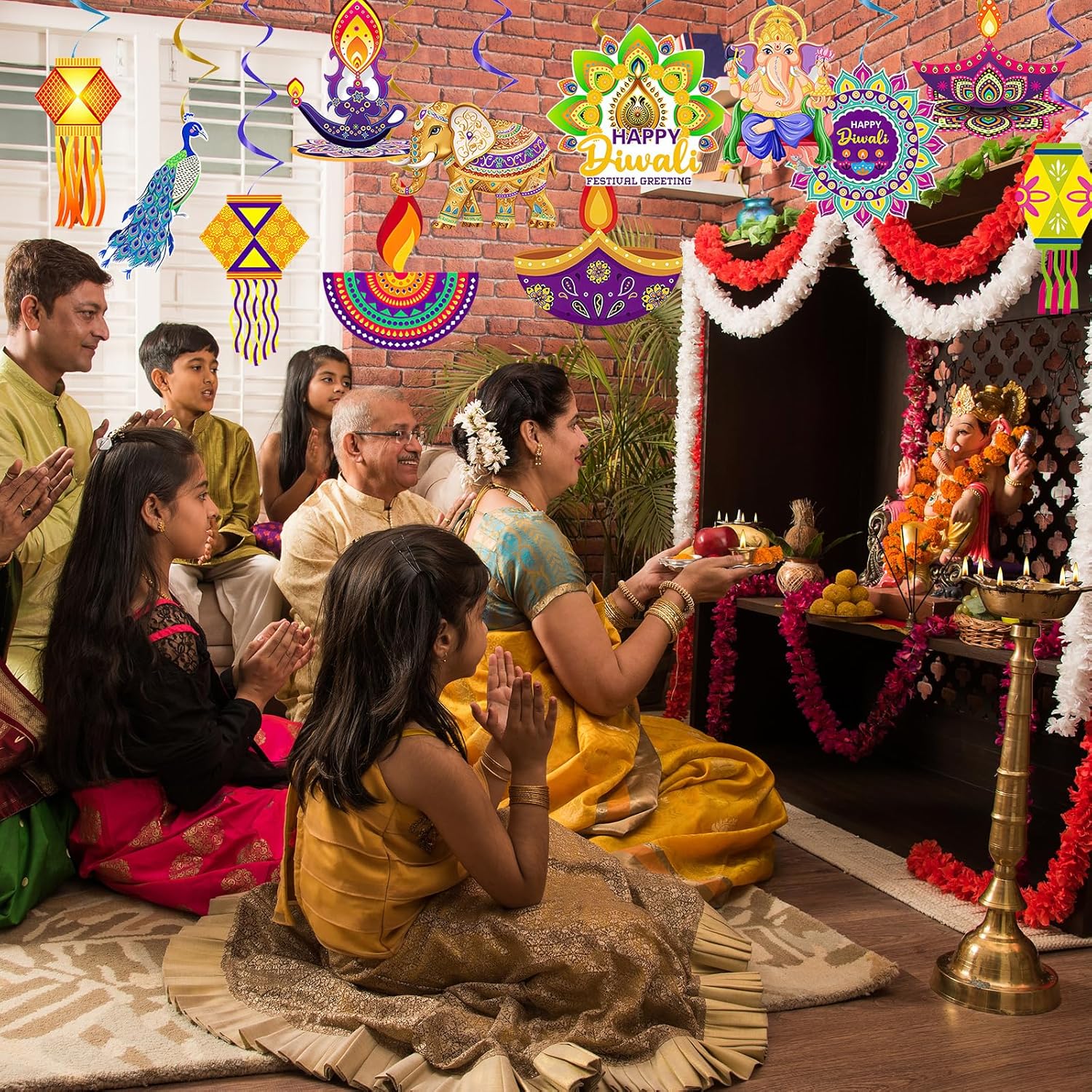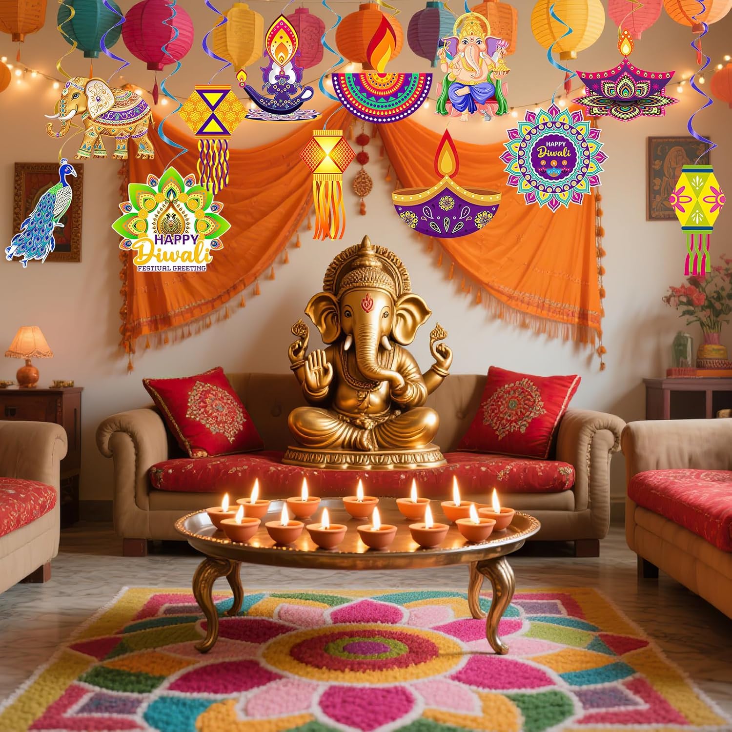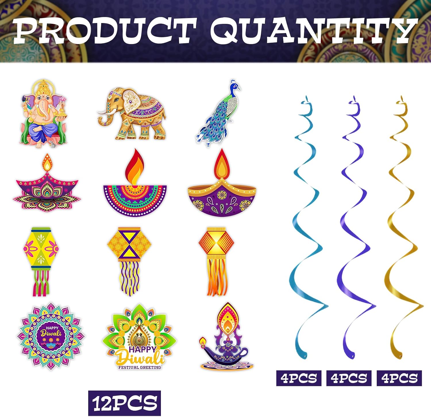 Contenuto della confezione: questo set include 12 decorazioni da appendere Diwali dal design accattivante, che misurano 12,5 x 15 cm. Queste decorazioni possono anche essere abilmente abbinate ad altre decorazioni in stile indiano per creare una forte atmosfera festiva. Materiali di alta qualità: le nostre decorazioni da appendere Diwali sono realizzate in cartoncino resistente, con motivi vivaci e colori di lunga durata. Sono riutilizzabili e affidabili, rendendoli un elemento essenziale per tutte le feste indiane Diwali. Tema indiano Diwali: le nostre decorazioni indiane Diwali presentano vari motivi a tema Diwali, rendendo queste decorazioni da appendere ancora più affascinanti e creando un'atmosfera accattivante, gioiosa ed emozionante. Facile da appendere: ogni gioiosa decorazione a spirale da appendere per feste Diwali viene fornita con un anello in lamina di plastica nella parte superiore, che la rende leggera e facile da appendere. Ideale per decorazioni per feste Diwali, celebrazioni Diwali o eventi di festival indiani, adatto sia per ambienti interni che esterni. Decorazioni multiuso per feste: utilizza queste decorazioni a spirale da appendere per trasformare qualsiasi spazio interno o esterno in un vivace evento a tema Diwali. Perfetto per decorare la casa, ospitare feste indiane Diwali, promozioni culturali ed eventi celebrativi