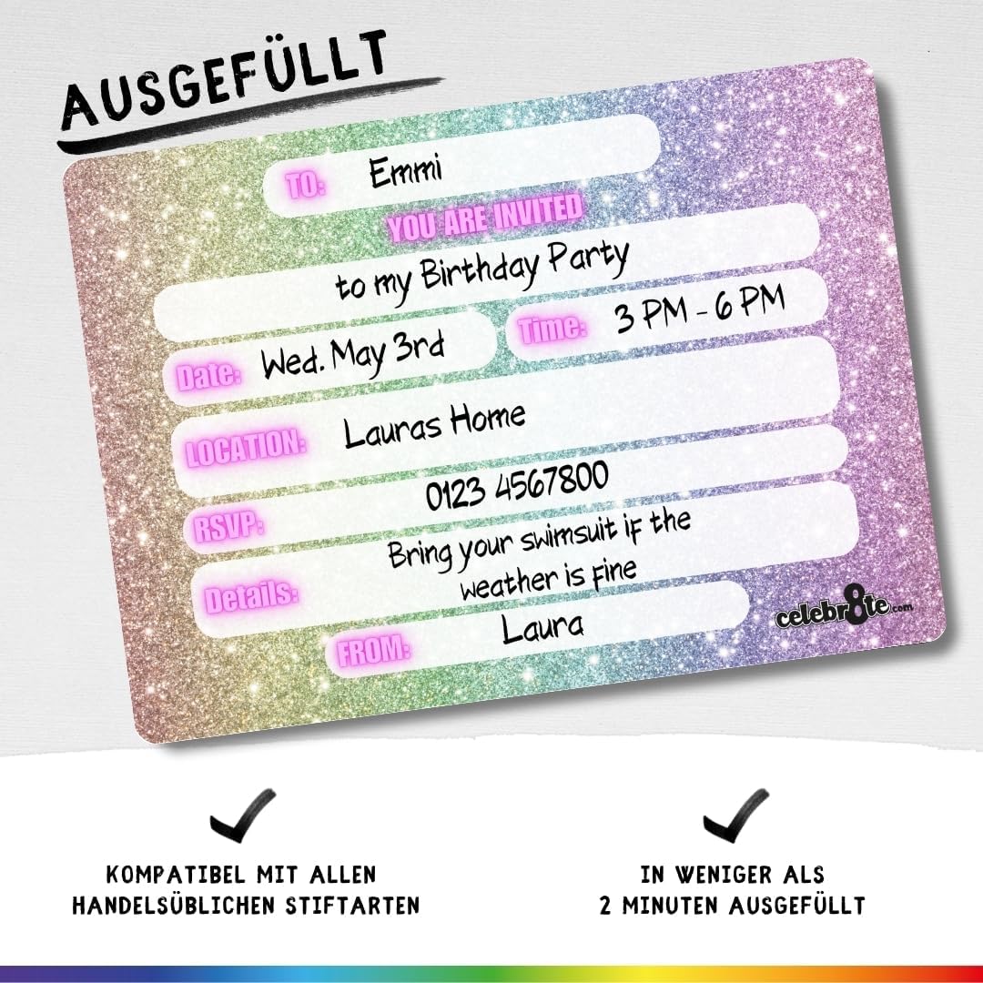 Motivo glitterato: per tutti gli amici con glitter che hanno una penna per un meraviglioso effetto luminoso. Delight all birthday guests with this cool design. Con glitter reali: per un divertimento ancora più divertente, abbiamo rifinito la parte anteriore con parziali brillantini. Veloce e facile da riempire – Super facile da riempire grazie ai campi predefiniti! Even larger groups of children can be invited quickly and easily! Materiale di alta qualità: stampato su carta robusta da 350 g. La parte anteriore è parzialmente rifinita con brillantini, mentre la parte posteriore può essere scritta con tutte le penne standard This is what you get – 12 x glitter invitation cards, alta qualità stampate in formato cartolina DIN A6 (105 x 148 mm). Made in Germany – stampa climatica neutra.