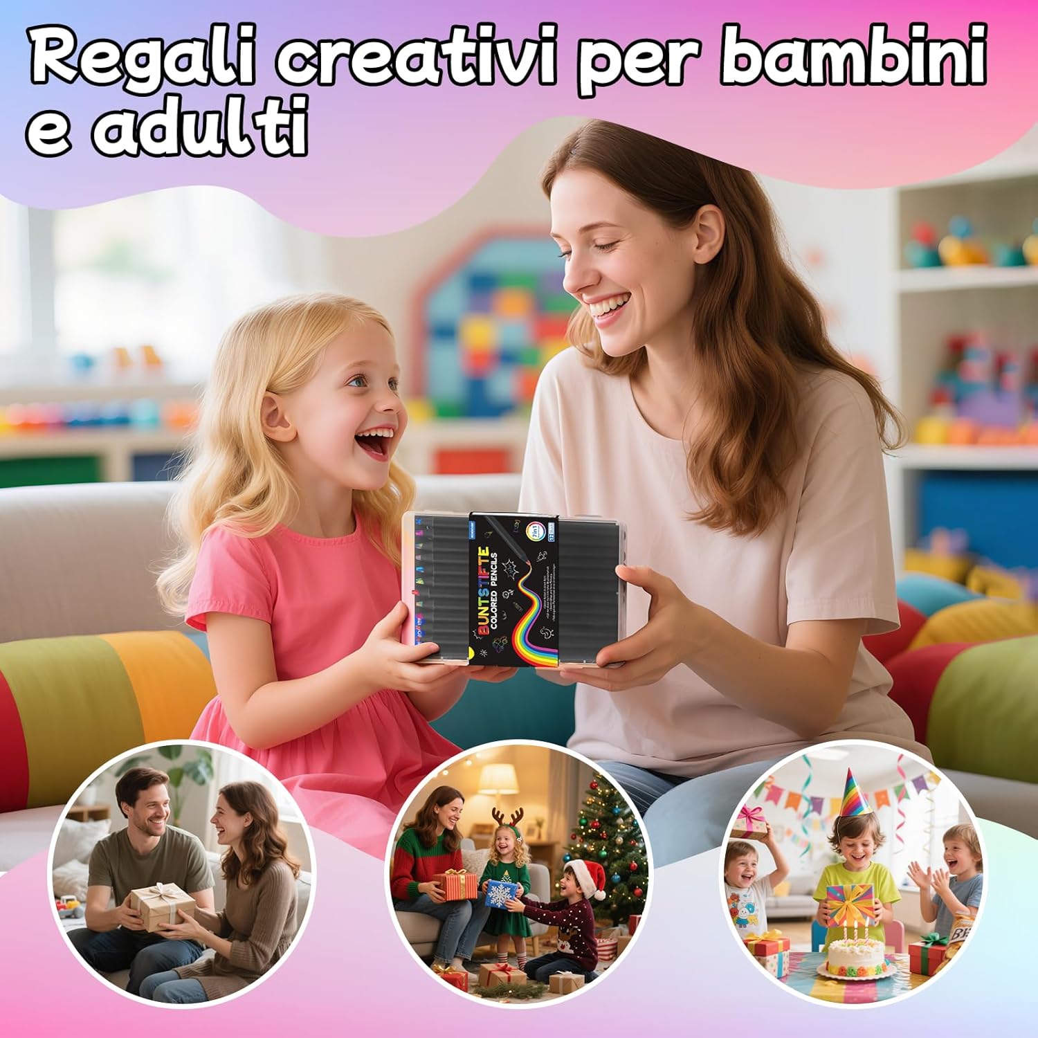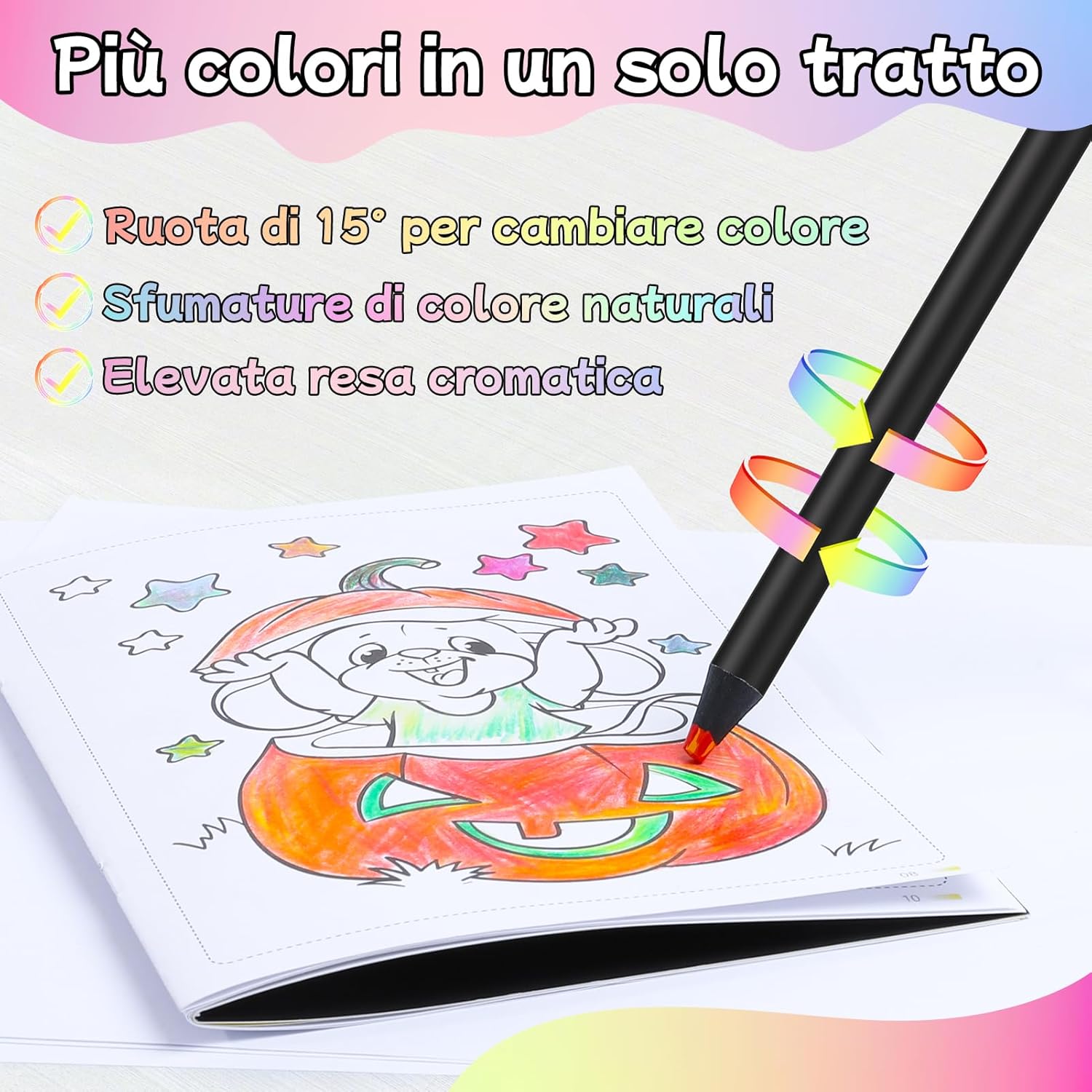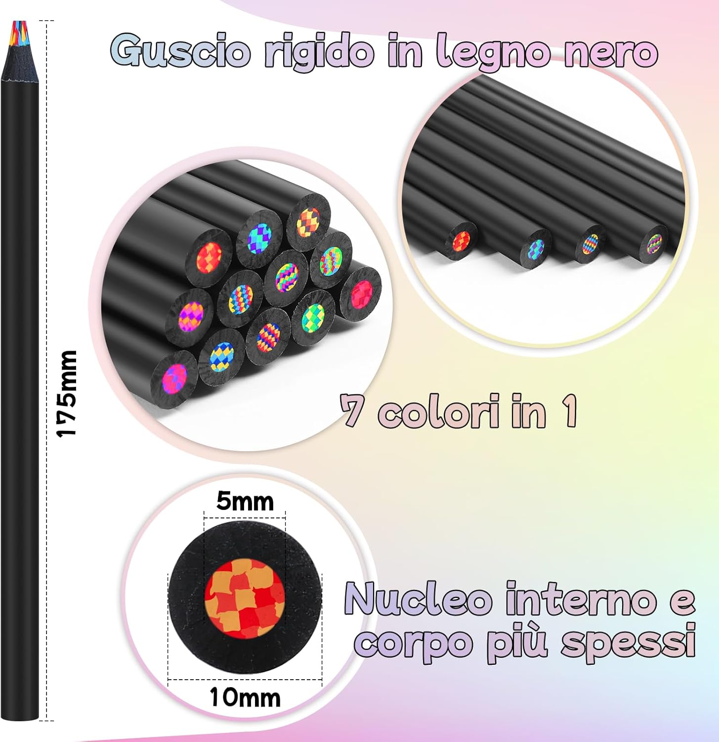 Matite colorate 7 in 1: le matite colorate ECHOCUBE uniscono sette tonalità in un unico nucleo. Basta ruotare la penna durante il disegno per ottenere sfumature delicate che faranno brillare libri da colorare, biglietti di auguri o album di ritagli con colori vivaci. Matite da disegno sicure e durevoli: il nucleo spesso 0,5 cm, in grafite di alta qualità e legno infrangibile, è infrangibile anche per mani più piccole ed entusiaste, per un divertimento duraturo. Impugnatura ergonomica e confortevole: con una superficie opaca antiscivolo che offre ai bambini una presa stabile. Il corpo della penna ha lo spessore perfetto per le mani piccole, quindi non si stancheranno anche dopo un uso prolungato. Goditi ore di disegno confortevole. Creatività in molte situazioni: sia per il fai da te a casa, per disegnare in dettaglio a lezioni di arte o come piccoli regali per i bambini in viaggio, le matite colorate ECHOCUBE per bambini stimolano l'immaginazione ovunque. Regalo ideale per ragazzi e ragazze: il set di matite arcobaleno ECHOCUBE per bambini viene fornito in una confezione riciclabile ed è pronto per sorprese. Dalle calze natalizie alle sorprese per l'inizio della scuola, puoi metterle direttamente nelle calze o nei sacchetti regalo per bambini senza imballaggi aggiuntivi.