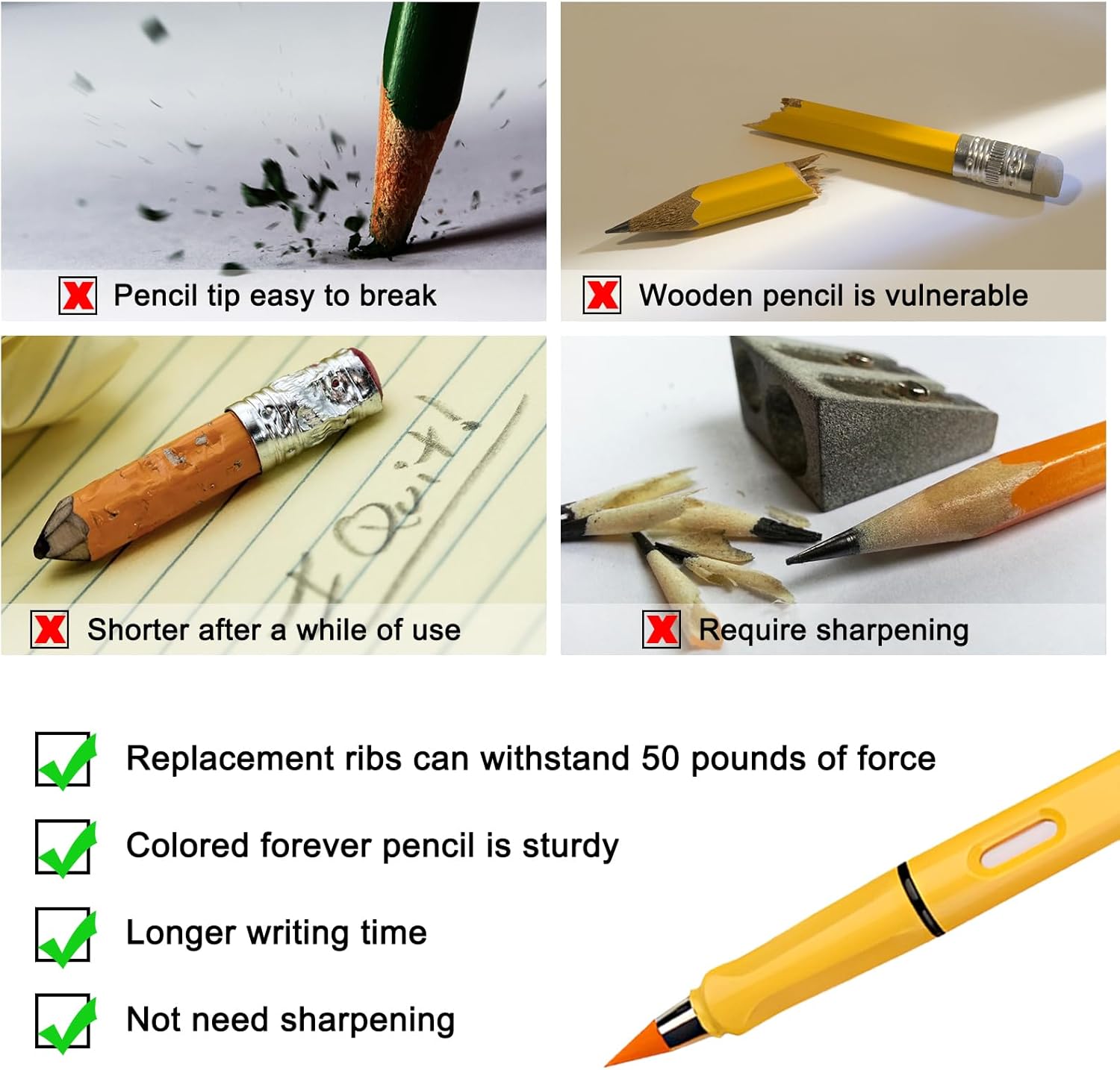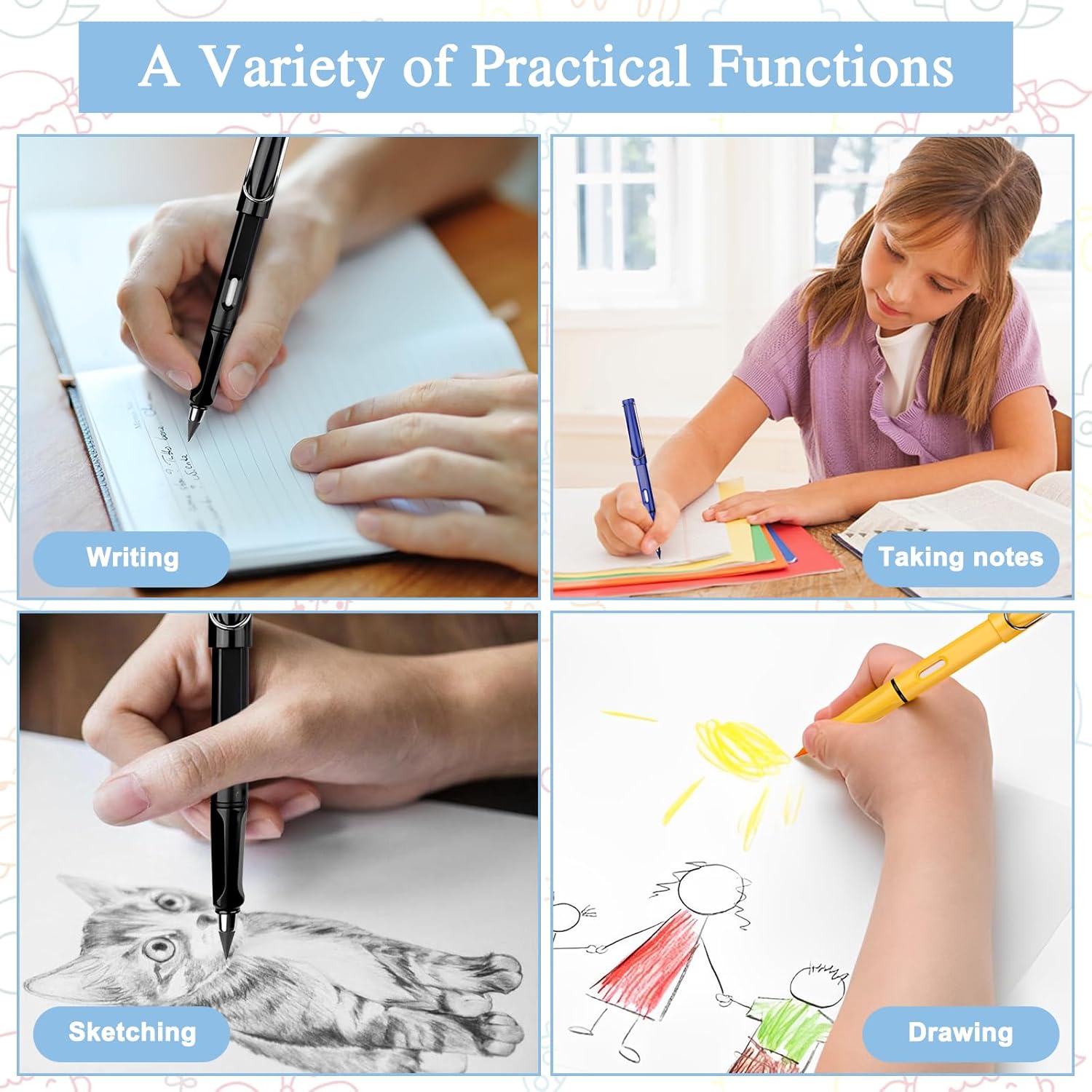 Contenuto della confezione: 12 matite colorate eterne, con 1 gomma integrata in ogni penna. Offriamo anche 24 penne di ricambio (12 colori), 2 pezzi di ogni colore, colori ricchi possono soddisfare le tue diverse esigenze e rendere il tuo processo creativo più divertente. Materiale di alta qualità: la molla permanente è realizzata in materiale ABS, qualità affidabile, riutilizzabile, leggera, resistente e confortevole, non facile da rompere o sbiadire. Rispetto alle tradizionali matite in legno, le matite permanenti sono più resistenti senza la necessità di affilare. Diversi colori: il nostro set di matite Forever contiene 12 colori vivaci. 6 pratici colori: nero, rosso, blu, verde, rosa, giallo, viola, giallo chiaro. 4 colori morandi: morandi rosa, verde morandi, blu morandi e verde vintage. Il nostro set di matite senza inchiostro non solo soddisfa le esigenze quotidiane dei bambini, ma è anche una grande aggiunta agli appunti in classe. Durevole e durevole: ogni matita senza inchiostro sostituisce 159 matite colorate tradizionali in legno, matite illimitate scrivono 180 volte più a lungo delle normali matite, risparmiando la tempera delle matite e risparmiando denaro sulle matite. Regalo per l'inizio della scuola: le matite infinite con gomma possono essere ampiamente utilizzate per scrivere, disegnare, prendere appunti, diari e altri progetti artistici, adatte per studenti, insegnanti, falegnami, designer, ecc., Un regalo ideale per tutti i bambini, studenti e artisti appassionati di arte.