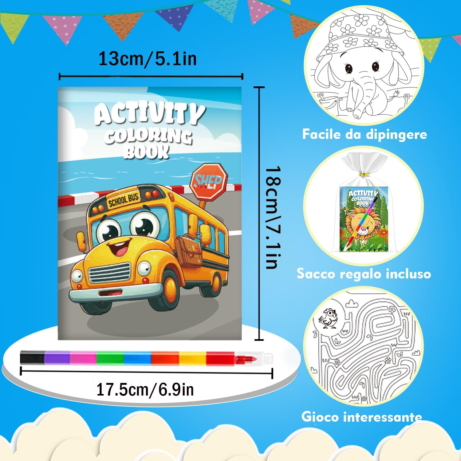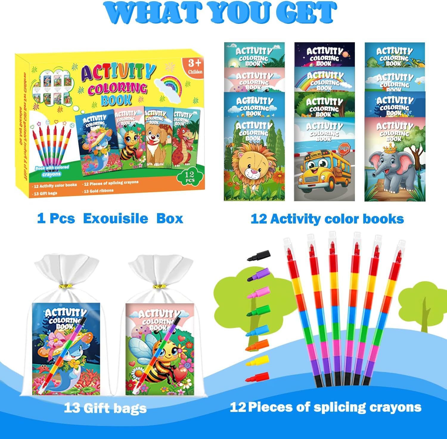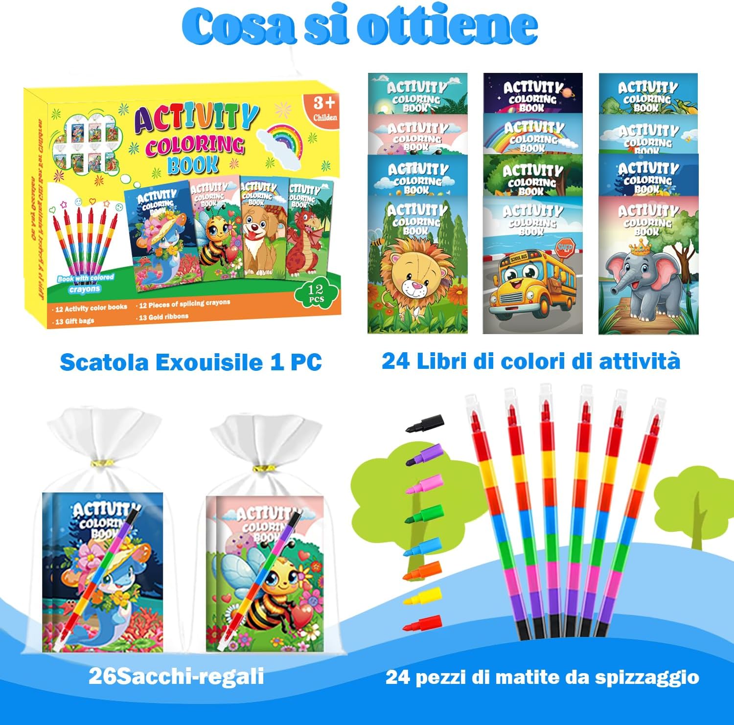 【12 Libri da Colorare Bambini e Pastelli a Cera Impilabili】 Il regalo perfetto per una festa di compleanno per bambini o un regalo d'addio all'asilo. set album da colorare per bambini contiene 12 mini libri da colorare, 12 matite colorate impilabili in 8 colori, 12 sacchetti regalo, 12 nastri dorati e 1 elegante confezione regalo – ideale come contenuto per sacchetti regalo, come premio per le classi scolastiche o come regalo per feste di compleanno, feste e ricorrenze 【Gadget Compleanno Bambini】 Questi libri di attività hanno una dimensione di 13 × 18 cm. Il set viene fornito con sacchetti regalo abbinati e nastri dorati, perfetti per intrattenere i bambini ai matrimoni, come regali di compleanno per bambini,come regalini fine festa compleanno 【Libro da Colorare per Bambini】 Il libricini da colorare bambini gadget contiene 72 giochi e 72 pagine da colorare, informativi e divertenti per bambini e bambine di 3, 4, 5, 6, 7 e 8 anni. È adatto per intrattenere i bambini durante i viaggio in auto o in aereo o al ristorante, migliorare le loro capacità di gioco, promuovere le loro abilità di disegno e la loro creatività, allenare le loro capacità di ragionamento e migliorare le loro abilità pratiche 【Regali Versatili per Ogni Occasione】Acquista senza fatica grandi quantità di regali! Ideale come regalo di fine anno scolastico, regalo di Natale, regalo di compleanno, regalo di San Valentino per bambini, regalo di Pasqua, dolcetto di Halloween, gadget festa compleanno bambini, idea regalo di nozze per bambini o regalo per le vacanze estive per studenti, regalo di addio all'asilo per bambini 【Divertenti e Convenienti】Questi libri da colorare per bambini con motivi di dinosauri, animali, animali domestici, frutta e automobili offrono un intrattenimento economico ma creativo. Questo pacchetto conveniente garantisce ore di tranquilla occupazione per i bambini a casa o a scuola ed è un must