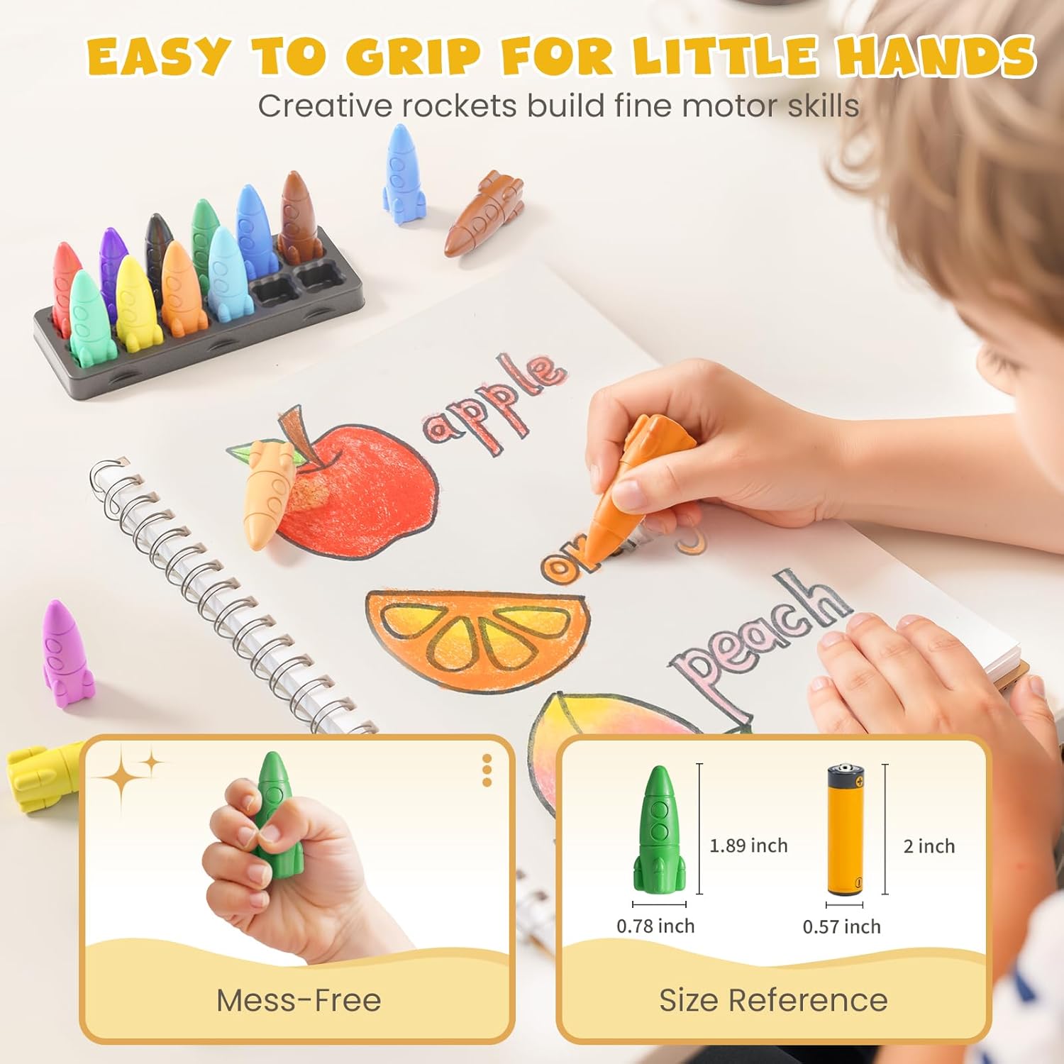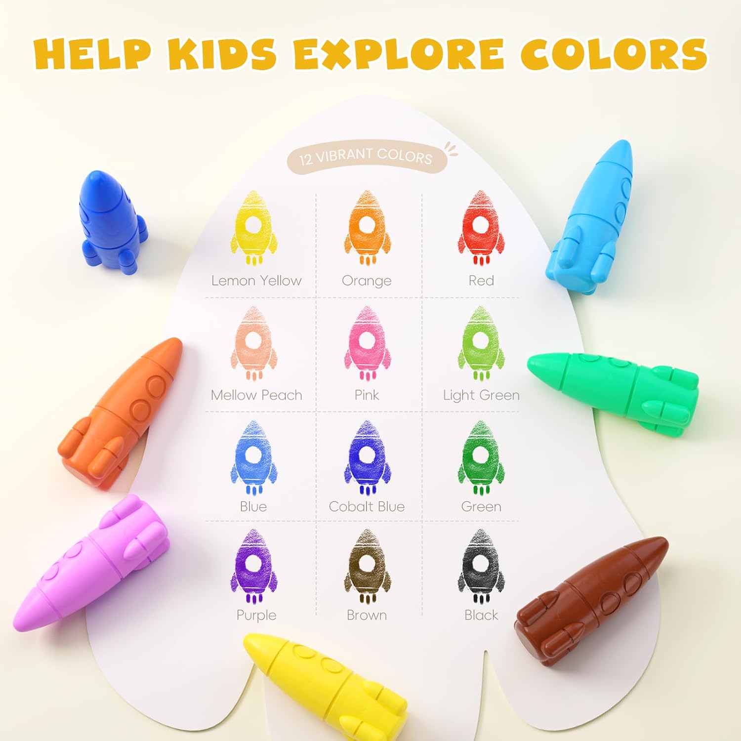 Colori lisci e luminosi: include 12 vivaci pastelli per bambini, 30 divertenti adesivi premio e 108 pagine da colorare PDF per ore di gioco creativo! I bambini possono scatenare il loro artista interiore con 12 colori ricchi mentre imparano il riconoscimento dei colori, migliorando la coordinazione occhio-mano e praticando le abilità di presa. Questi pastelli setosi scivolano senza intoppi, rendendo la colorazione e lo scarabocchio facili e divertenti, perfetti per stimolare immaginazione e creatività durante quei preziosi primi anni Sicuro e atossico: soddisfa gli standard di sicurezza ASTM F963-16/17, CPSIA e EN71-3. Questi pastelli e pastelli atossici per bambini sono perfettamente sicuri per i piccoli artisti per esplorare i colori, sviluppare abilità visive e imparare il riconoscimento dei colori. Si raccomanda la supervisione di un adulto per bambini sotto i 3 anni Comodi e facili da impugnare: perfetti per le mani piccole, questi pastelli scivolano senza intoppi per rendere la colorazione più divertente. Dimensioni giuste per bambini di età compresa tra 1 e 3 e 2 – 4 anni a 4,8 cm di altezza e 2 cm di larghezza, facile da tenere e controllare. La forma unica a razzo impedisce loro di rotolare giù dal tavolo. Costruito resistente e durevole, non si rompe o si crepa facilmente, anche in caso di caduta Senza disordine e facili da pulire: i nostri pastelli colorati lavabili senza disordine sono i preferiti dai genitori. Sono senza disordine e non macchiano le mani piccole. I segni del pastello si lavano facilmente da pelle, vestiti e tappeti con sapone delicato e acqua calda, senza macchie ostinate lasciate indietro. Lascia che il tuo bambino crei liberamente mentre ti godi la tranquillità. Questi pastelli grossi sono perfetti per colorare per un divertimento creativo di lunga durata a casa, a scuola o all'asilo nido 120 pagine da colorare e adesivi incoraggianti: scansiona il codice QR sulla scatola per scaricare 120 pagine da colorare gratuite con 10 temi divertenti con vari livelli di difficoltà per aiutare i bambini a sviluppare le loro abilità di disegno passo dopo passo. Inoltre, 30 adesivi ricompensa animali luminosi con messaggi positivi motivano i piccoli artisti, rendendo facile per genitori e insegnanti lodare la creatività e aumentare la fiducia dei bambini quando finiscono un disegno o fanno un grande sforzo Regalo perfetto per il ritorno alla scuola: questi pastelli a razzo sono un regalo ideale per bambini e piccoli artisti di tutte le età, ideali per compleanni, Halloween, Natale e molto altro ancora. Perfetto per bambini, bambini dai 4 agli 8 anni, famiglie e studenti. Compatti e portatili, si adattano facilmente agli zaini: ideali per l'uso in classe, viaggi e divertimento all'aperto. Che si tratti di scuola materna, asilo o asilo nido, questi pastelli sono un must per insegnanti e bambini!
