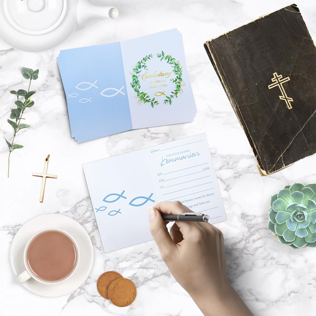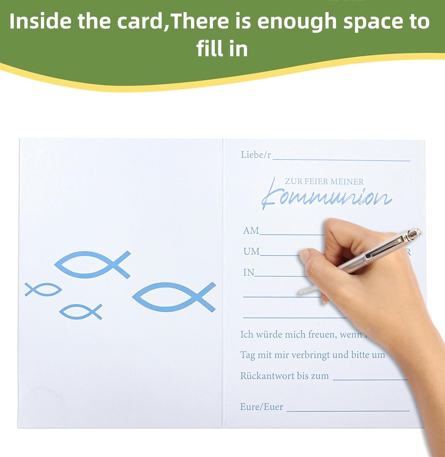 【Biglietti di Invito per Comunione】:Riceverete 12 Biglietti di Invito per Comunione con un affascinante disegno di pesci e battesimi in oro, insieme a 12 buste e 12 adesivi coordinati. La Prima Comunione è una tappa importante nella vita di un giovane cristiano, un invito a un momento di fede indimenticabile. 【Materiali di Qualità】:I nostri Biglietti di Invito per Comunione sono realizzati in carta di alta qualità, dura e resistente alle pieghe, con stampe chiare e belle. Il biglietto di invito alla comunione offre spazio sufficiente per il vostro testo personale per registrare il luogo, l'ora e altri dettagli della celebrazione. 【Design Unico】: I nostri Biglietti di Invito per Comunione sono eleganti e neutrali rispetto al genere, progettati con eleganti motivi a foglia, bellissimi pesci di comunione e caratteri di conferma con effetto foil per creare un'atmosfera sacra e festosa. Offrono spazio sufficiente per scrivere o stampare il proprio testo. 【Perfetto per la Comunione】:Inviti Festa della prima Prima Comunione ha molto spazio per tutte le informazioni importanti sulla celebrazione della Prima Comunione: luogo, data, ora e altri dettagli possono essere aggiunti facilmente. Questo biglietto d'invito alla comunione è il modo perfetto per invitare gli ospiti alla speciale festa della prima comunione del vostro bambino. 【Versatile】:Questi Biglietti di Invito Alla Comunione sono adatti per una varietà di occasioni, come battesimi, comunioni, cresime, feste di compleanno per bambini, o feste in giardino, ecc, per comunicare le vostre aspettative ai vostri ospiti.