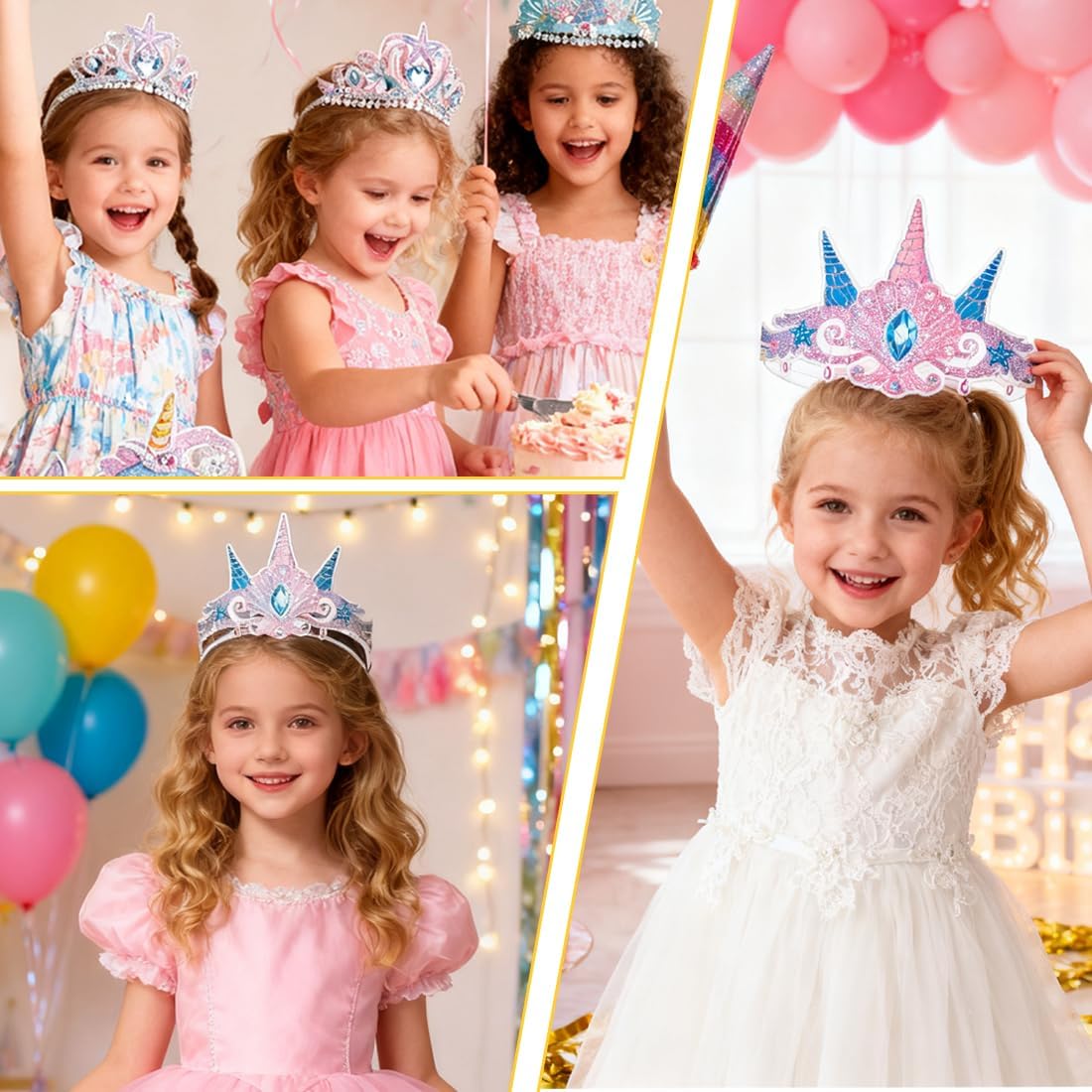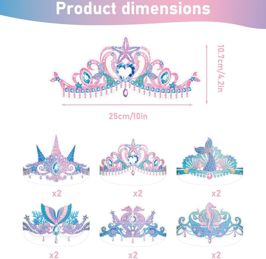 Design accattivante a tema sirena: Include 6 diversi motivi di sirena con colori vivaci e dettagli incantevoli come code di sirena, strass viola e blu, stelle marine, conchiglie, coralli e cavallucci marini. Questi design creano un'atmosfera da sogno ispirata al mondo marino, perfetta per rendere unica la tua festa di compleanno a tema sirena Materiale di alta qualità: Le corone di compleanno a tema sirena sono realizzate in robusto cartoncino con una lavorazione raffinata. Sono ben stampate, resistenti al colore e durevoli, rendendole ideali per essere conservate come ricordo o riutilizzate per altre occasioni speciali Set completo: Il set comprende 12 cappelli da festa a tema sirena in 6 design diversi, insieme a 12 nastri abbinati. Questa quantità è sufficiente per soddisfare le esigenze di una festa a tema sirena, creando momenti indimenticabili per bambini e ospiti Facile da assemblare: Le corone a tema sirena sono semplici da montare, basta infilare i nastri attraverso i due fori presenti sulla corona. Questo permette a bambini e adulti di indossarle rapidamente e godersi la festa senza perdere tempo in preparativi complicati Uso versatile: Queste eleganti corone di compleanno a tema sirena sono perfette per feste a tema sirena, compleanni, eventi scolastici o feste in maschera. Aggiungono un tocco di magia e divertimento a qualsiasi celebrazione e si abbinano perfettamente ai vestiti a tema sirena per bambine