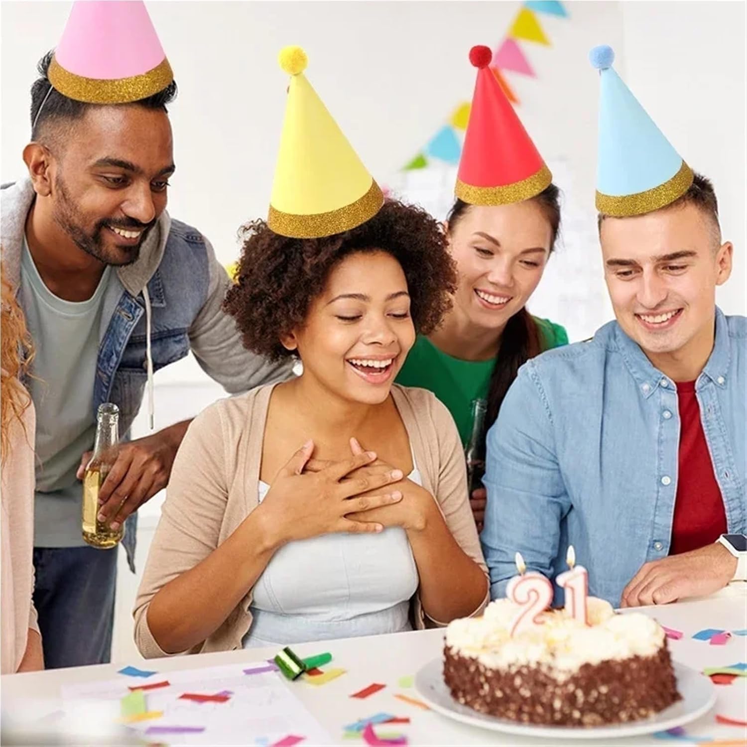 ACCESSORIO DIVERTENTE PER CELEBRAZIONI: I cappelli di compleanno sono un accessorio divertente per celebrazioni che aggiunge un elemento di gioia, rendendo ogni evento vivace e piacevole per ospiti di tutte le età VERSATILI PER OGNI OCCASIONE: Questi cappelli di compleanno sono versatili per ogni occasione, adatti per compleanni, anniversari o qualsiasi raduno festivo dove il divertimento è una priorità FACILI DA INDOSSARE: Progettati per il comfort, i cappelli di compleanno sono facili da indossare e rimangono saldamente in posizione, permettendo a tutti di godersi le festività senza distrazioni VARIETÀ COLORATA: Disponibili in una varietà di colori, questi cappelli di compleanno migliorano l'atmosfera della festa e possono facilmente adattarsi a diversi temi o schemi di colori per la tua celebrazione TEMA FESTIVO CREATIVO: Con i cappelli di compleanno, puoi creare un tema festivo creativo che incoraggia gli ospiti a esprimersi e a partecipare al divertimento, creando ricordi indimenticabili