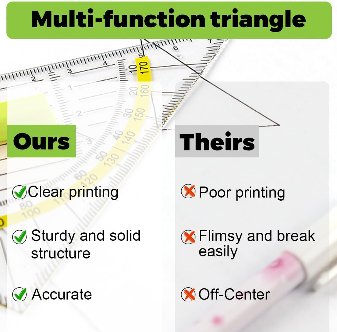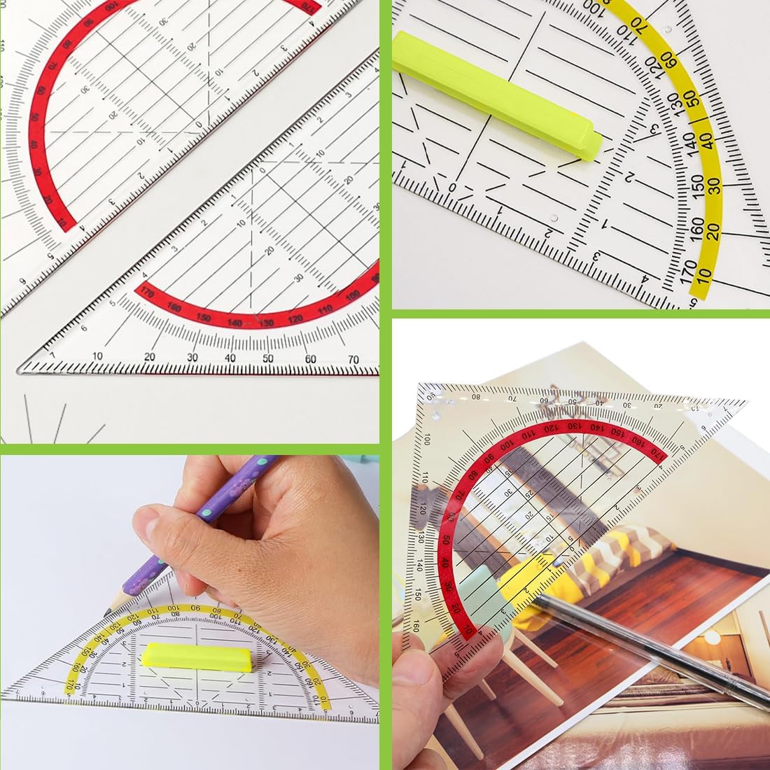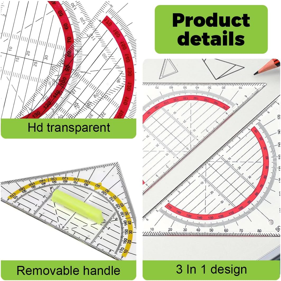 Materiale trasparente ad alta definizione: realizzato in materiale altamente trasparente, non blocca la linea visiva del disegno e permette di cogliere con precisione la posizione del disegno e la direzione della linea, migliorando l'efficienza e la precisione del disegno. Design multifunzionale 3 in 1: integrando più funzioni di disegno in una sola, è in grado di soddisfare le diverse esigenze di disegno, come la misurazione degli angoli, il disegno di linee rette, il disegno geometrico, ecc. Maniglia staccabile: design umanizzato della maniglia staccabile, facile da riporre e trasportare; comoda da tenere in mano dopo l'installazione, stabile e antiscivolo durante il disegno, più comoda da usare. Scala chiara e precisa: la scala è stampata in modo chiaro e accurato e l'angolo e la lunghezza sono chiaramente indicati, evitando così errori di lettura e garantendo un'elevata precisione nella misurazione e nel disegno, sia per il lavoro di disegno degli studenti che per quello dei professionisti. Struttura robusta e durevole: la struttura è forte e robusta, utilizza materiali durevoli di alta qualità, resistenti alle cadute e all'usura, non è facile da deformare e danneggiare e può essere utilizzata per lungo tempo, fornendo un supporto duraturo e affidabile per le vostre esigenze di disegno.