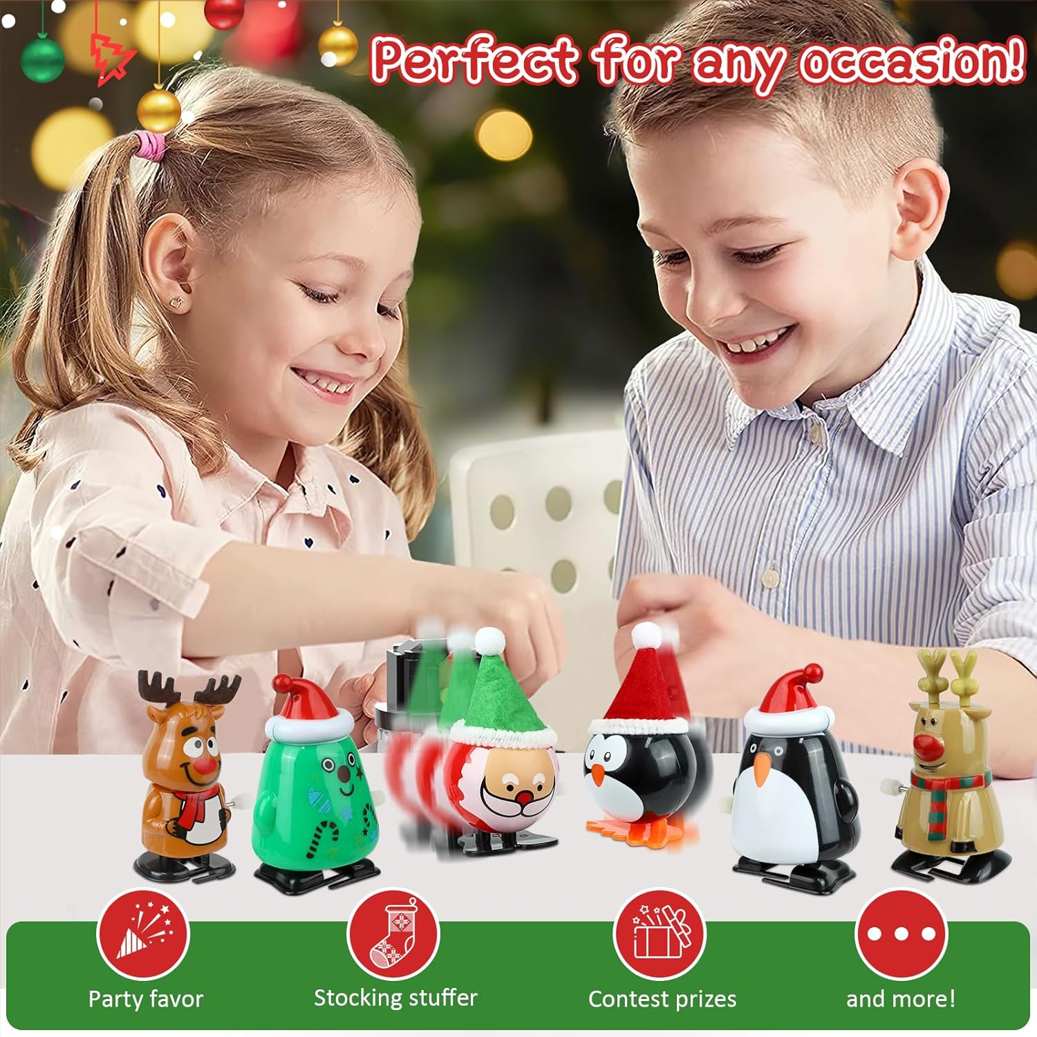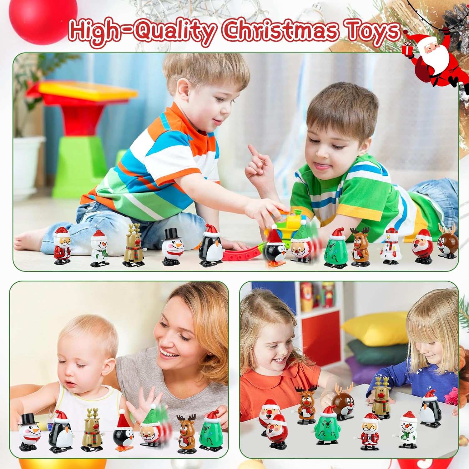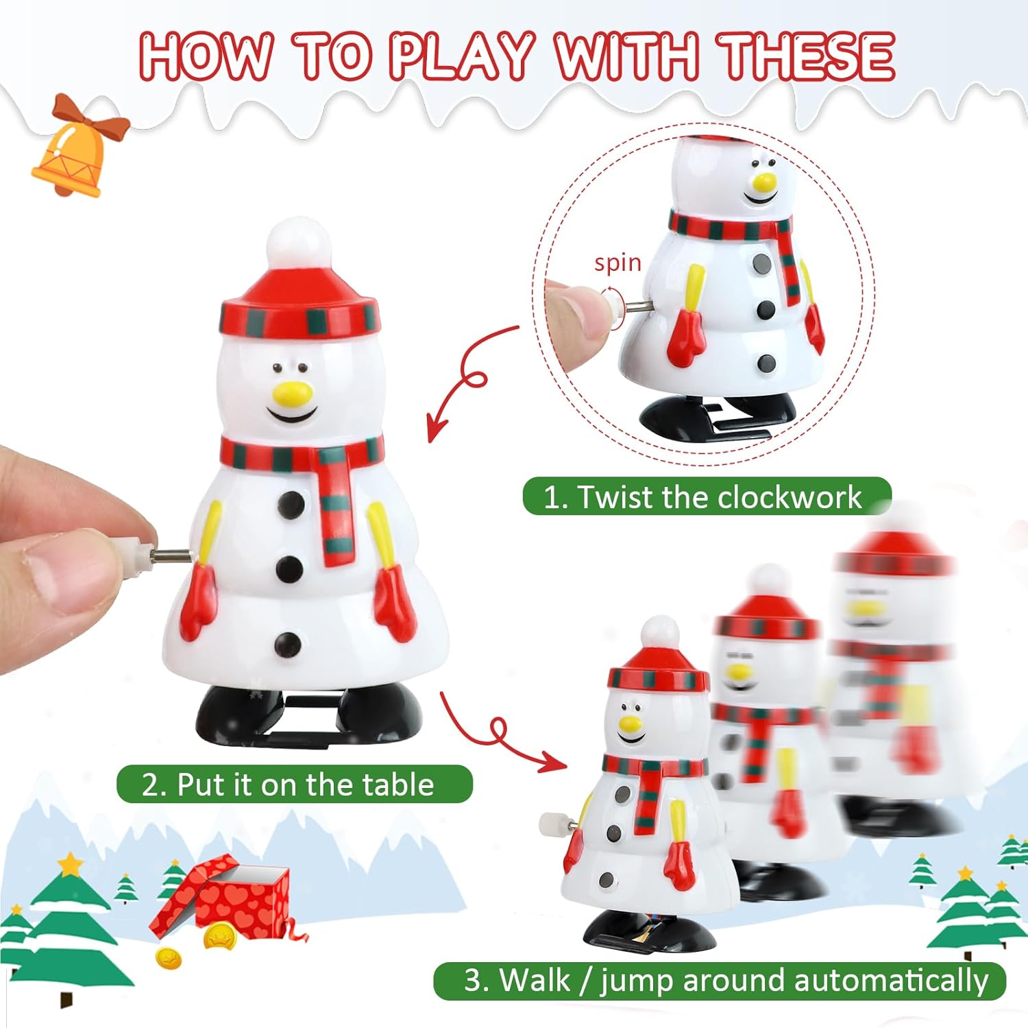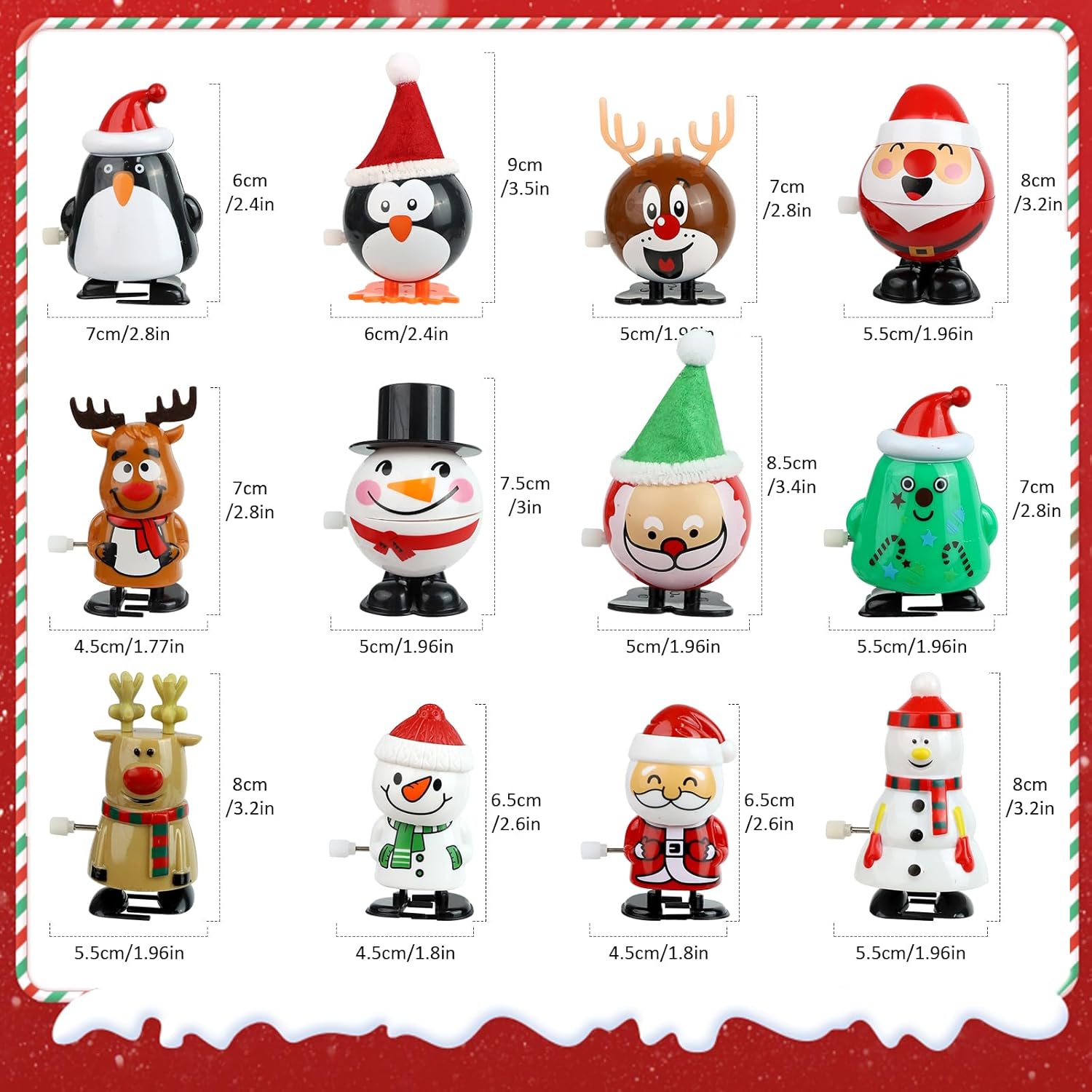 Divertimento Senza Fine: Ogni giocattolo a molla è azionato da un meccanismo a caricamento. Ruotando la chiave di carica, ogni personaggio compie una serie di movimenti come saltare, correre, annuire o scuotere la testa. Materiali di Alta Qualità: I nostri giocattoli natalizi sono realizzati in PVC di alta qualità, atossici e inodori, sicuri per bambini e animali domestici. Robusti e resistenti, non si rompono facilmente e durano nel tempo. Ogni giocattolo misura circa 7 cm, perfetto per essere maneggiato da bambini e adulti. Personaggi Decorativi Natalizi: Questa serie di decorazioni natalizie include 12 giocattoli decorativi con design diversi. Le statuette raffigurano personaggi classici come Babbo Natale, renne, pupazzi di neve e pinguini. Lavorazione Artigianale: Il design in stile cartone animato si combina con un'artigianalità raffinata per un aspetto impeccabile. Sono sicuri, lisci e piacevoli al tatto, facili da afferrare per i bambini, aiutando a sviluppare coordinazione, immaginazione e comunicazione genitore-figlio. Ideale per Calze Natalizie: Questo set di giocattoli meccanici natalizi è il regalo perfetto per i bambini. Adatto come dono natalizio, per riempire calze o sacchetti di caramelle, premi o incoraggiamenti, ma anche per Pasqua, Ringraziamento, compleanni e altre occasioni festive.