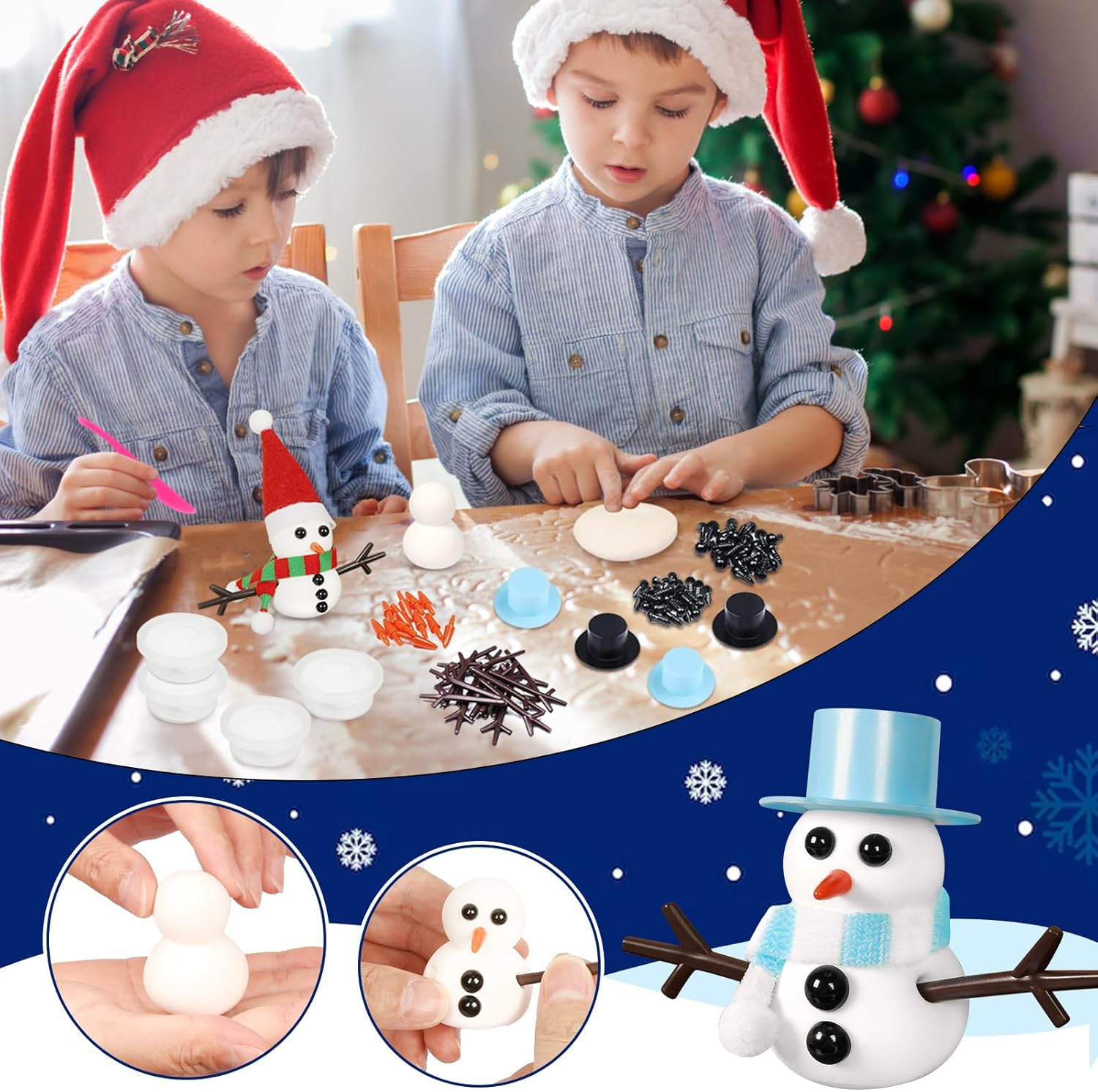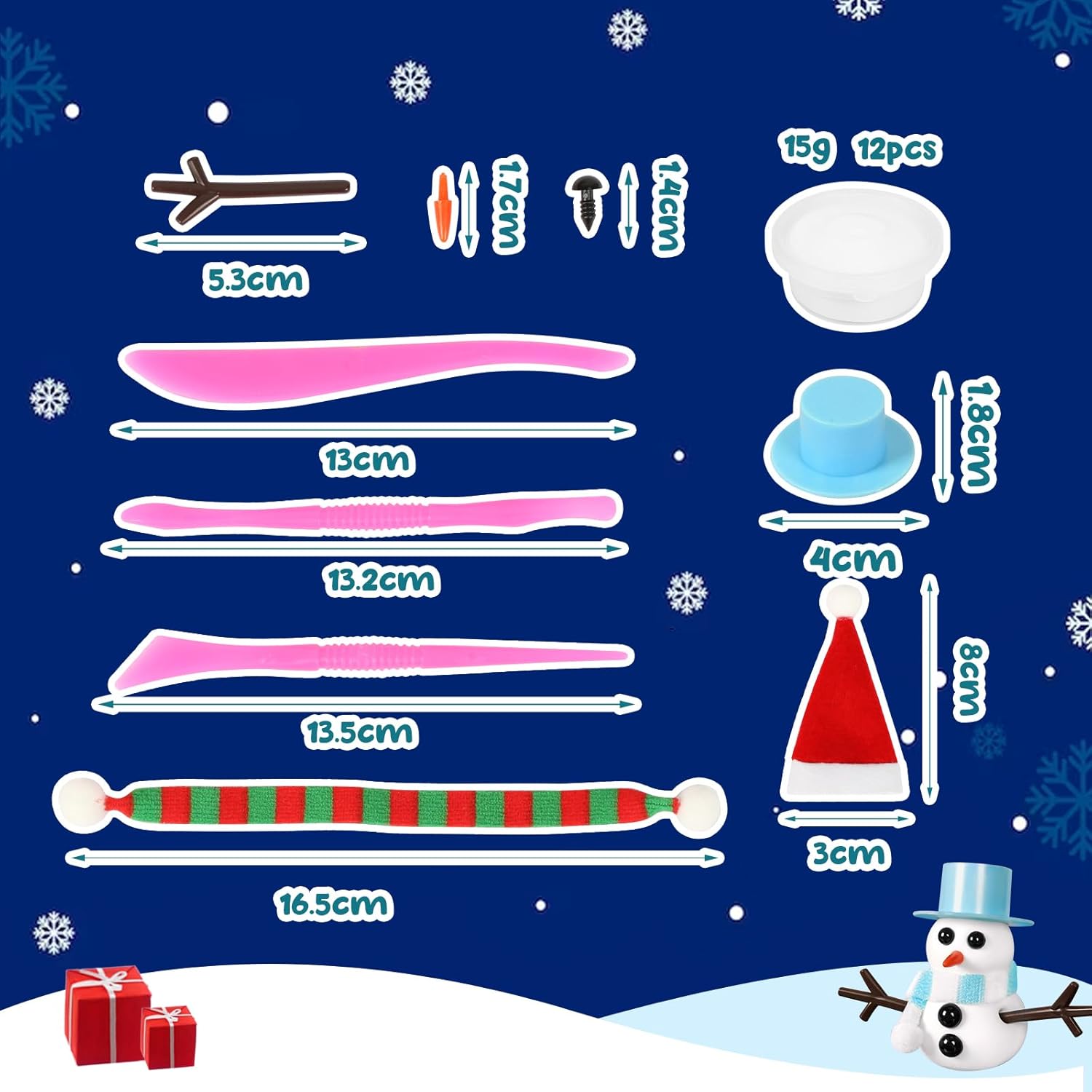 KIT PUPAZZO DI NEVE IN ARGILLA: Riceverai 12 scatole di argilla bianca, ciascuna del peso di 15 g (scatola non inclusa); 12 sciarpe a tema natalizio; 12 cappelli, 3 colori, 2 stili; un sacchetto di accessori decorativi per pupazzi di neve; 3 utensili da taglio; un'attività natalizia creativa per bambini! Argilla da modellare che asciuga all'aria: la nostra pasta da modellare che asciuga all'aria è morbida e facile da modellare, basta lasciarla all'aria aperta per alcune ore o giorni dopo aver finito la statuina del pupazzo di neve. L'argilla polimerica mantiene la sua forma dopo l'essiccazione e non si restringe, dando vita a un mini pupazzo di neve molto decorativo che può essere utilizzato come casa delle bambole, paesaggio in miniatura per davanzale, centrotavola e molto altro ancora! REGALO PER BAMBINI: L'argilla polimerica è un giocattolo sicuro e non tossico per bambini, un regalo creativo per bambini, perfetto come regalo per figlie, figli, nipoti e così via, come regalo di Natale, regalo invernale, regalo per feste Frozen. Lascia che scoprano la gioia del fai-da-te. LABORATORIO DI NATALE CREATIVO PER BAMBINI: Il set di plastilina natalizia può essere un giocattolo per i bambini durante la comunione, la cena, le riunioni di famiglia, che può promuovere la comunicazione dei bambini, migliorare gli hobby creativi dei bambini e allo stesso tempo esercitare le abilità manuali dei bambini, migliorare la destrezza e la coordinazione occhio-mano dei bambini e stare lontano da telefoni cellulari, videogiochi! UTILIZZO MULTI-SCENA: L'argilla da modellare del pupazzo di neve può essere utilizzata come decorazione per la porta degli elfi, può creare un paesaggio innevato in miniatura, per le ragazze che costruiscono una casa delle bambole; applicabile ad asili nido, scuole, corsi manuali, ecc.; può anche essere disposto in più scatole insieme, per formare un grande pupazzo di neve.