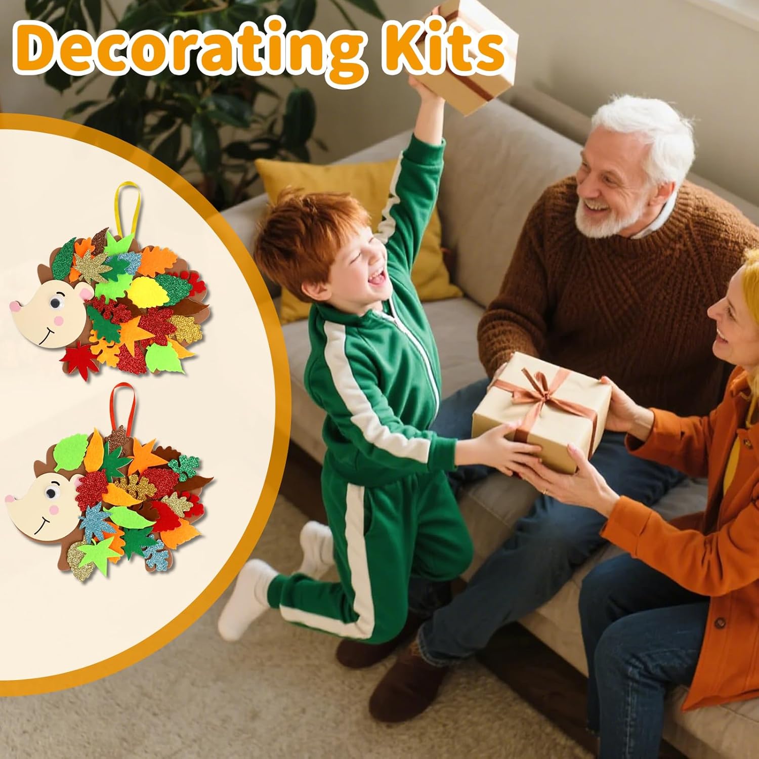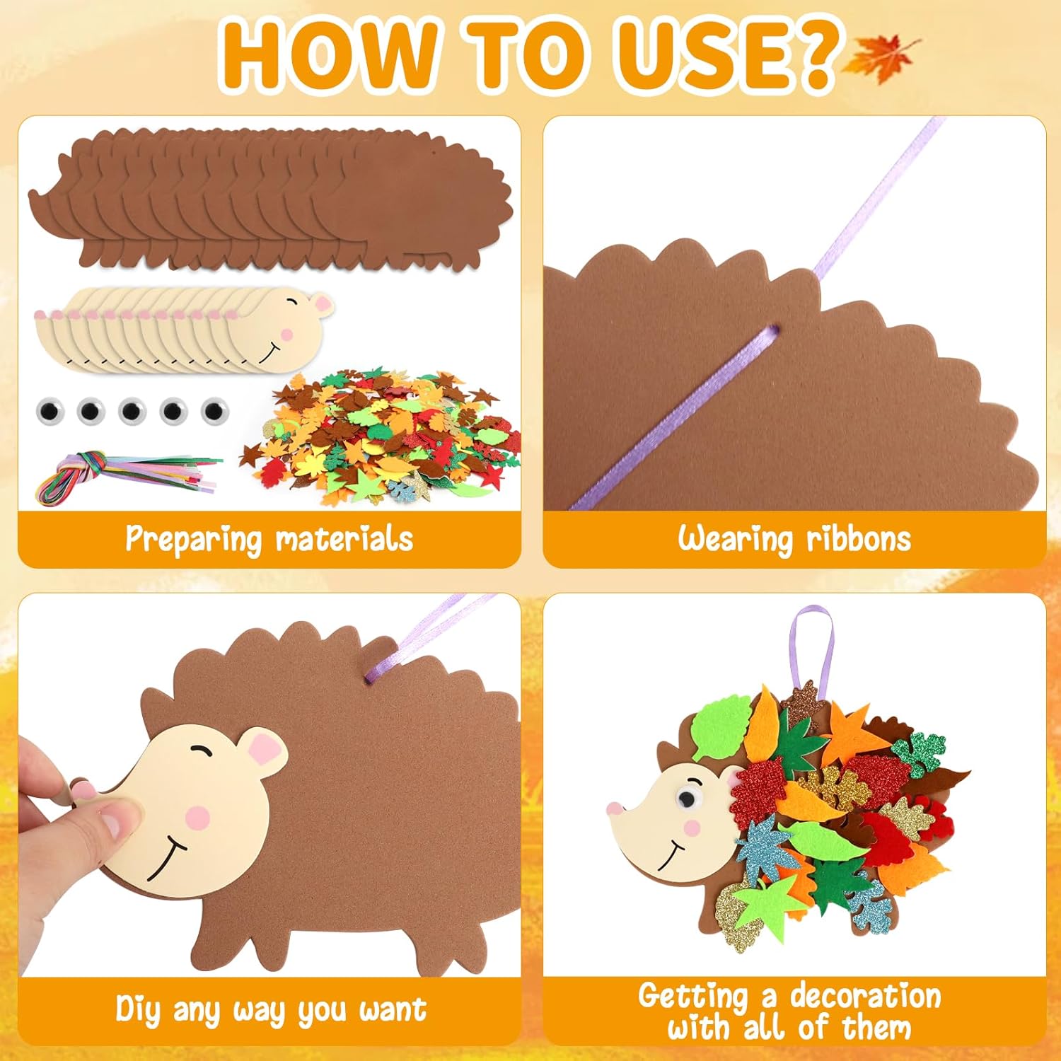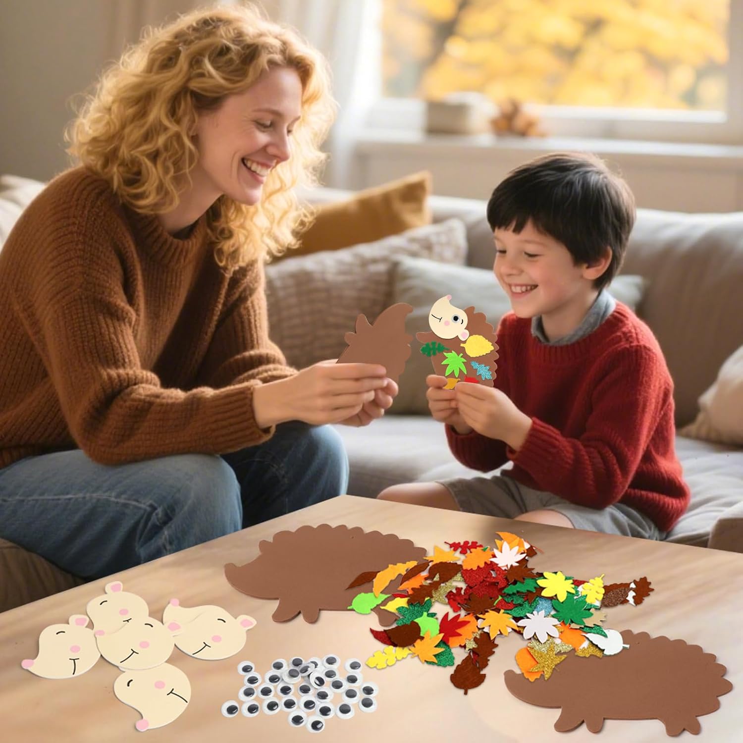 Kit per la Creazione di Ricci (Versione Bambini): Riceverai 12 corpi di riccio, 12 facce di riccio, 32 occhi, 230 foglie autunnali e 13 nastri colorati. Questo kit artigianale autunnale per ricci contiene tutto il materiale necessario per condividere il divertimento creativo con familiari e amici. Facile da Usare: Il kit per ricci autunnali include adesivi autoadesivi, facili da attaccare e staccare. Puoi attaccare foglie, occhi e facce sul riccio per comporre adorabili disegni di ricci. I piccoli ricci possono essere attaccati ovunque o usati come decorazioni appese durante l'autunno. Creatività Artigianale: Il kit per creare ricci autunnali è disponibile in vari colori, migliorando ulteriormente l'atmosfera autunnale. Piccoli accessori decorativi per ricci con motivi a paillettes rendono i ricci più vivaci e adorabili. Questo kit stimola la creatività dei bambini e sviluppa la loro capacità di riconoscimento dei colori. È il regalo perfetto per bambini per l'autunno, compleanni e Natale. Materiali di Alta Qualità: Il kit per la creazione di ricci autunnali per bambini è realizzato in materiale EVA, sicuro ed ecologico. La superficie è liscia, resistente all'usura e impermeabile, garantendo una lunga durata e soddisfacendo le esigenze dei lavoretti per bambini. Ideale per attività scolastiche autunnali, laboratori creativi autunnali e feste a tema animali autunnali. Utilizzo Versatile: Il kit per ricci autunnali per bambini è perfetto per Attività artigianali autunnali scolastiche, Decorazioni per l'aula in autunno, Addobbi per il raccolto autunnale, Pareti creative autunnali. Aggiunge divertimento alle attività di gruppo per bambini. I ricci includono cordini colorati per decorazioni appese durante feste autunnali, camerette dei bambini o il Ringraziamento, aggiungendo un tocco di colore.