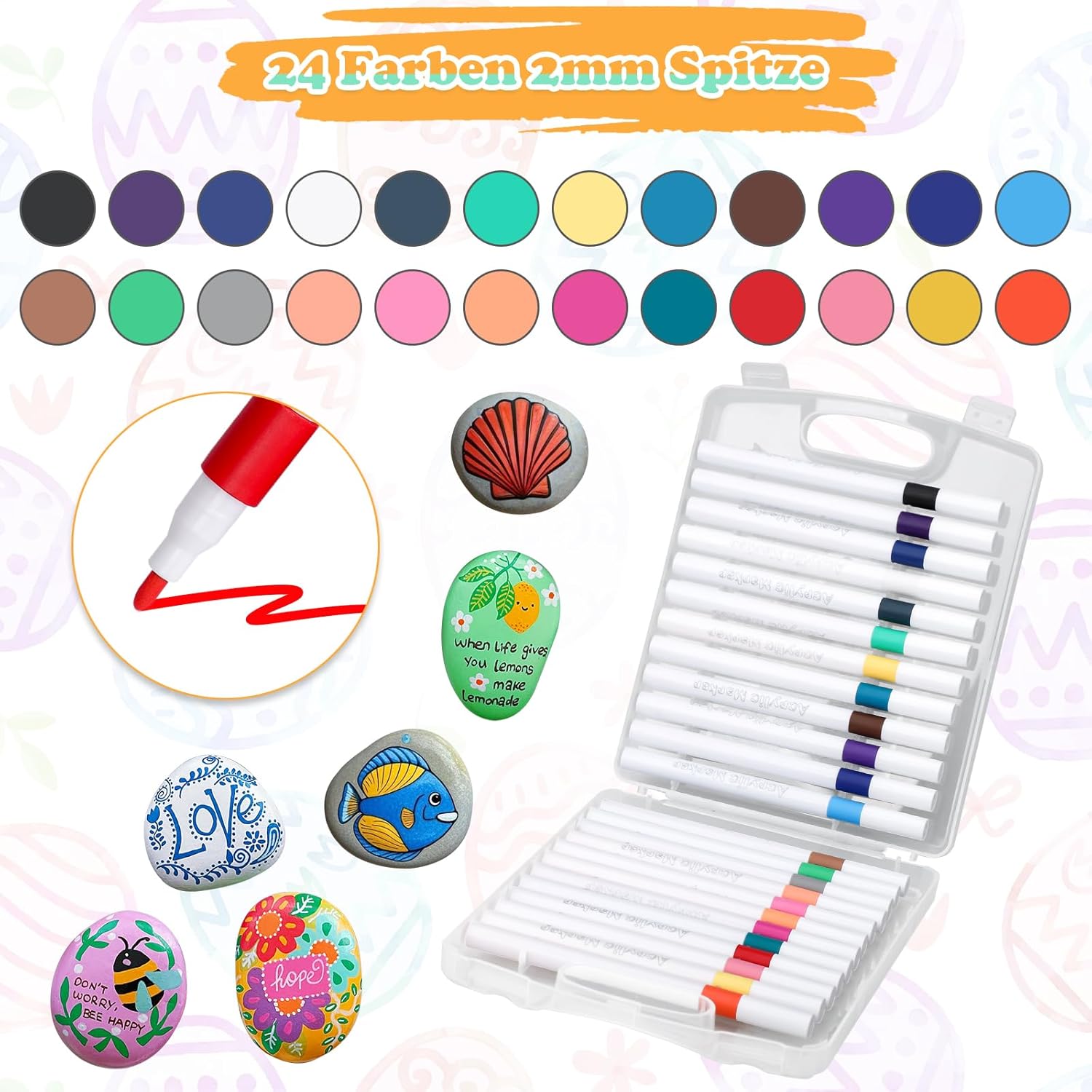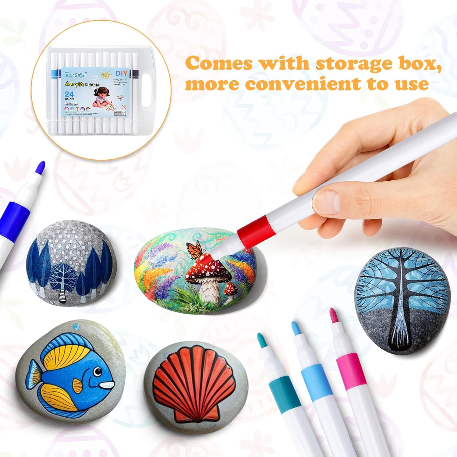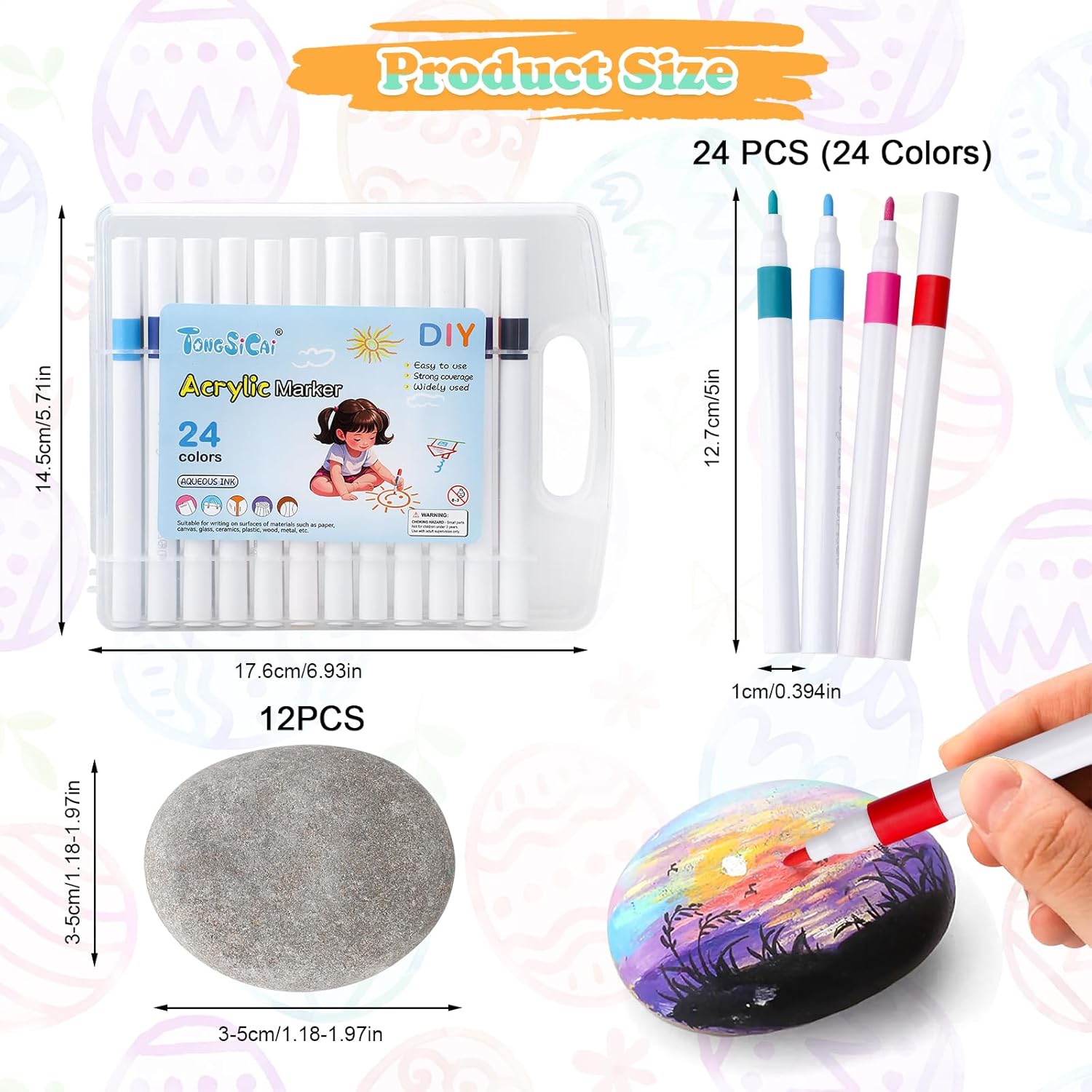 【Contenuto della confezione】: Questo set include 12 pezzi rocce naturali di disegno, da 3 a 5 cm, e 24 pezzi pennarelli acrilici per sassi. Questi pennarelli acrilici sono disponibili in 24 colori, sufficienti per l'uso quotidiano. (Nota: la superficie delle pietre naturali per dipingere potrebbe essere leggermente polverosa. Si consiglia di pulirla con un tovagliolo di carta o di risciacquarla e asciugarla prima dell'uso.) 【Kit fai da te perfetto】: I sassi piatti hanno una dimensione perfetta e sono dotati di 24 pezzi pennarelli per sassi, il che li rende perfetti per principianti ed artisti esperti. Un kit completo lo rende facile da usare. I ciottoli da pittura da 3-5 cm hanno una superficie piatta e liscia senza spigoli vivi, rendendoli ideali per la pittura. 【Facile da usare】: I pennarelli per disegno inclusi sono dotati di una comoda custodia. I pennarelli offrono un'eccellente copertura del colore con tonalità ricche e vivaci. Impermeabili, resistenti alla luce e ad asciugatura rapida, sono perfetti per creare opere d'arte di lunga durata su pietra, legno, ceramica, vetro, plastica, ecc. 【Materiali naturali】: I pietre da dipingere sono realizzati con vere pietre piatte. I pietre piatte per pittura che riceverete sono di forma ovale e hanno una superficie piana. Ogni pietre piatte per la pittura è naturale e unico. Il loro colore, forma e dimensione variano leggermente. Sono ciottoli perfetti per dipingere. 【Regalo ideale】: Che si tratti di una pausa creativa dalla vita quotidiana, di una pittura terapeutica o di un regalo speciale, questo set di dipingere sassi è perfetto. Questo set non solo offre divertimento, ma favorisce anche il relax. Questo set è perfetto come regalo di compleanno, regalo di Natale o come souvenir.