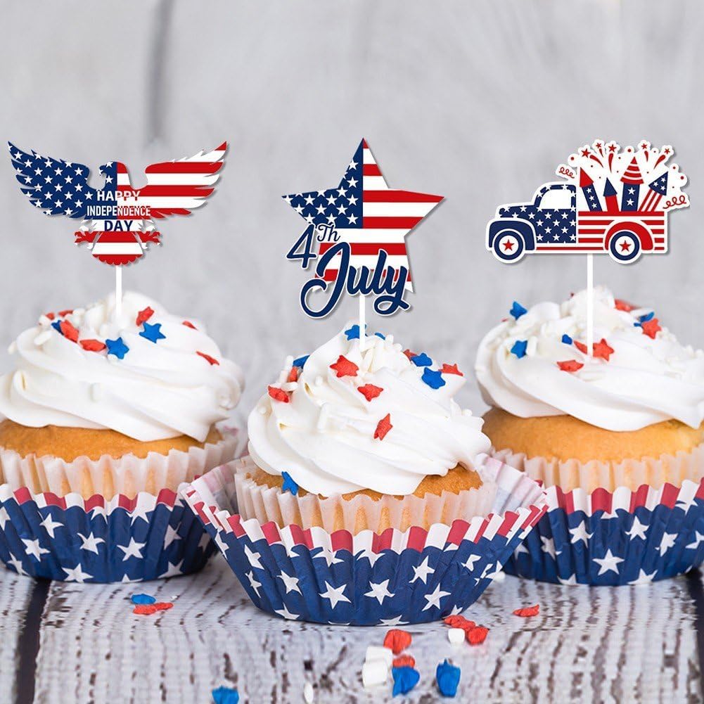 Decorazione per dessert con bandiera USA: vengono utilizzati stuzzicadenti per cupcake per una cerimonia di festa patriottica o qualsiasi altra festa a tema americano. Plettri per cupcake con bandiera americana: aggiungono l'atmosfera del Giorno dell'Indipendenza, particolarmente adatti per la festa a tema del Giorno dell'Indipendenza. Scelte della torta del Giorno dell'Indipendenza: possono abbinare diversi stili di torte per rendere le tue torte più attraenti. puoi applicarli anche per gelati, frutta, biscotti e altri dessert. Topper per cupcake del Giorno dell'Indipendenza: realizzato in materiale stabile, durevole e robusto per un uso prolungato. il bastoncino è liscio, non fa male alle mani, è facile da tenere. Toppers cupcake del 4 luglio: sono fatti di carta, che può essere utilizzata a lungo.