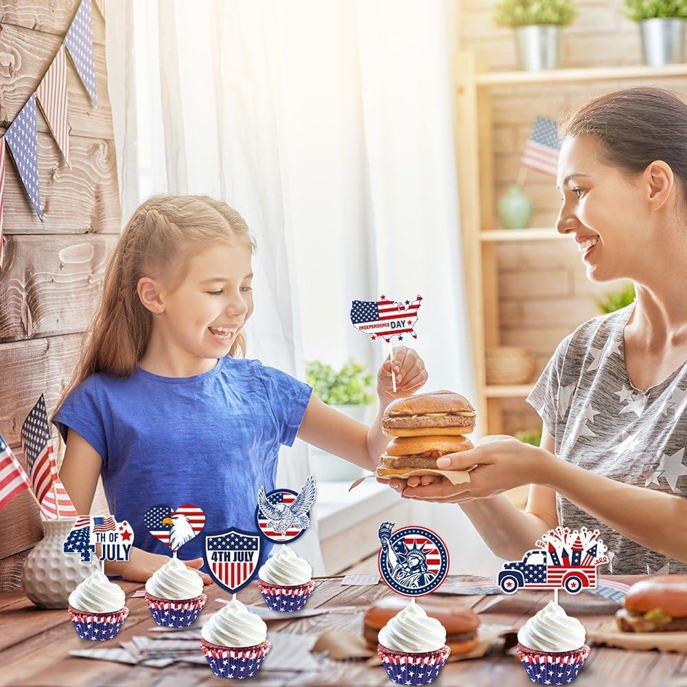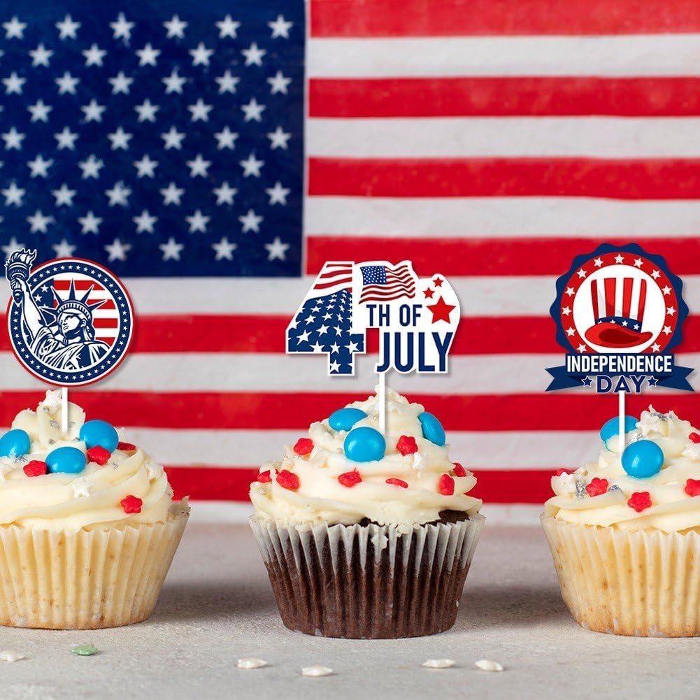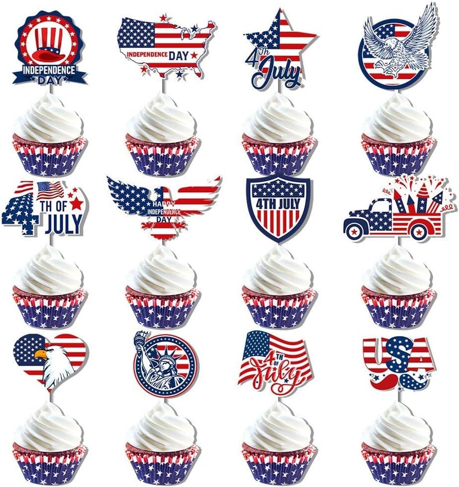 Topper per cupcake del Giorno dell'Indipendenza: realizzato in materiale stabile, durevole e robusto per un uso prolungato. il bastoncino è liscio, non fa male alle mani, è facile da tenere. Decorazione per dessert con bandiera USA: vengono utilizzati stuzzicadenti per cupcake per una cerimonia di festa patriottica o qualsiasi altra festa a tema americano. Toppers cupcake del 4 luglio: sono fatti di carta, che può essere utilizzata a lungo. Scelte della torta del Giorno dell'Indipendenza: possono abbinare diversi stili di torte per rendere le tue torte più attraenti. puoi applicarli anche per gelati, frutta, biscotti e altri dessert. Plettri per cupcake con bandiera americana: aggiungono l'atmosfera del Giorno dell'Indipendenza, particolarmente adatti per la festa a tema del Giorno dell'Indipendenza.