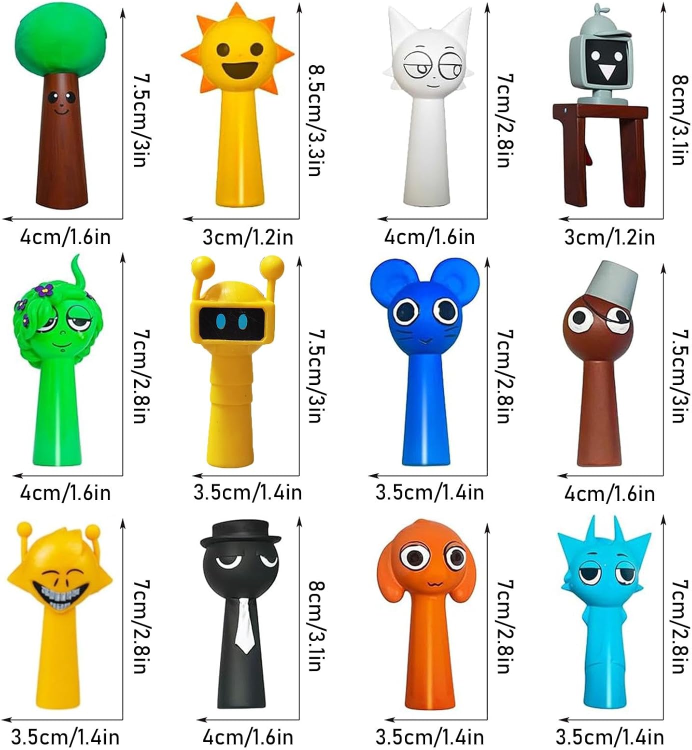 Bambole Giocattolo: Queste figure Sprunki dal design vivace sono ispirate ai personaggi dei giochi più popolari e possono portare colore e gioia in qualsiasi casa. I colori vivaci e i graziosi design delle pupazzi sprunki catturano perfettamente il fascino dei cartoni animati Materiali di Alta Qualità: Materiali sicuri Queste sprunki compleanno giocattolo sono realizzate in materiale PVC di alta qualità, atossico e inodore. Le sprunky personaggi sono grandi circa 6-7 cm, adatte ai bambini e i materiali sono sicuri, quindi non devi preoccuparti della salute del tuo bambino Decorazione Versatile: Il set di sprunki giochi contiene 12 diverse figure Sprunki, perfette per essere utilizzate come decorazioni da scrivania per creare un'atmosfera accogliente. Il set di sprunki figuren bambole è perfetto per le feste di Natale o come decorazione festiva per il soggiorno o l'ufficio Sorpresa per Bambini: Queste set di figure Sprunki sono disponibili in una bellissima confezione regalo e sono un regalo ideale per bambini di età superiore agli 8 anni e per adulti. Il set di pupazzo sprunki è una grande sorpresa per bambini e bambine che amano giocare e collezionare Regalo Ideale: Le sprunki action figures sono perfette come regali di compleanno per bambini e bambine. Perfetto per amici, studenti, laureati e colleghi, e può anche essere usato come regalo per vari festival. Tutti saranno sorpresi e felici di ricevere questo regalo unico sprunki toys per compleanni, feste, Pasqua e altre occasioni