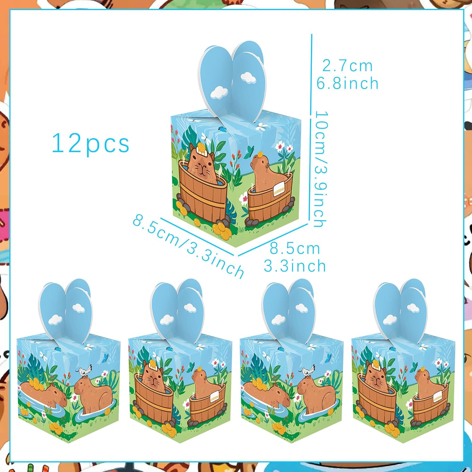 Riceverai: 12 X Scatole per Feste a Tema Capibara Decorazioni per Feste Capibara con vari stili decorativi ispirati a diverse idee tematiche per feste L'accessorio per feste Capibara utilizza una gamma ampia di colori vivaci per stimolare l'immaginazione e la creatività dei bambini, trasportandoli nel mondo dei Capibara Le decorazioni per baby shower Capibara sono adatte a tutti i tipi di feste. Possono essere utilizzate come decorazioni per compleanni, baby shower, feste a tema animali, feste a tema Capibara e altri eventi celebrativi I nostri articoli per feste Capibara creano un'atmosfera unica e portano gioia alla tua celebrazione