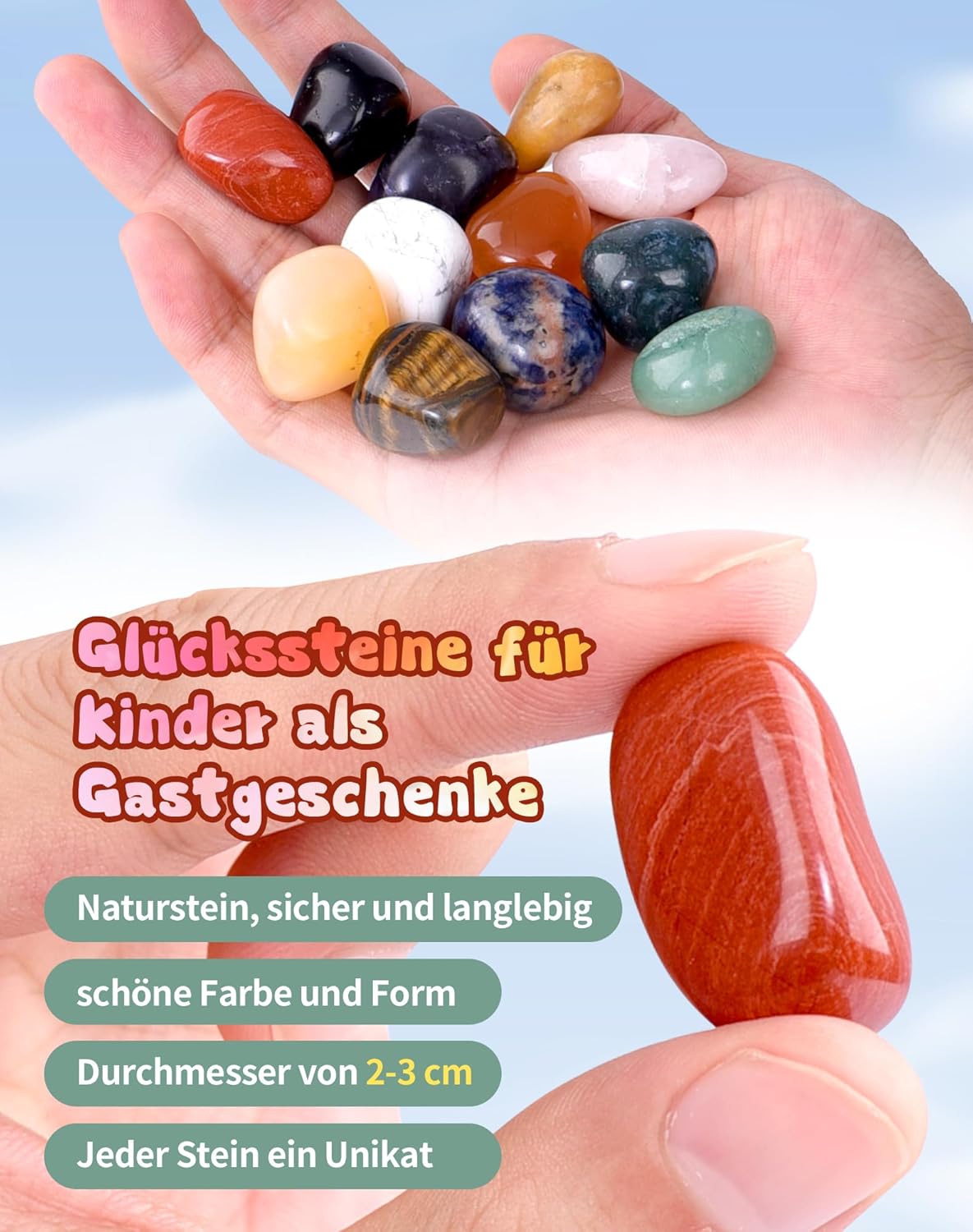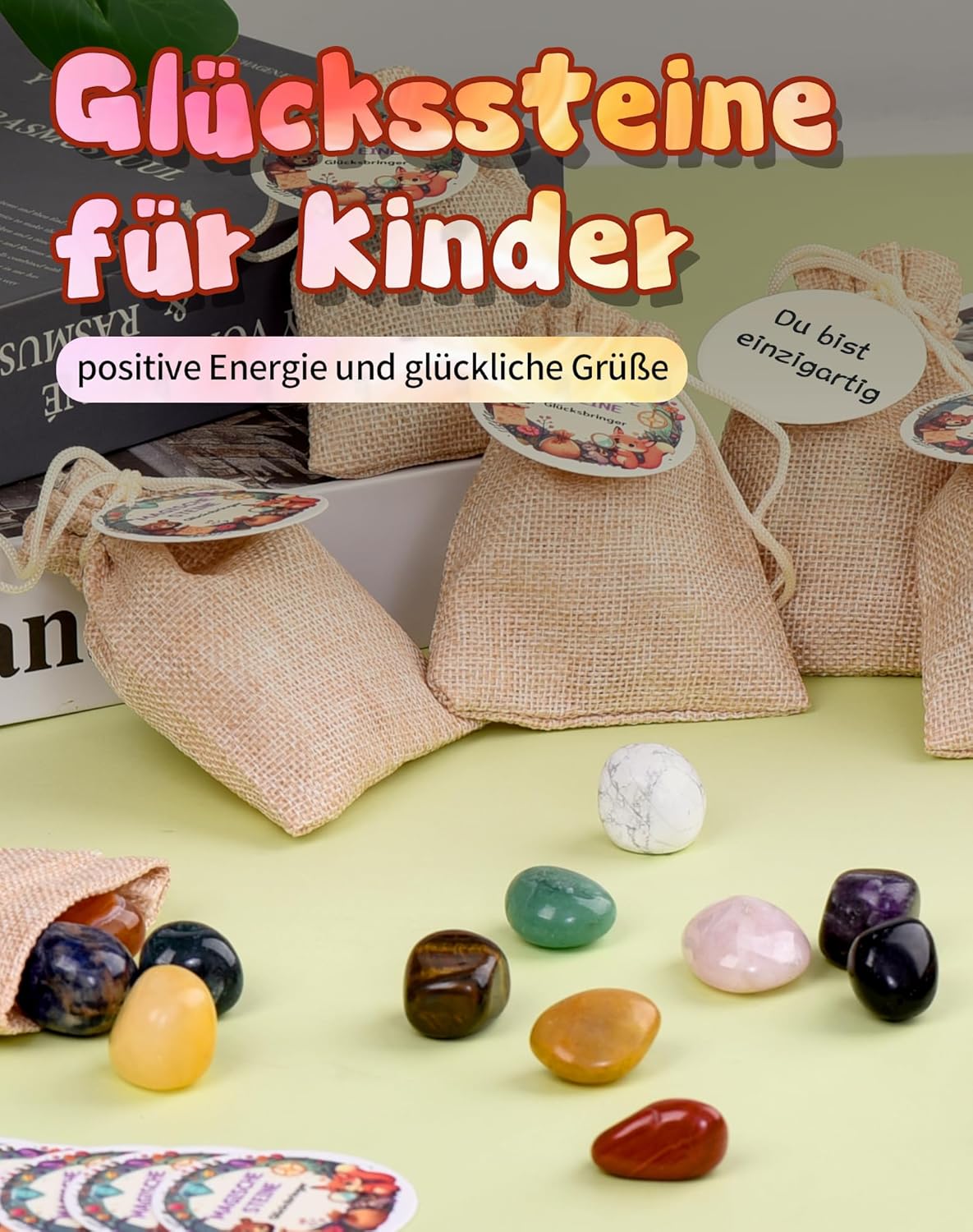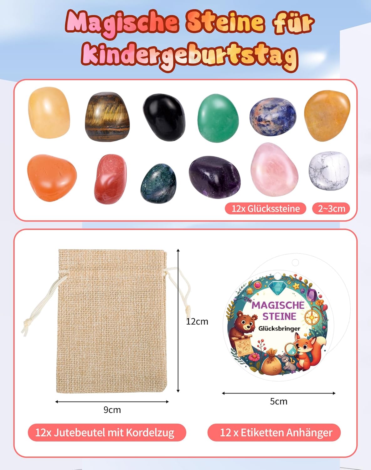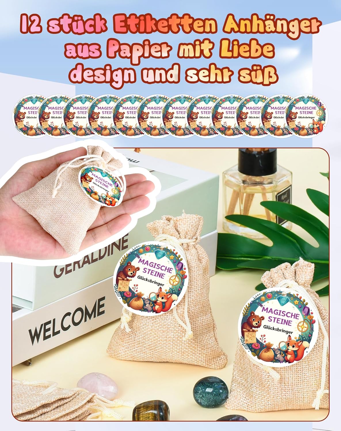 【Regalo per gli ospiti della borsa da festa per bambini】 La festa per bambini è dietro l'angolo e non sai cosa regalare ai tuoi piccoli ospiti? Il nostro set di pietre portafortuna per bambini contiene 12 pietre portafortuna per bambini, 12 sacchetti di iuta con cordoncino e 12 graziosi ciondoli rotondi con animali; questo set può soddisfare le tue diverse esigenze, sia come decorazione per una festa, souvenir di compleanno o regalo di Natale, può portare una sorpresa speciale per i tuoi bambini. Puoi scrivere il nome del bambino e la tua benedizione sull'etichetta e regalarla ai tuoi piccoli ospiti per esprimere i tuoi auguri in occasione di feste o compleanni, è il miglior regalo per tuo figlio.,Pietre naturali con colori ricchi: le pietre del coraggio per bambini con un diametro di 2-3 cm sono tutti prodotti naturali, sicuri e durevoli; A causa della natura delle pietre naturali, le dimensioni, il peso e i colori possono variare; questa varietà rende ogni pietra portafortuna unica.,Graziosi ciondoli con animali: il set di pietre portafortuna contiene 12 bellissimi ciondoli con animali della foresta in carta con un diametro di 5 cm, che possono essere utilizzati come decorazione o come ciondolo quando appesi alla borsa; le etichette rendono il set Pietre Portafortuna ancora più adorabile e fanno amare ancora di più questo regalo speciale ai bambini.,Regalo perfetto per i bambini: le pietre preziose per bambini sono perfette per feste di compleanno, feste con animali del bosco, gioielli portafortuna per bambini, souvenir di compleanno, pietre magiche, riempitivi per calendario dell'Avvento, regali di Natale, sacchetti per feste di comunione e altre occasioni; Inoltre, le pietre portafortuna possono portare gioia e sorprese ai bambini come decorazioni per le feste
