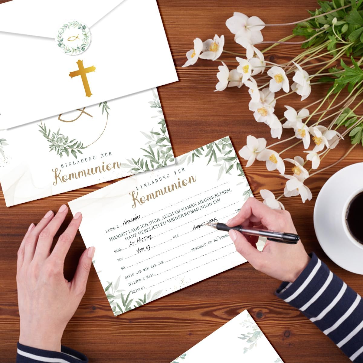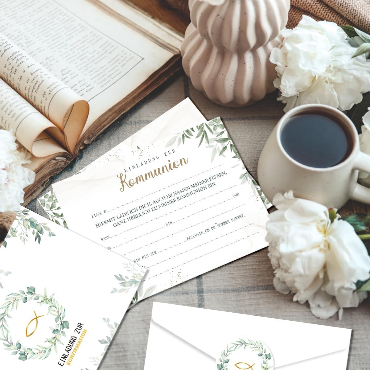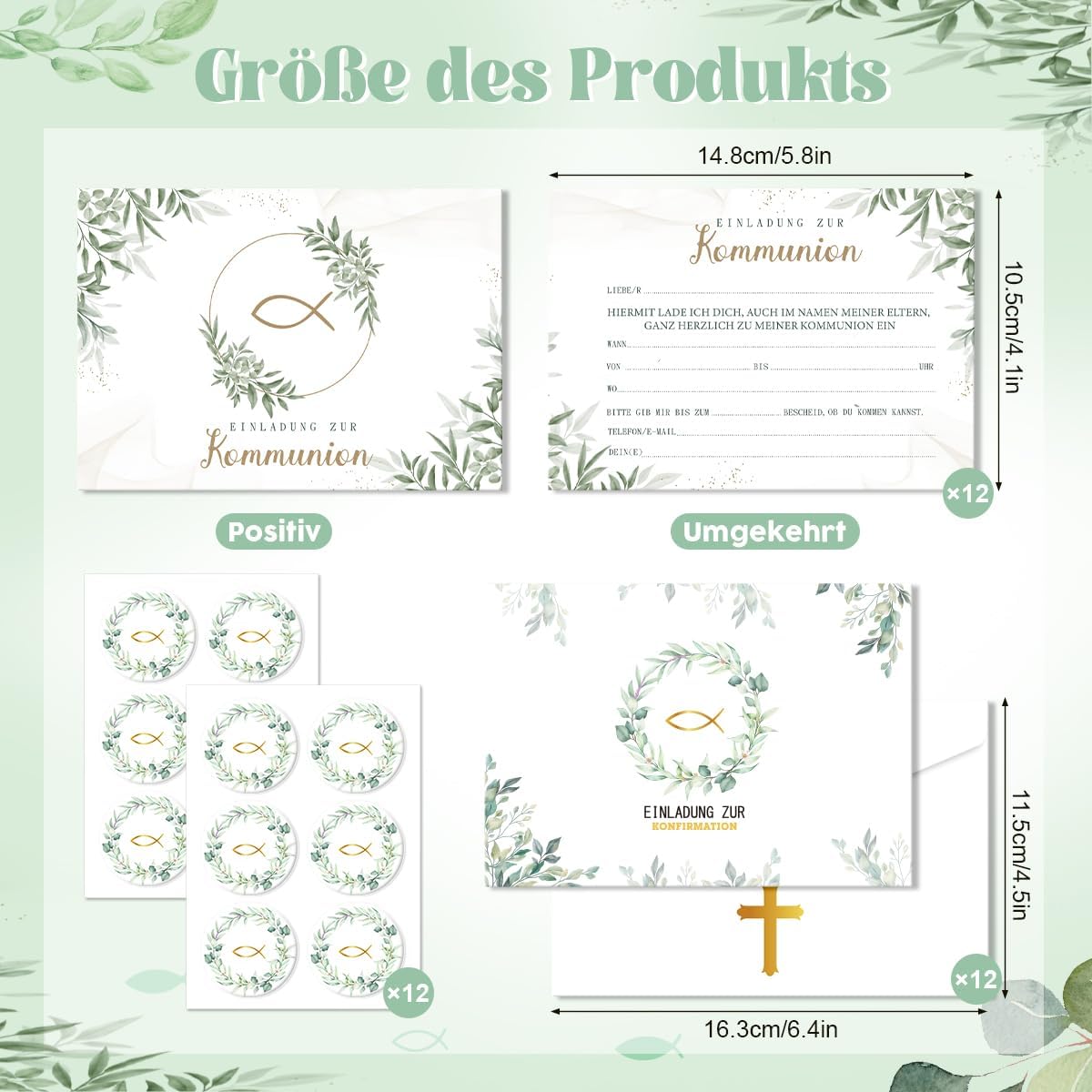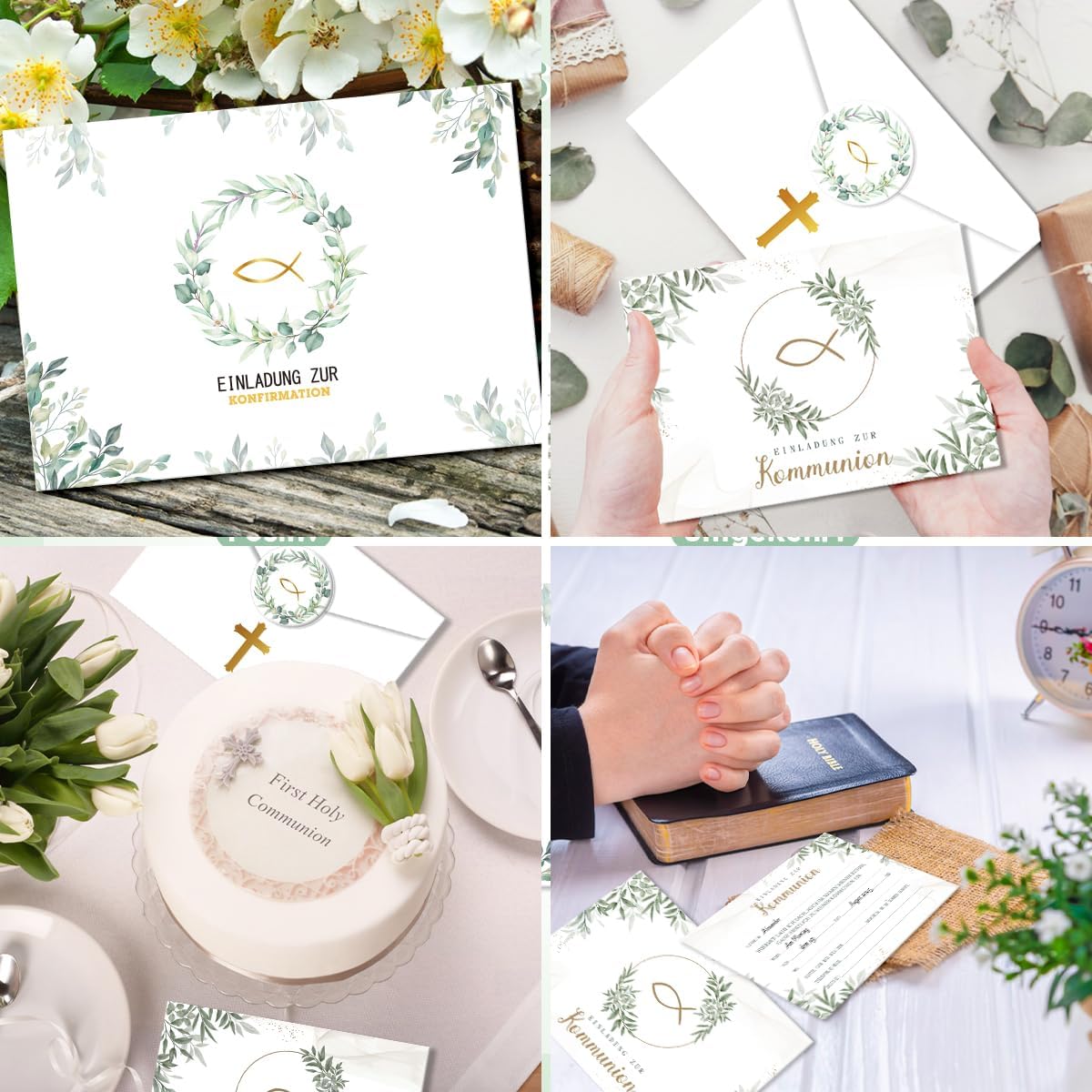Biglietti di invito per comunione: riceverete 12 inviti per comunione con buste adesive, che possono soddisfare la vostra comunione, prima comunione per bambini, familiari o amici. Alta qualità: i nostri biglietti d'invito per la comunione sono realizzati in carta di alta qualità, la carta è dura con disegni colorati su entrambi i lati, non si stropiccia facilmente, chiaramente stampata e squisitamente bella. Design per comunione con pesce eucalipto: l'invito presenta un bel pesce comunione ed eleganti elementi a corona, con motivo a croce effetto bronzante e scritte per comunione per creare un'atmosfera sacra. Facile da compilare: i campi di testo prefabbricati con spazi vuoti sono facili da capire, per inviare i biglietti di invito alla comunione più velocemente, i biglietti hanno un testo vuoto sul retro con le informazioni più importanti da compilare. Perfetto per la comunione: biglietti di invito per la comunione, adatti come biglietti di invito per feste di comunione, prima comunione, decorazione per ragazzi e ragazze, ecc. Questi biglietti sono perfetti anche per battesimi e cresime e sono quindi una buona scelta per ogni occasione speciale.