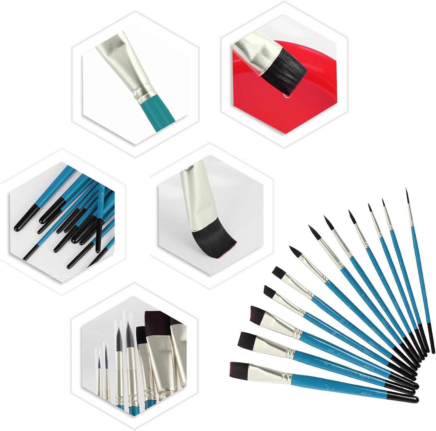 Ideale per bambini, principianti, studenti, artigiani e artisti professionisti. Facile da lavare con acqua corrente e acqua calda. Quindi utilizzare le dita pettinare delicatamente verso il basso. Posizionamento verticale per l'essiccazione 6 pennelli con manico in legno, per varie esigenze di pittura e colorazione, come pennello piatto, pennello per liner, pennello obliquo. Soddisfa tutte le esigenze di pittura, dettaglio, illustrazione e rivestimento Ogni confezione viene fornita con 12 pennelli per bambini: pennello piatto, pennello a punta rotonda, pennello a punta obliqua, pennello a punta appuntita. Leggero e facile da trasportare Pennello professionale adatto per pittura su viso e corpo, olio, pittura ad acquerello, acrilico, pittura a guazzo, pittura a stencil, pittura a scala, pittura su roccia Realizzato in legno e setole di nylon, buon assorbimento d'acqua, facile da colorare